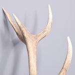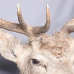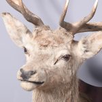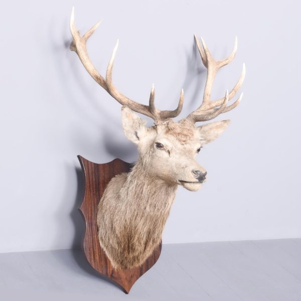 Circa 1980s. A large mounted deer head. The head with 12-point antlers (Royal) with realistic glass eyes mounted on a stylish heraldic shaped shield.