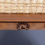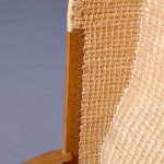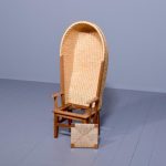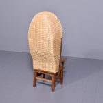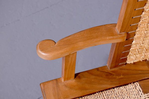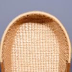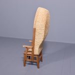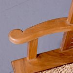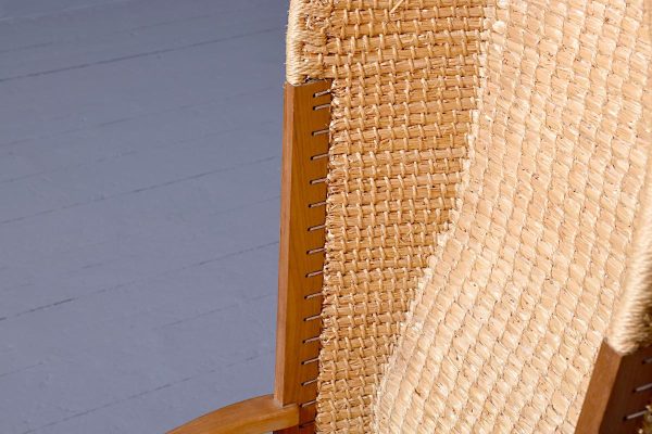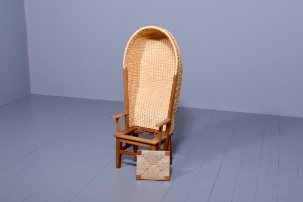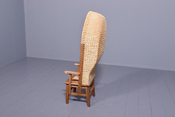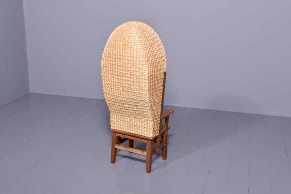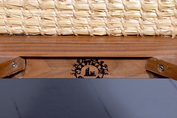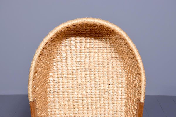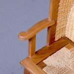 Circa 1950. The cowled woven pal straw back and open arms above a drop-in bent grass cord seat on square tapering supports linked by stretchers.