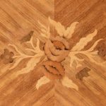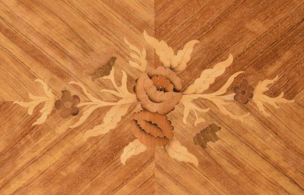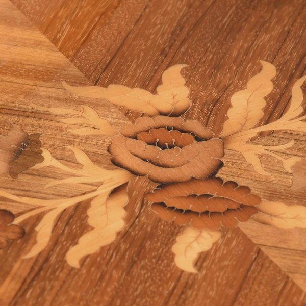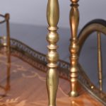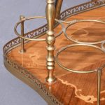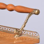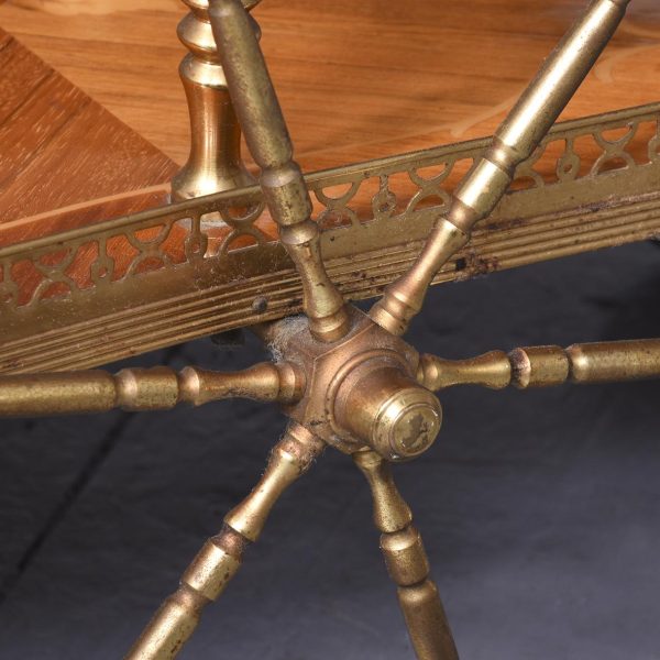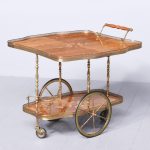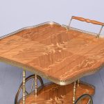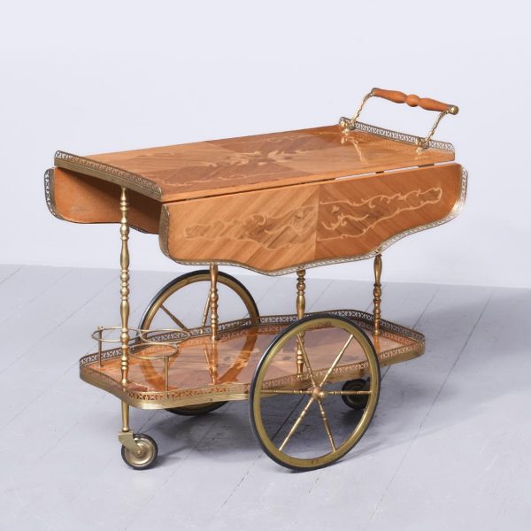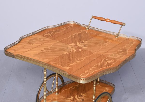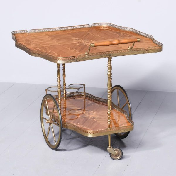 Circa 1970s. A mid-century walnut and inlaid Sorrento two tier trolley. Butterfly shaped top with various inlays and pierced gallery with brass and wood handle. The lower tier well shaped, supported on four cast brass turned uprights, with wrap around pierced gallery. The trolley rests on two large brass spoked, with 2 smaller ones beneath the lower tier.