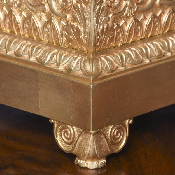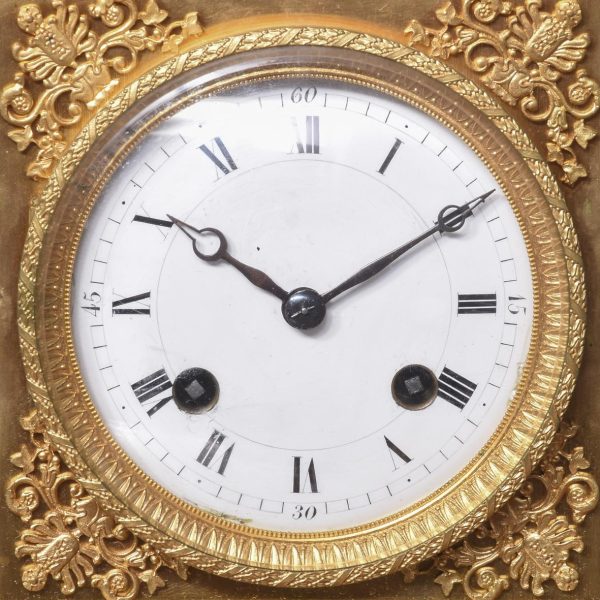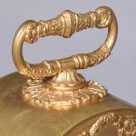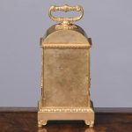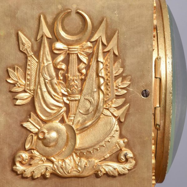 Circa 1820. A Swiss Pendule d’officier 19th century ormolu clock (an early travelling clock). The case with a hinged carrying handle over a domed top. The sides with applied cast Ottoman-related motifs and flags. The hinged Bezel front opening to reveal a white enameled dial with Roman numerals with a minute’s track rail. The rear open to reveal two train movements with platform escapements and striking on two bells.