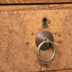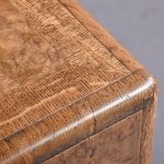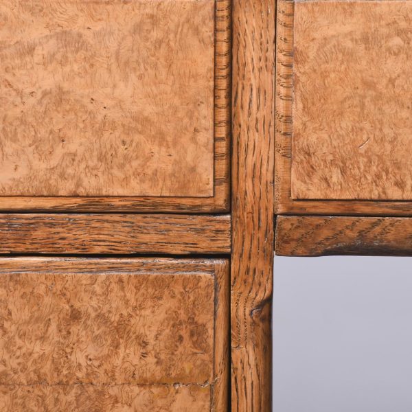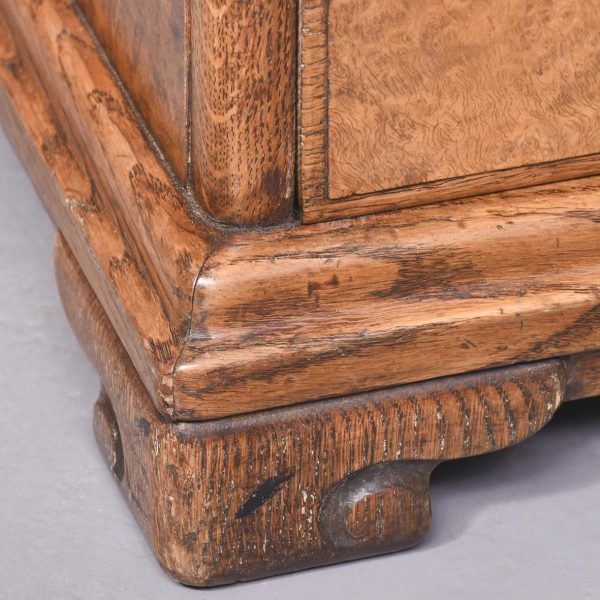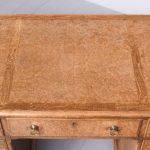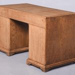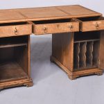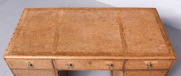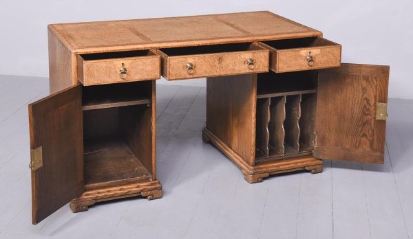 Circa 1910. A stylish the free standing pollard oak pedestal desk by ’ Whytock & Reid of Edinburgh’, the rectangular top with 3 pollard oak panels separated by quarter sawn oak bands, the rounded fore-edge with visible dove tails, the front with a long drawer flanked by a pair of shorter drawers each with brass conical back plates and a circular ring pull, beneath the 2 short drawers there is pair of cupboards with pollard oak doors, one with a single shelf, the other is fitted out for files, with a moulded frieze the desk rest on 8 stylish squat carved bracket feet typical of ‘Whytock & Reid’.