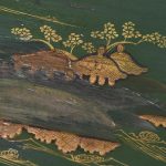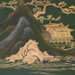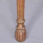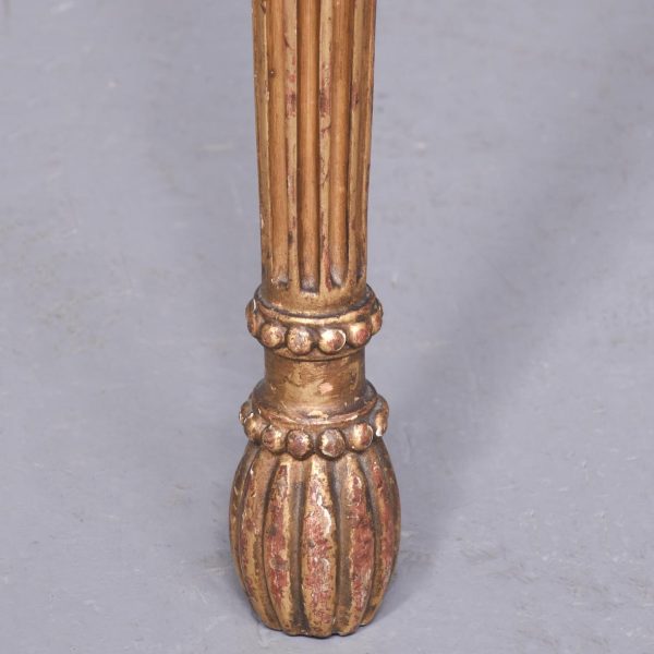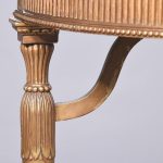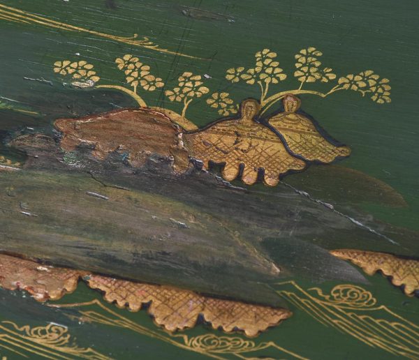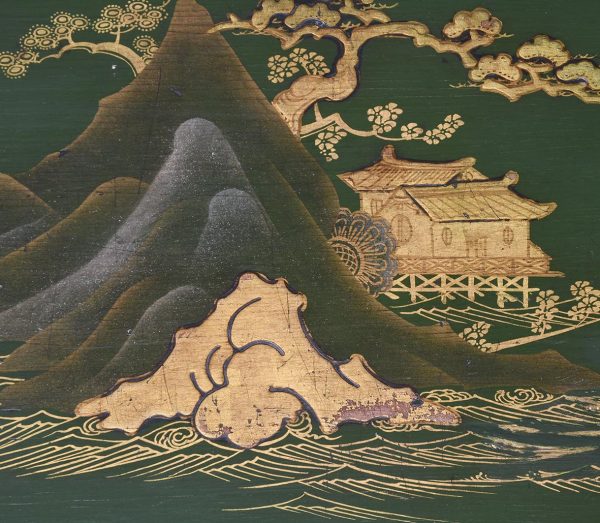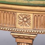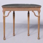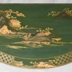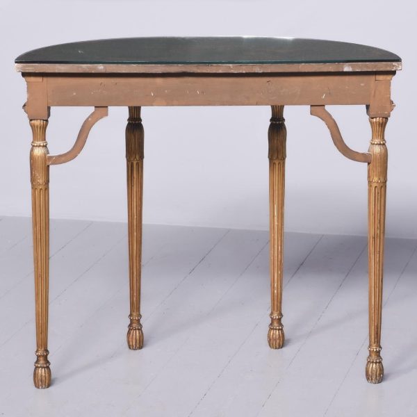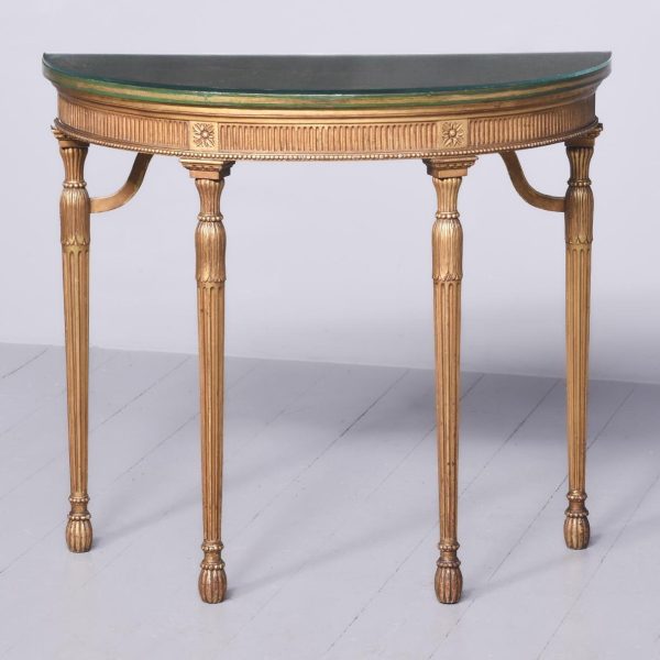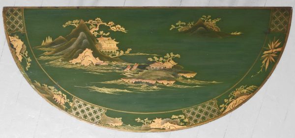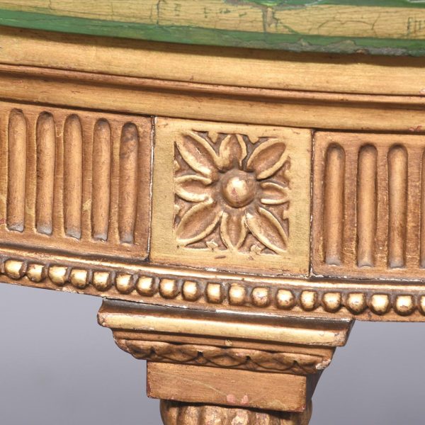 Circa 1900. A stylish Adam and chinoiserie style demi lune table. The top decorated in the Chinoiserie style, including sea, mountains and houses, with a green background with a broad border lined out in gold with further motifs, top with a removable glass. The painted fore edge and frieze with classic Adam style pattern, with reeding and carved and gilded flower, with a fine beading beneath. The table rests of four classic Adam style legs with capitals, fluting, and downward facing foliate carving, fluted tapering legs, with turning at the bottom, resting on four elongated fluted toes.