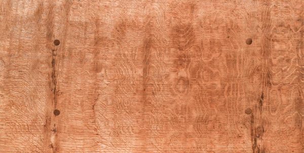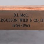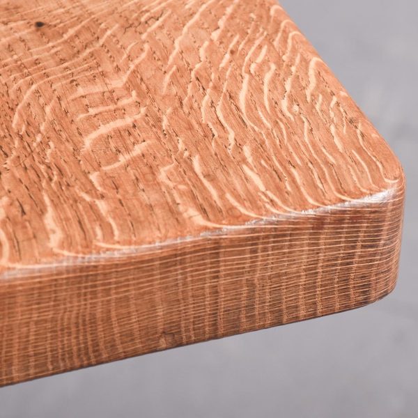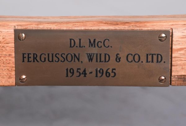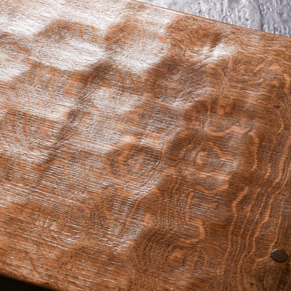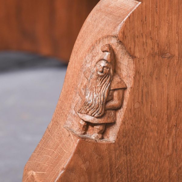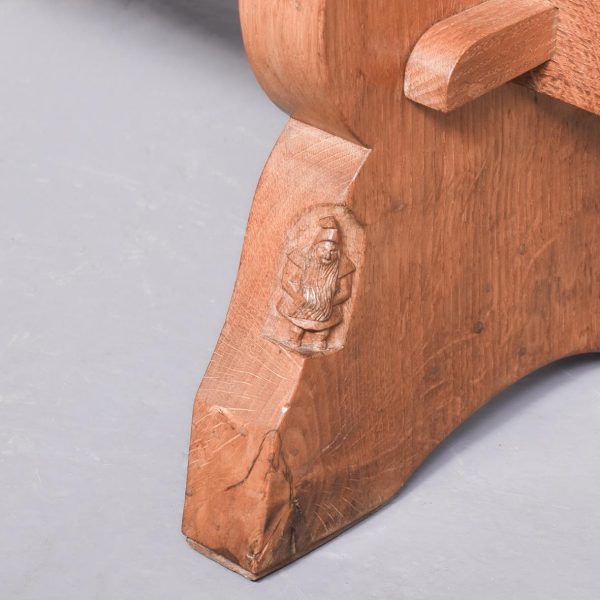 Adzed oak coffee table/stool by Thomas (Gnomeman) Whitaker. The rectangular top with exposed pegs on shaped trestles with a shaped cross stretcher with a carved gnome signature on one side. All in lovely cross-cut figured oak, now bearing a brass label indicating it was presented in 1965, possibly the year it was made.