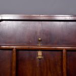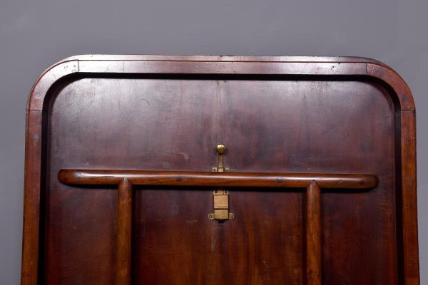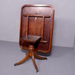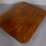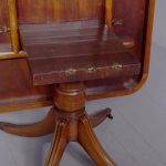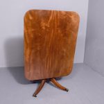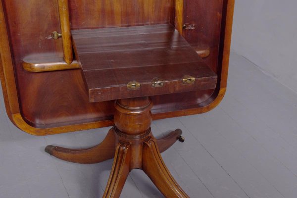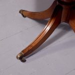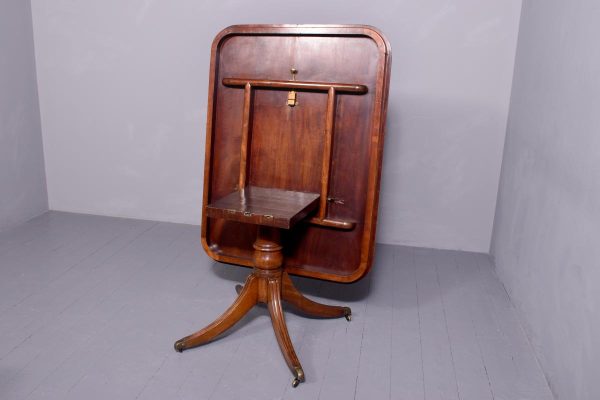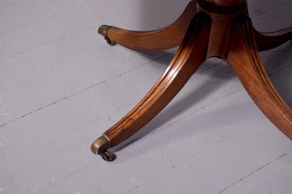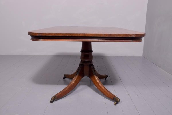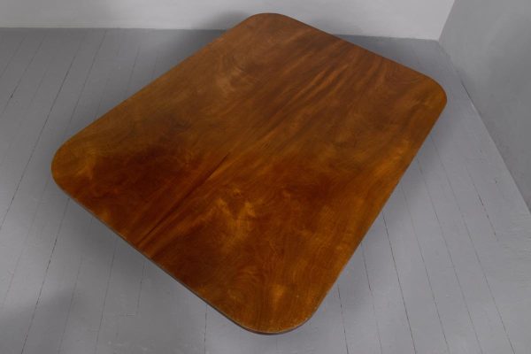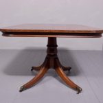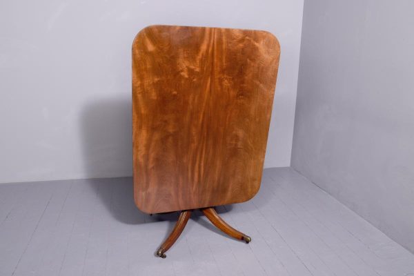 Circa 1810. An early Regency mahogany rectangular breakfast table with solid top in book matched mahogany, with rounded corners and a very stylish frieze, the table rests on a very large block with the original cast brass clasp for locking the table in position, supported on a bulbous stem, issuing four saber legs, terminating with a cast brass block with the original castors.