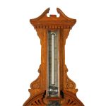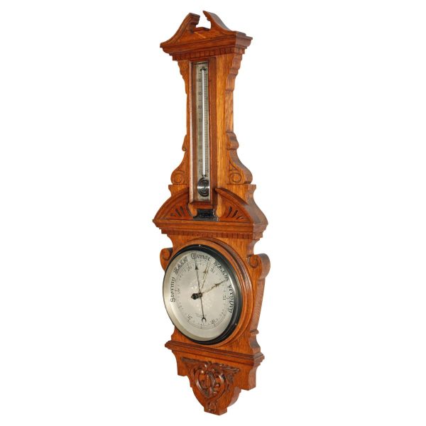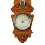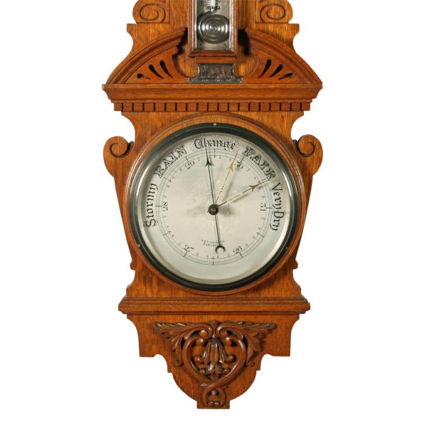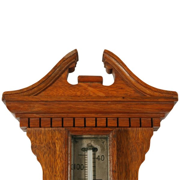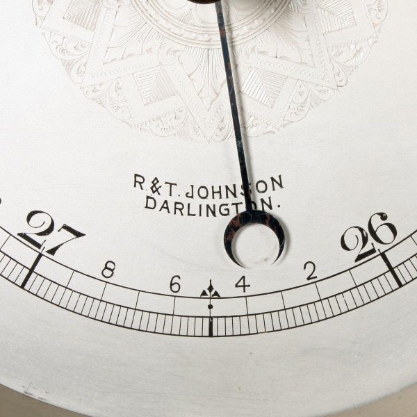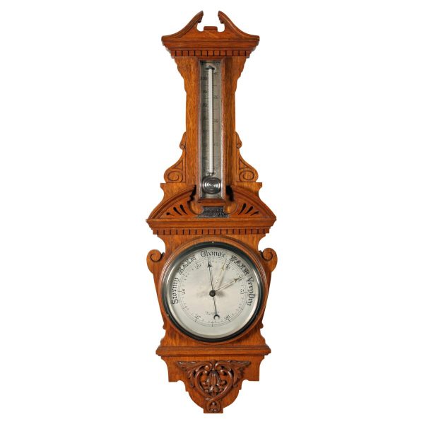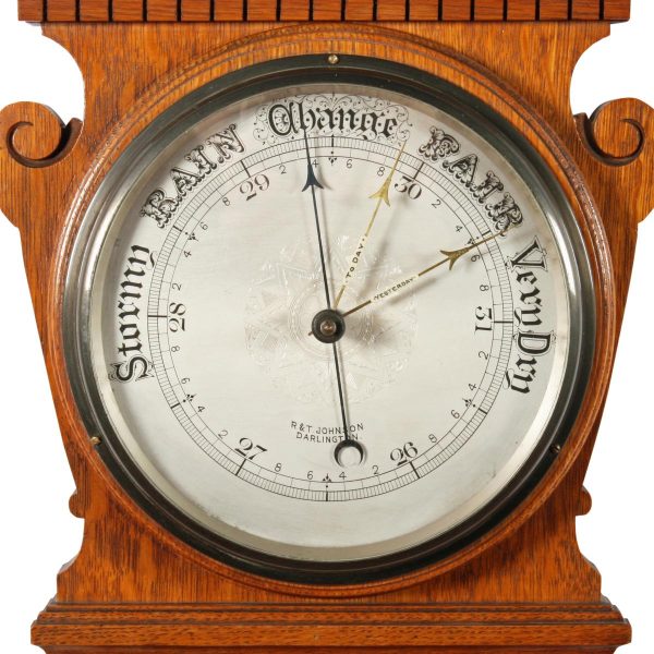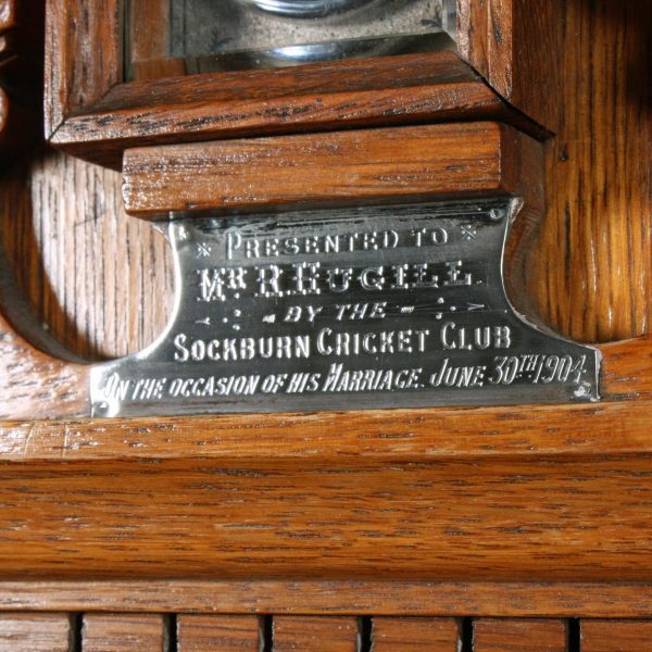 A dated Edwardian oak cased aneroid barometer, the well-carved base including stylish architecturally pediment with carving on the shaped body, including full and scratch carving, the thermometer with an unusual curled snail shaped reservoir, in a glass fronted panel, the silverised dial has the barometric reading and the retailer’s name ‘R & T Johnson Daarlingtonn’, unusually this barometer has two extra arms, one to show the pressure over days, with a presentation plaque – ‘Presented to Mr R Hugill by the Sockburn Cricket Club on the occasion of his Marriage June 30th 1904’.