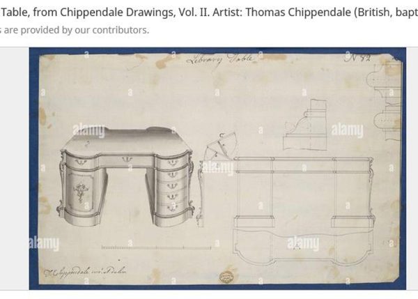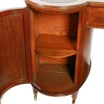 Circa 1890, an unusual and rare late 19th century ‘Hour Glass’ shaped mahogany partner’s desk, the shaped top with insert black and gold tooled hide, the oval pedestals have four bow fronted drawers each and a single drawer over the kneehole, they are mahogany lined, have figured mahogany fronts with chequered inlays and gilt brass drop handles, the opposite side of the desk has two full height bow hinged doors, with a single shelf, resting on eight tapering legs, with box wood line inlay and brass cups and castors. The pedestals have figured mahogany sides, decorated with chequered bands of inlay. The design of the desk resembles one found in ‘The Gentleman and Cabinet Maker’s Directory by Thomas Chippendale, a library table No: LXXX’.