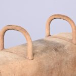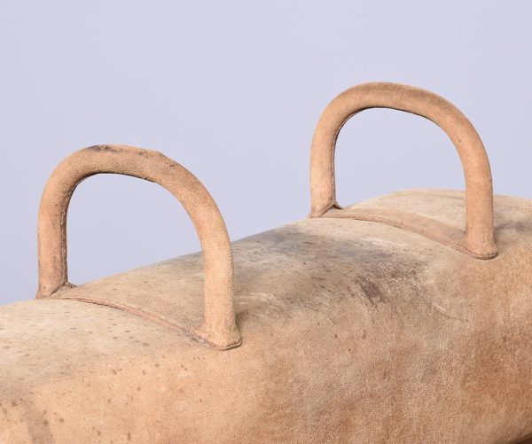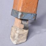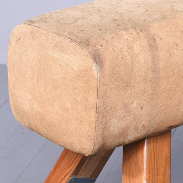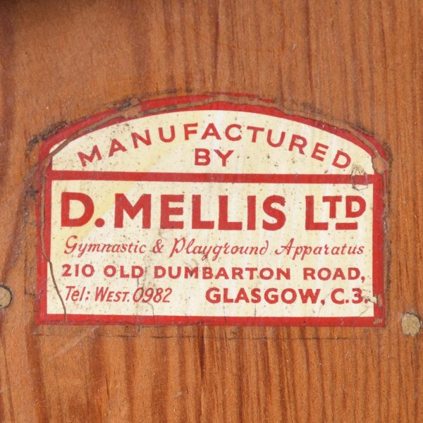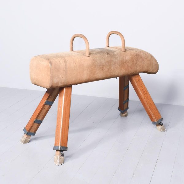 Circa 1930s. A pitch pine and leather covered vaulting horse. Makers stamp on the side ‘D Mellis Limited, gymnastic and playground apparatus, 110 Old Dumbarton Road, Glasgow, G3’, of standard form with two leather covered hoops, and leather covered body, standing on splayed telescopic legs.