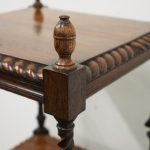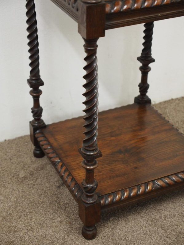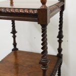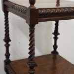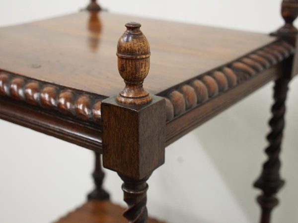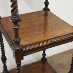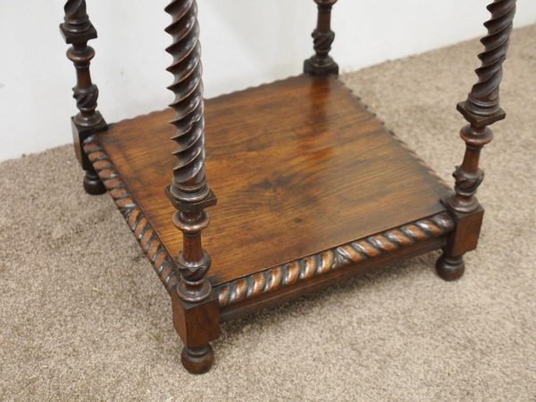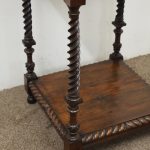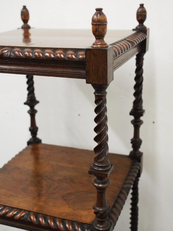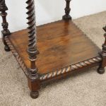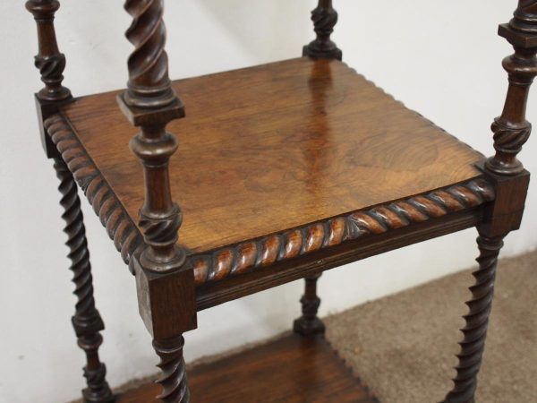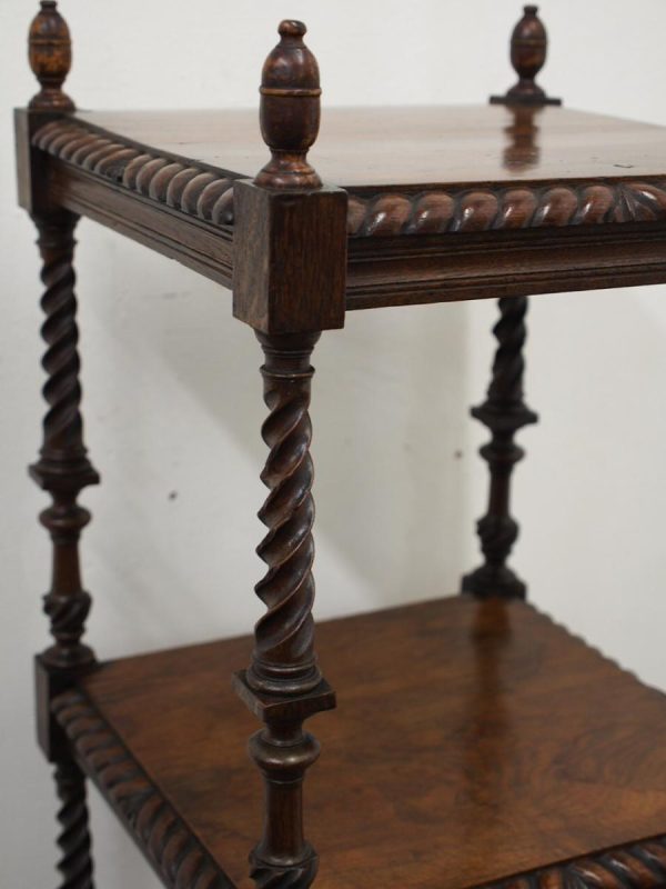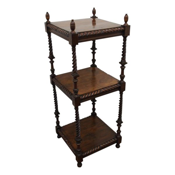Circa 1860, rare Anglo-Indian hardwood whatnot. Surmounted by turned finials, the 3 shelves have raised panels and gadroon carved edges which are supported by tapering barley twist and turned sections. These all lead down to neat turned feet.