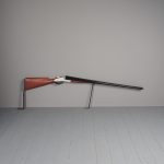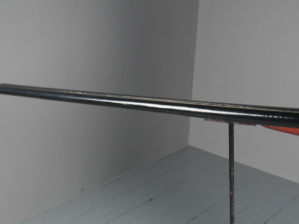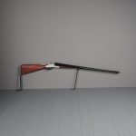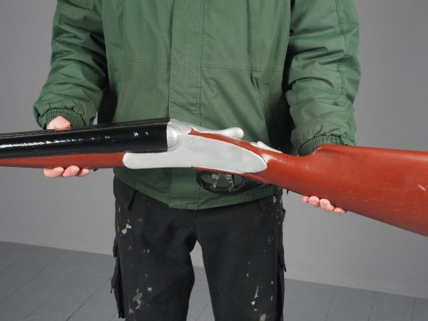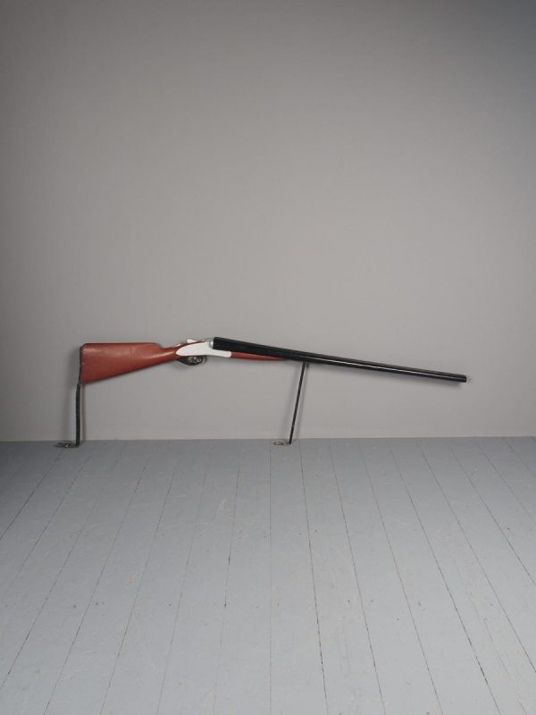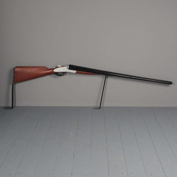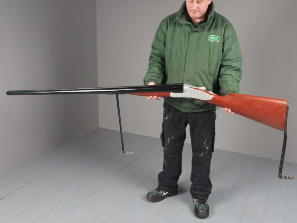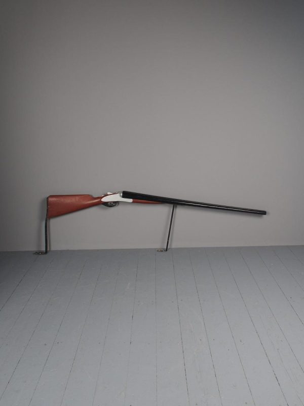 Circa 1880, unusual carved gunsmiths sign or shotgun advertisement. The carved and painted wooden double barrel shotgun with 2 metal brackets for wall mounting, realistically carved with blackened barrels and trigger, with a silvered and painted body.