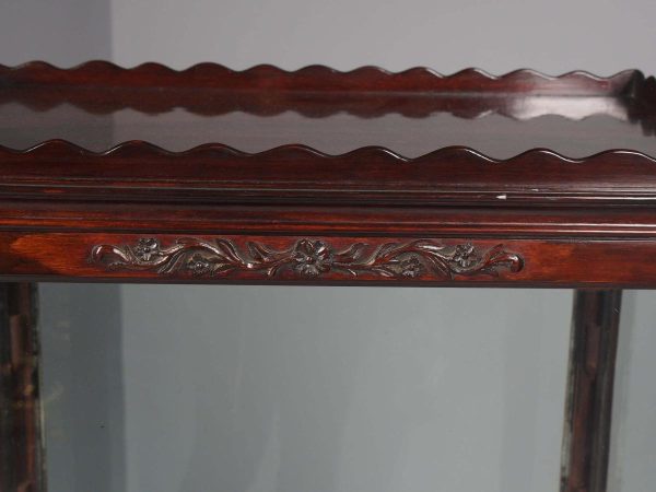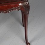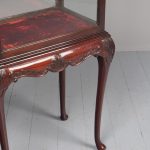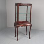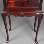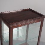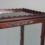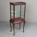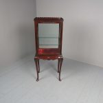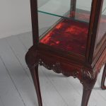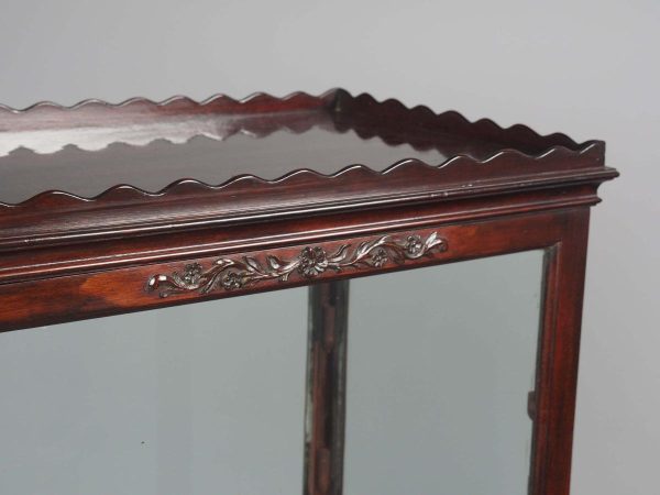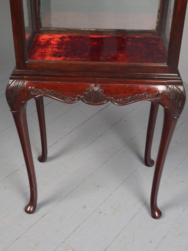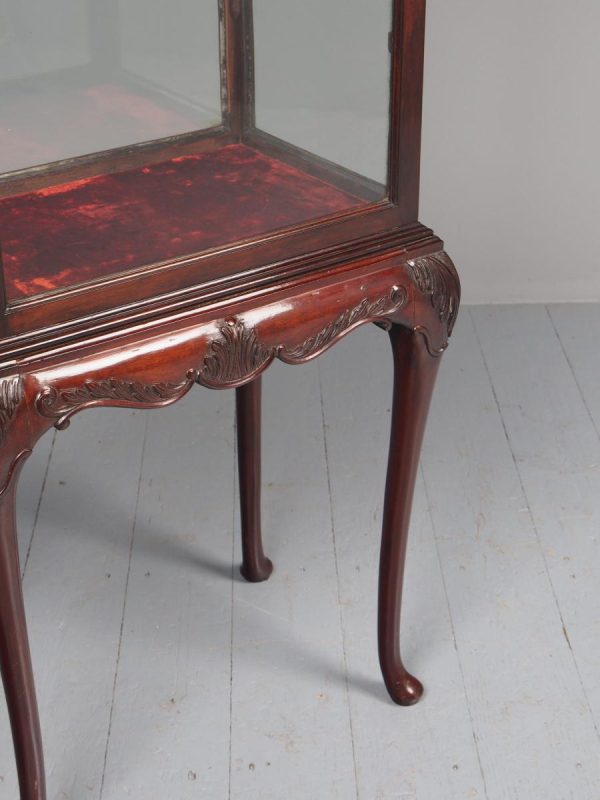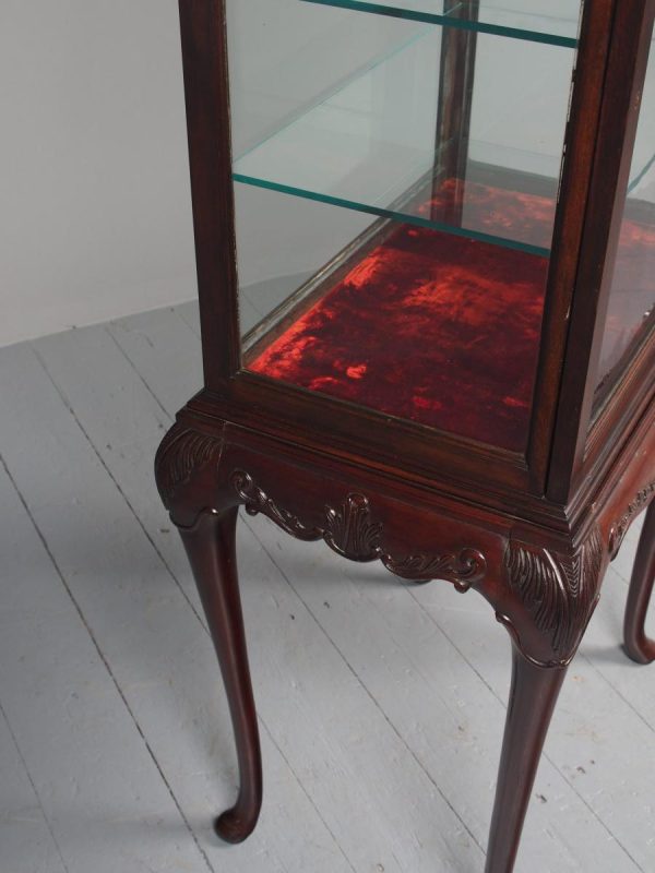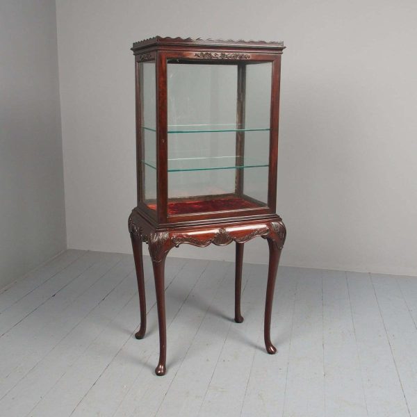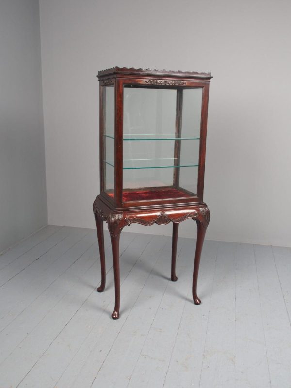 Circa 1870, exhibition quality Chippendale-style, neat-sized mahogany display cabinet. The top in figured Spanish mahogany with wraparound wavy gallery, over a panelled door with scrolled and foliate carved decorations. The interior with 3 adjustable plate glass shelves and a velvet lined base. All supported on an elegant stand with a shaped, foliate-carved frieze and cabriole legs with acanthus carved knees and pad feet.
