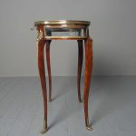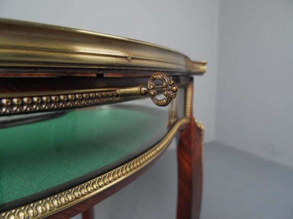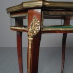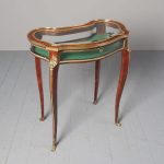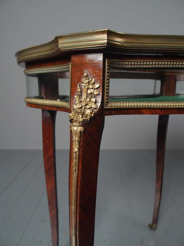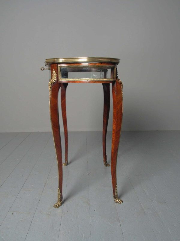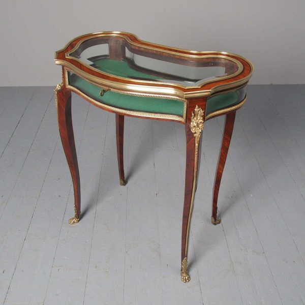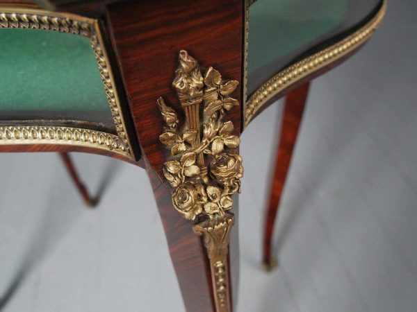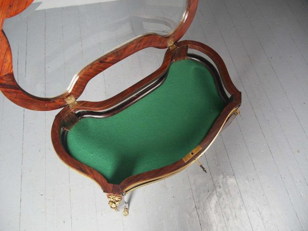 Circa 1870, French ormolu-mounted kingwood bijouterie table. The heart shaped top has ormolu mounted sides and crossbanded kingwood, and a brass bead-mounted, shaped, bevelled glass top. The frieze with 4 panels of ormolu mounted, shaped glass windows and is supported on tapering cabriole legs with exceptional foliate and torch design brass mounts. This extends down the leg front onto lions claw sabots.
