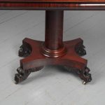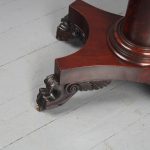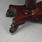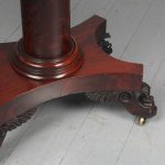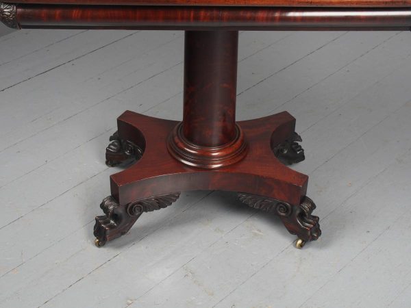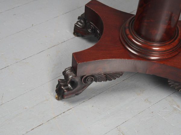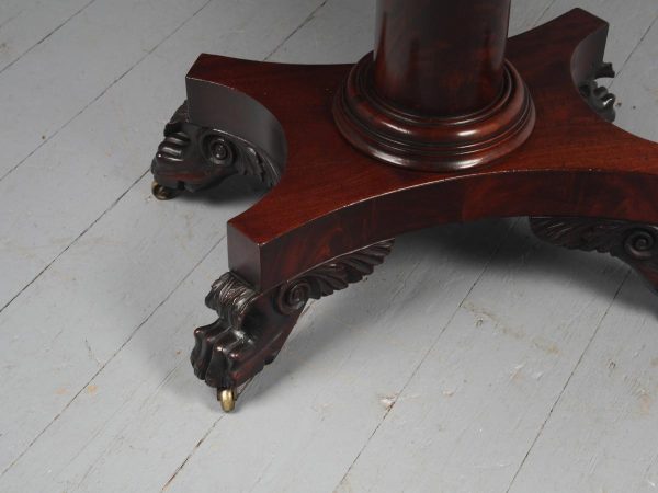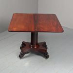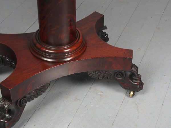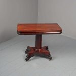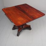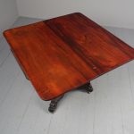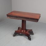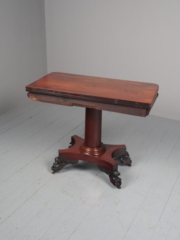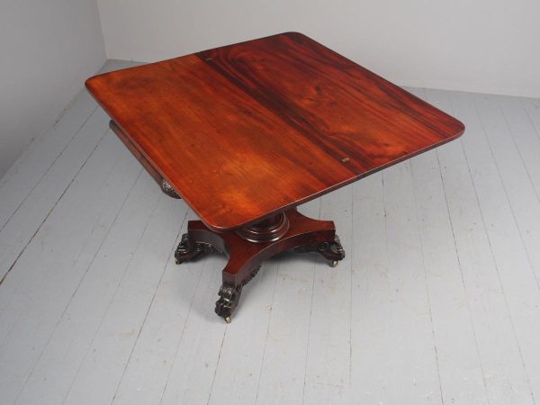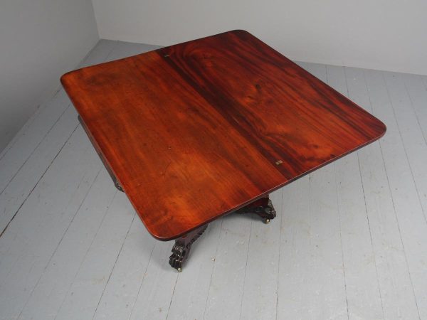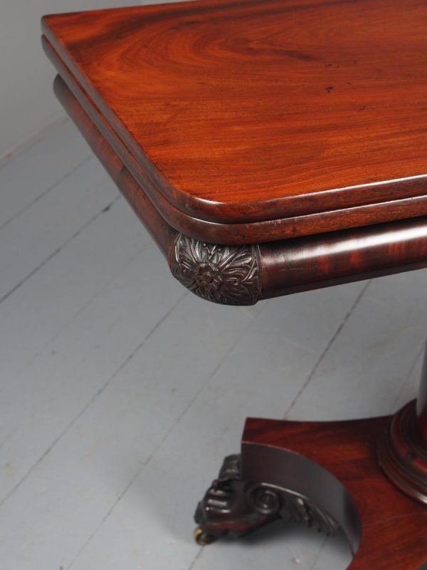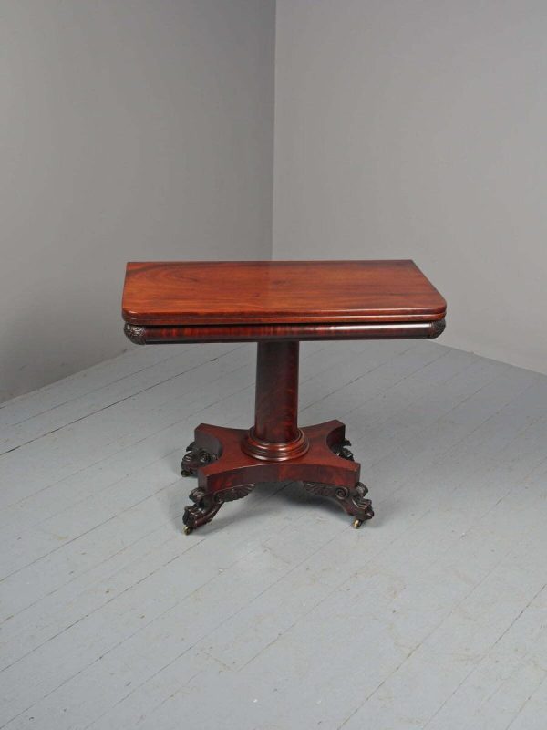 Circa 1830, exhibition quality George IV mahogany fold-over tea table. The rectangular top in exceptionally figured Spanish mahogany with a rich colour and patina and with rounded front edges, swivels and opens to a polished interior. The crossbanded cushion frieze with deep foliate carvings at the corners and supported on a circular column with a ring-turned collar. All over a quadripartite shaped base, on claw feet with acanthus decorations and original brass castors.