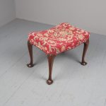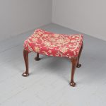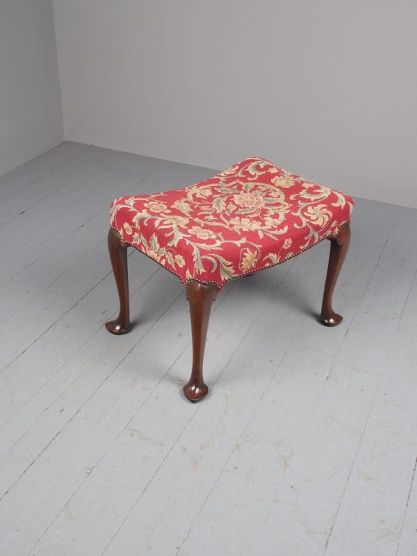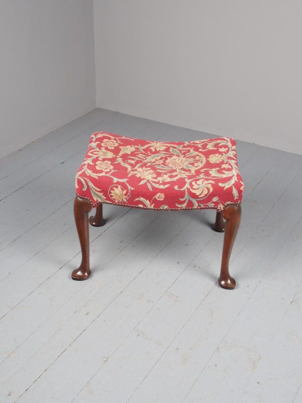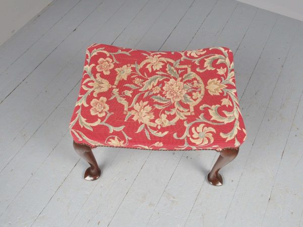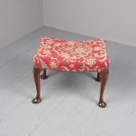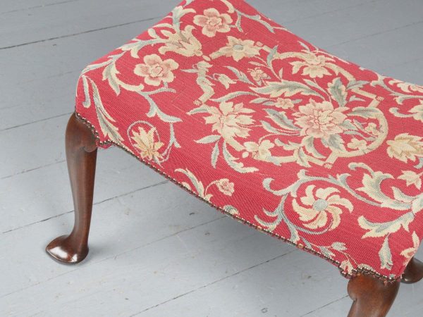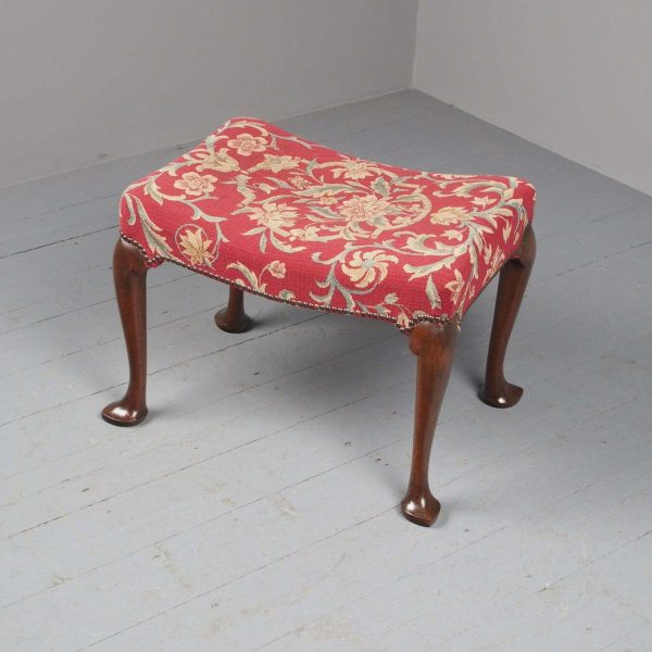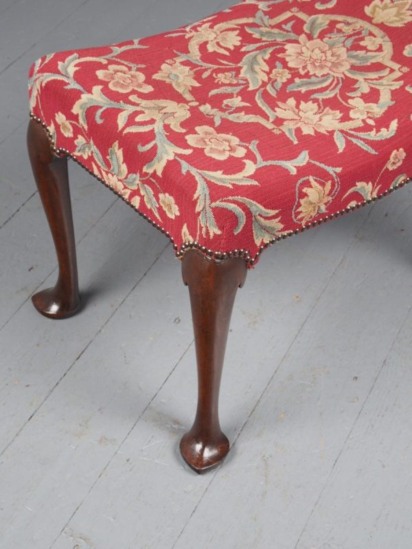Circa 1920, mahogany early Georgian style stool, likely by Whytock and Reid, Edinburgh. The floral design tapestry is secured to the saddle shaped seat with brass nails upholstery. Supported on cabriole legs with a classic Whytock and Reid pointed pad foot.