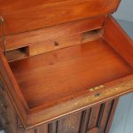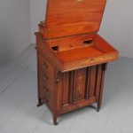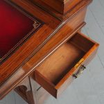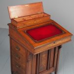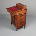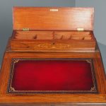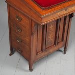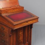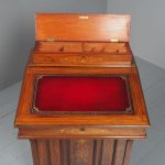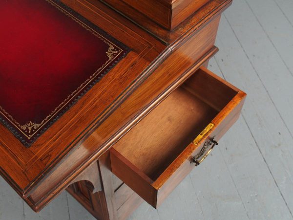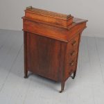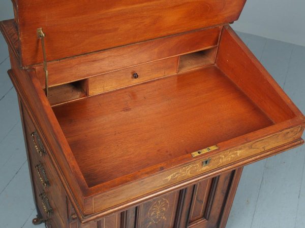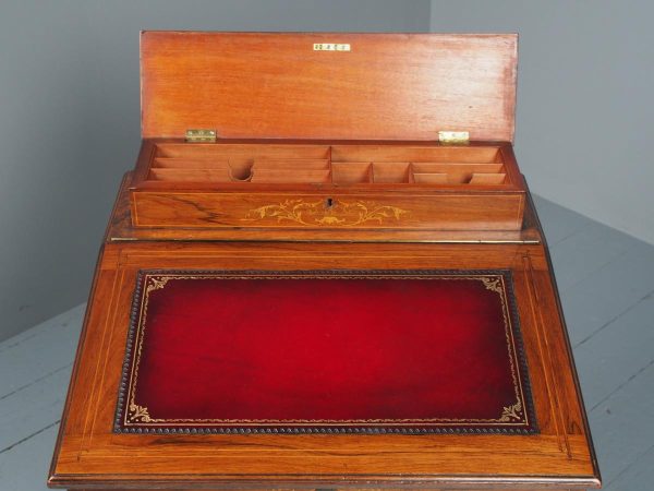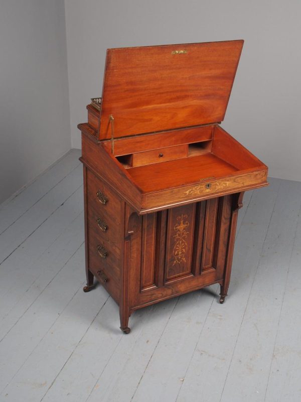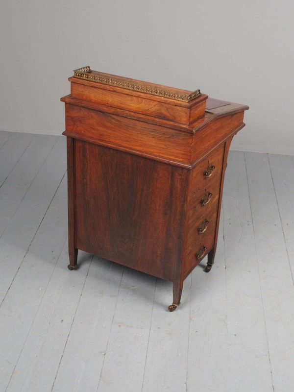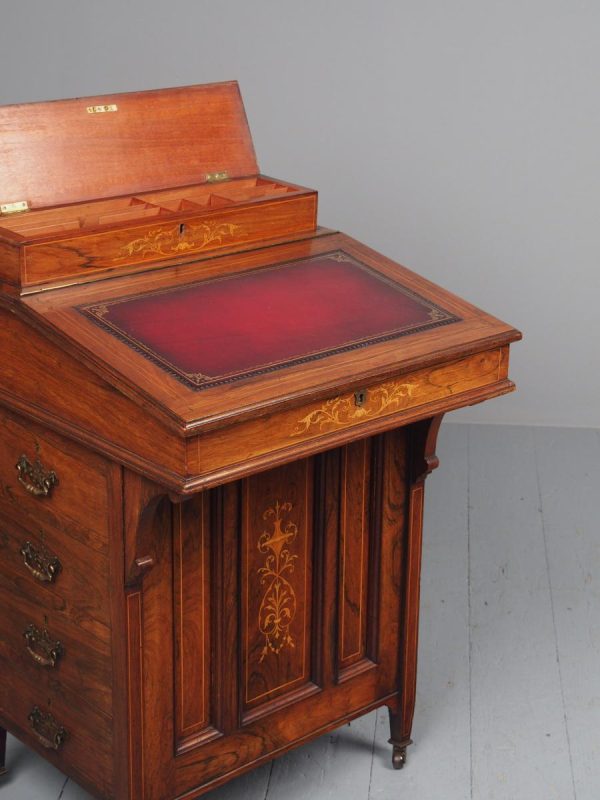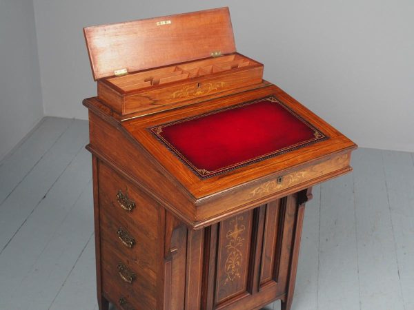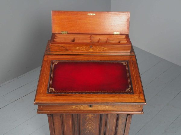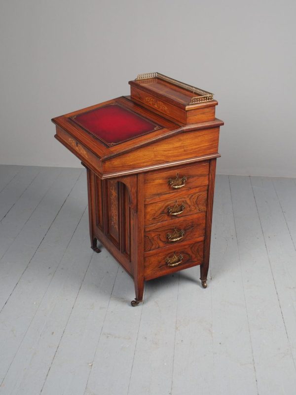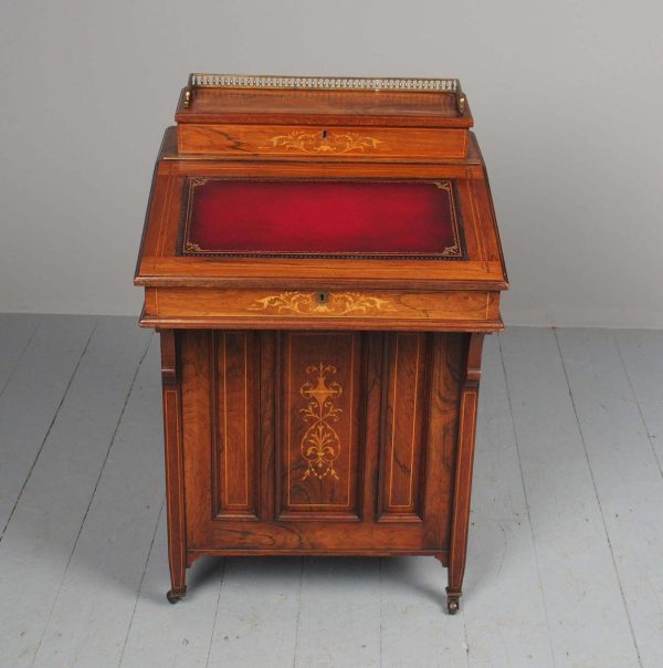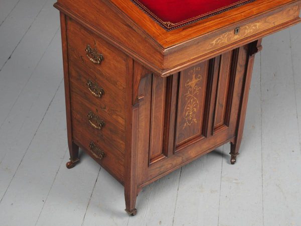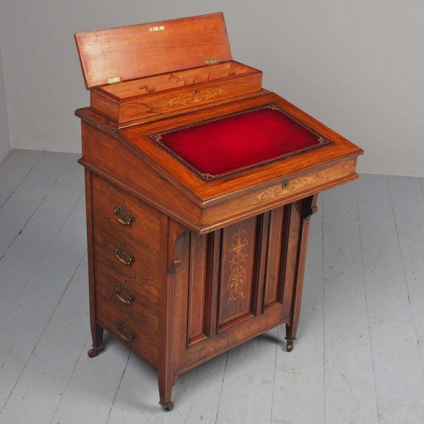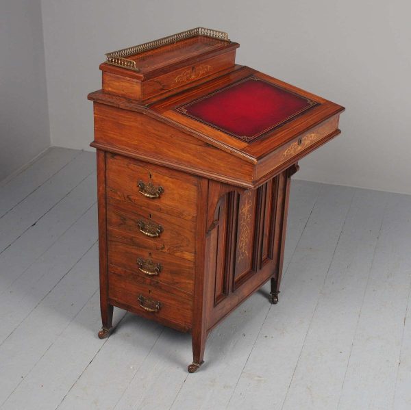 Circa 1900, inlaid rosewood davenport desk. The raised top section with ¾ pierced brass gallery and inlaid top opening to a fitted interior. The hinged, sloping lid with leather surface (by Roy Kirby of London), opens to a mahogany lined interior with a single drawer and brass stay. With a bank of 4 drawers with quality cast handles to one side, and faux drawers to the opposite, the back is veneered and polished (freestanding). The centre panel to the front is inlaid with marquetry, all standing on square legs with inlaid facings and on brass and porcelain castors.