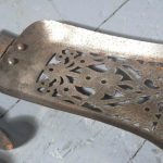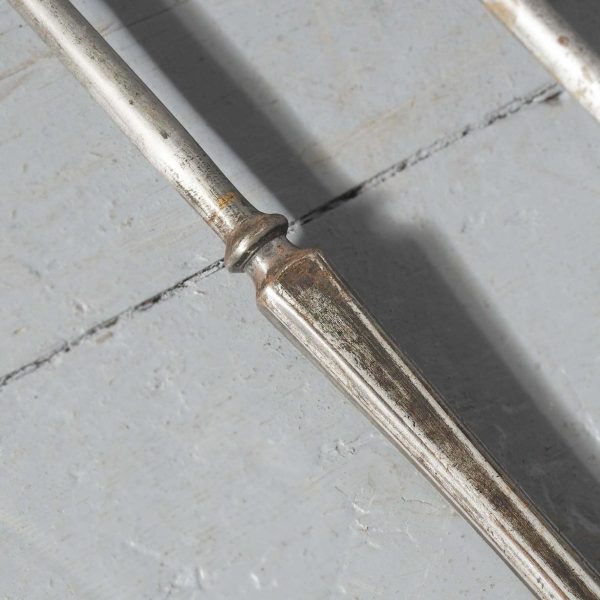 Circa 1790, substantially sized set of 3 fireside tools consisting of pair of tongs, poker and shovel, all capped with a large cast brass knob. The shovel with tapering, shaped stem with a spayed pierced spade, held in place by 2 rivets and with the letter (W) stamped on the back.