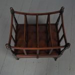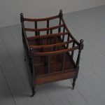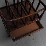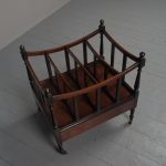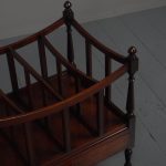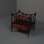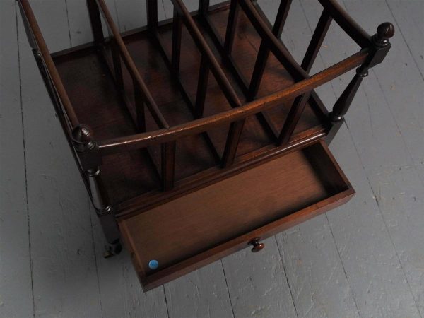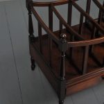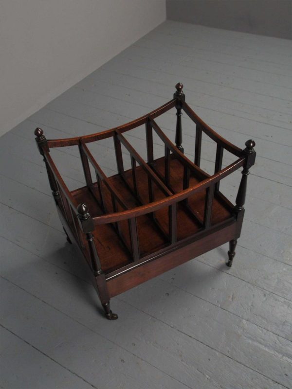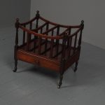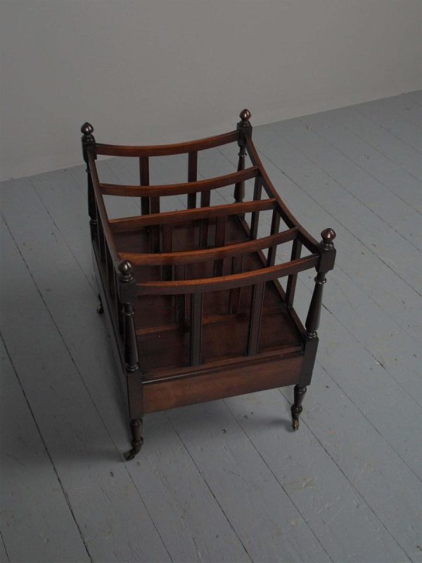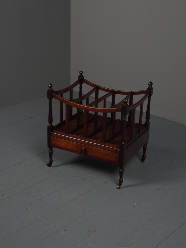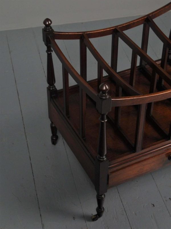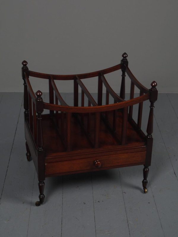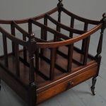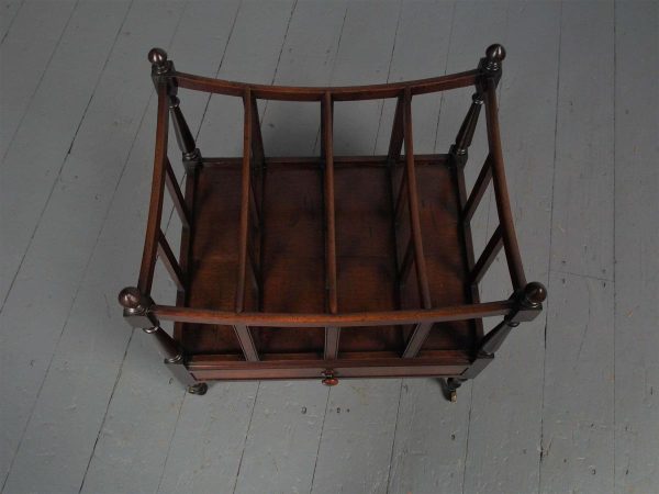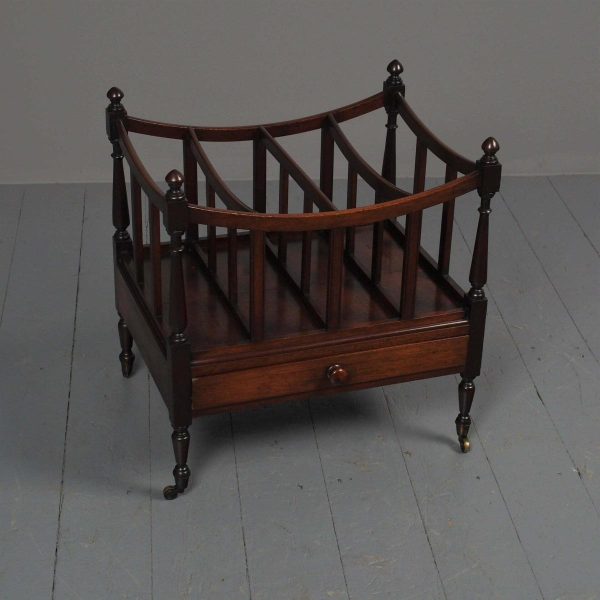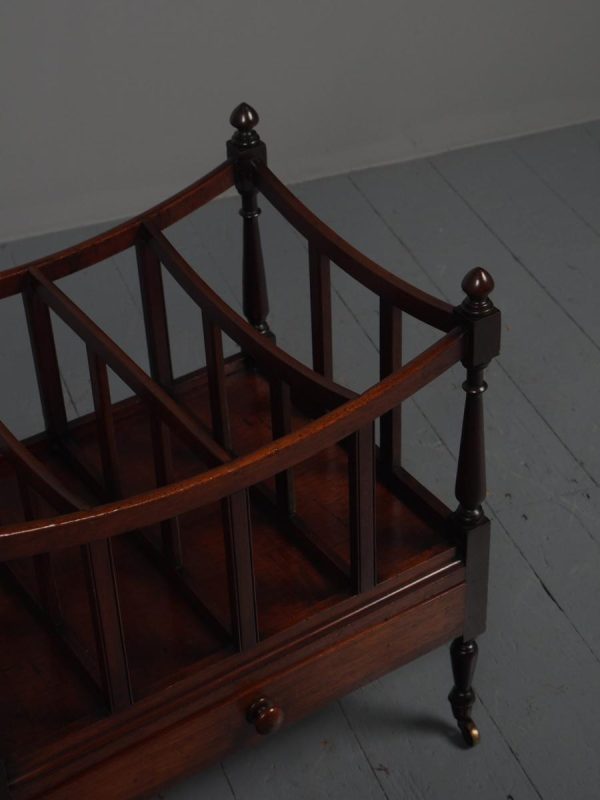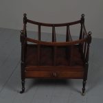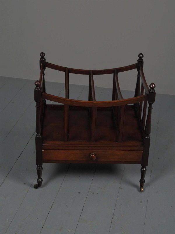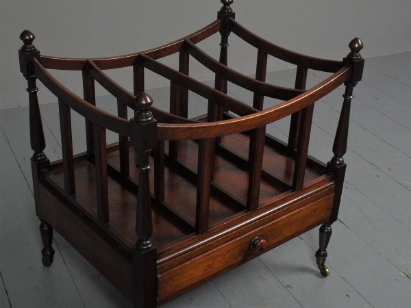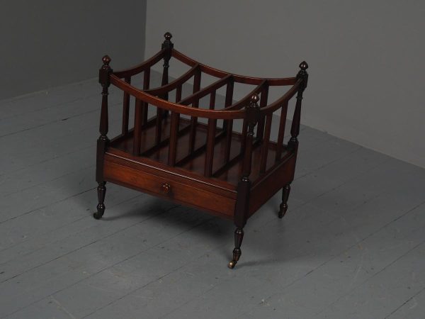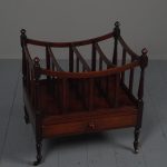 Circa 1815, unusually large sized Regency mahogany boat-shaped canterbury. With 4 turned uprights surmounted by finials, curved front and sides and 3 central divisions, supported on slightly reeded uprights. Polished to all sides (freestanding), and the base with full length drawer with turned knob handles, all on 4 turned, ring turned, tapering legs on brass cup and castors.