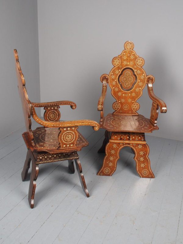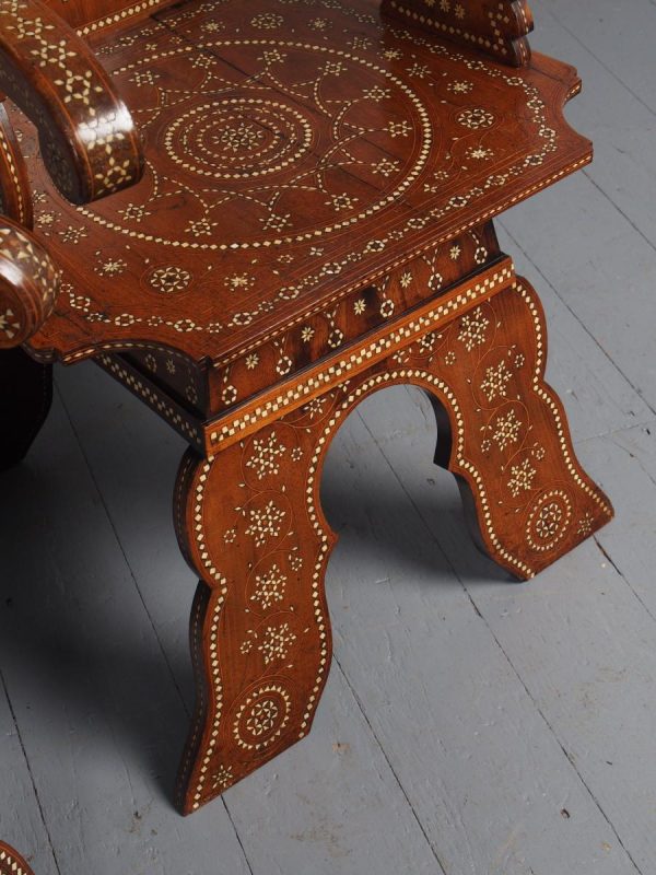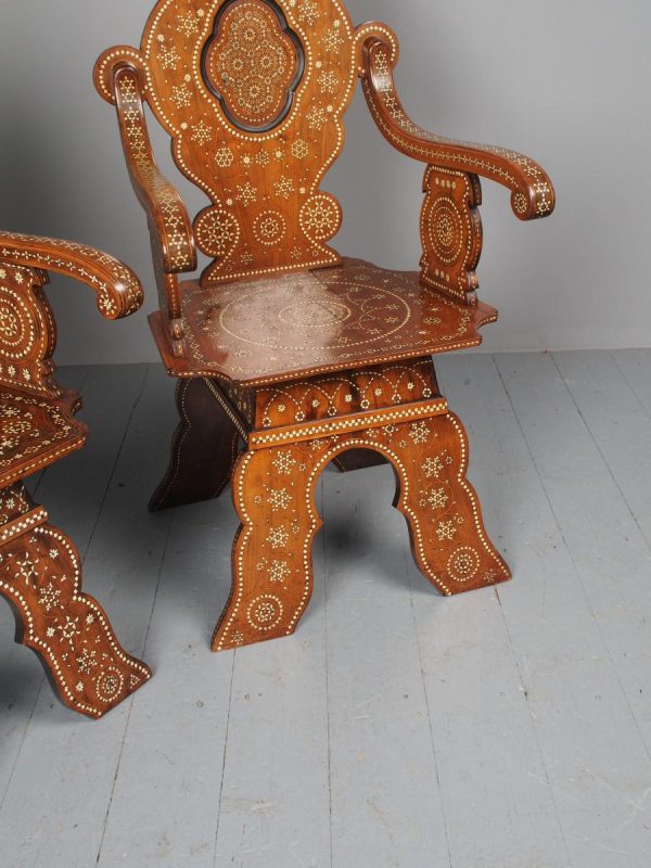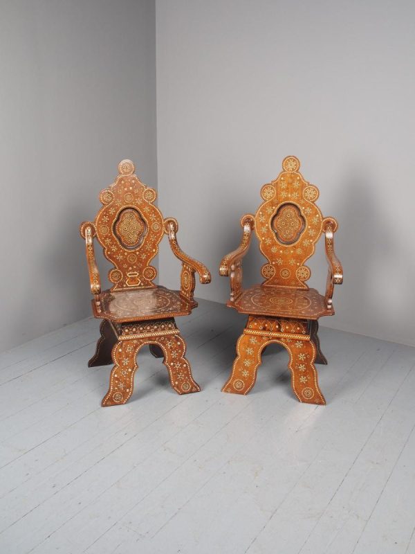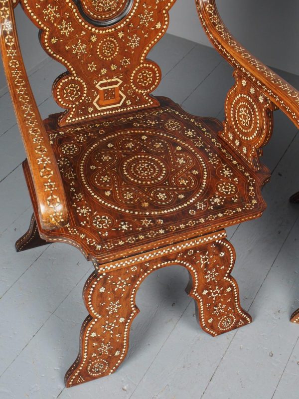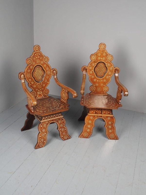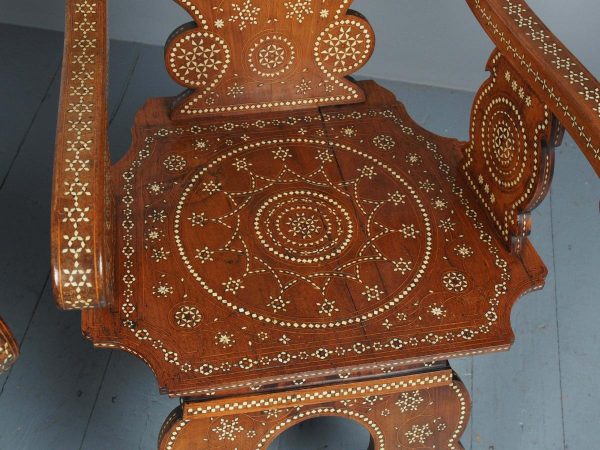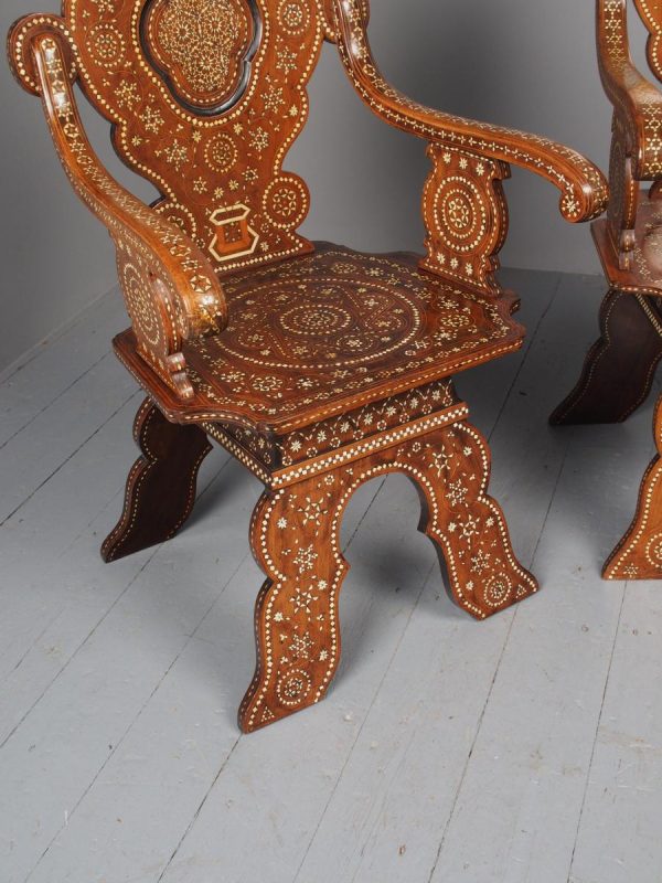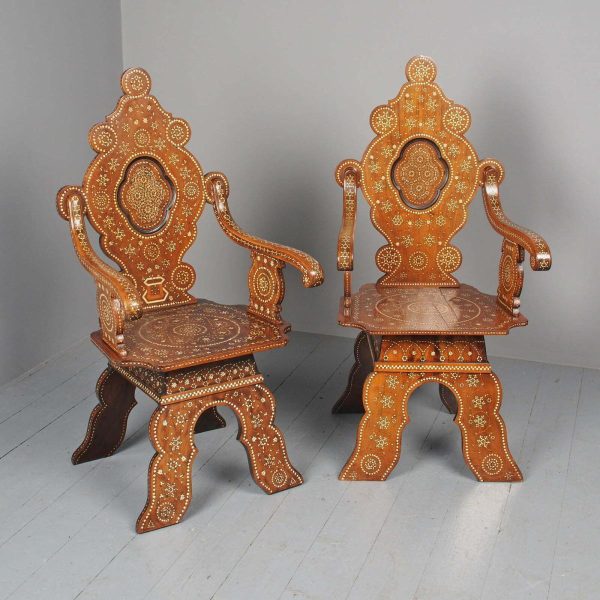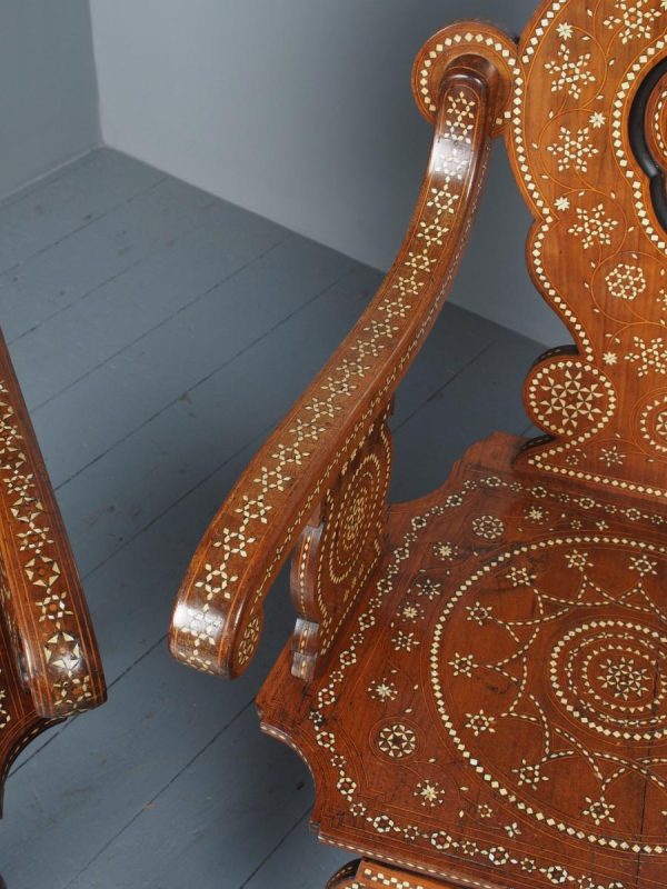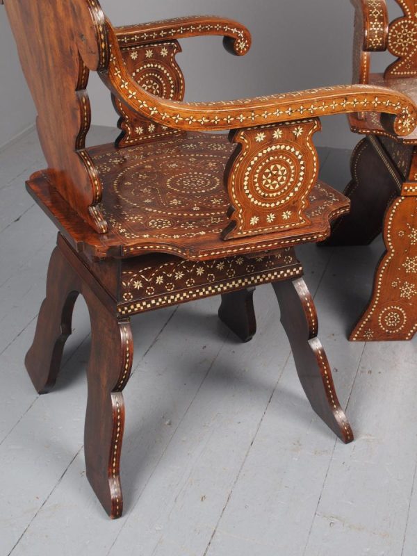 Circa 1900, matched pair of Damascus (Syrian) inlaid chairs in cedar wood. Both chairs are smothered in Islamic style bone and boxwood inlay. The shaped backs with panels of inlay and with shaped, scrolling arms with scroll fronts, with side supports of shaped inlaid panels. The rectangular seat with shaped edges, supported on deep inlaid supports with shaped splayed legs