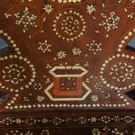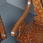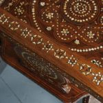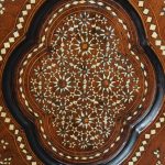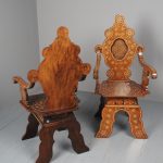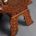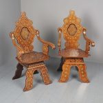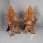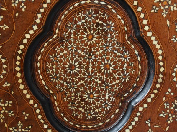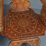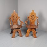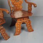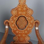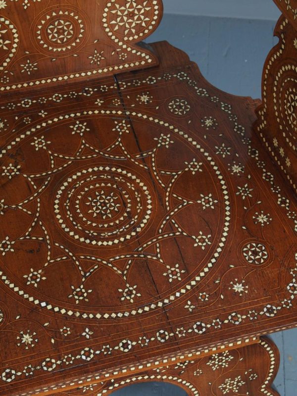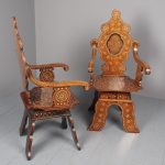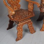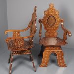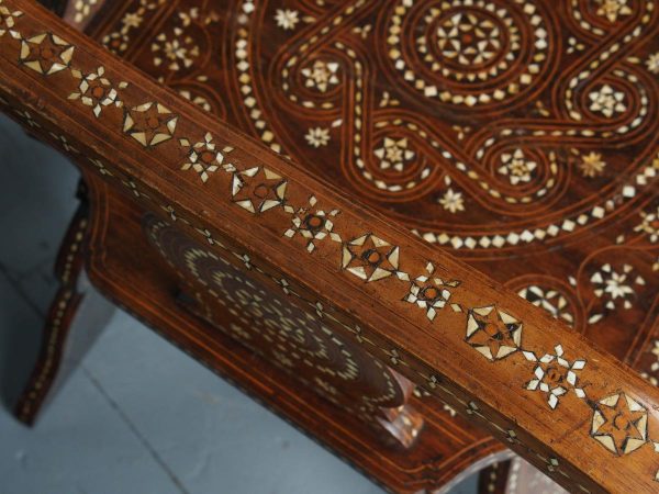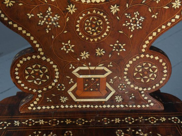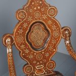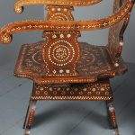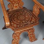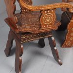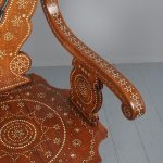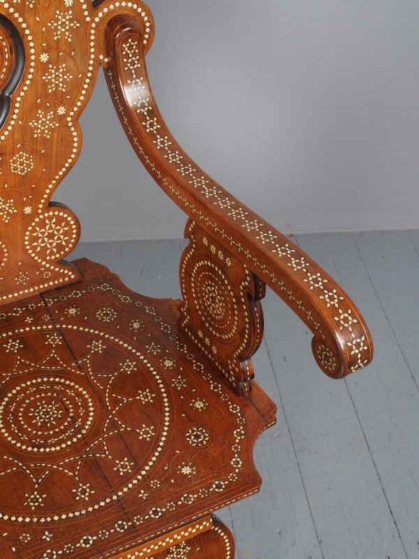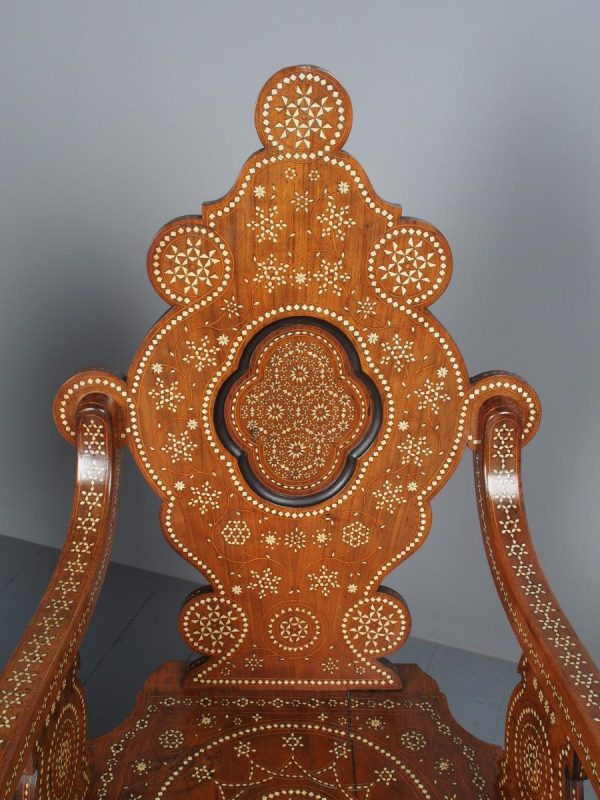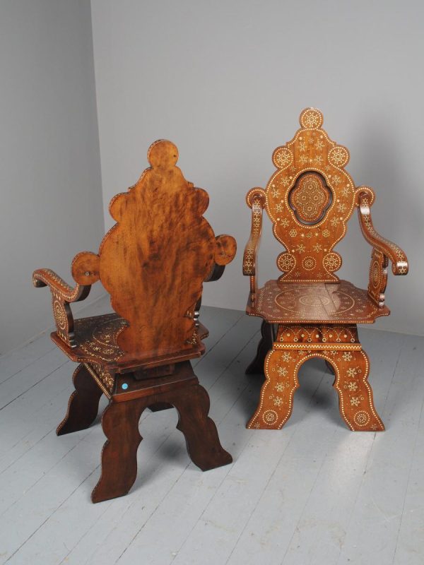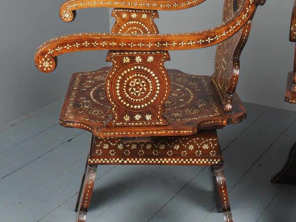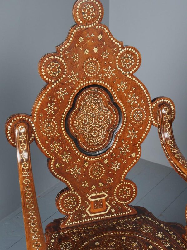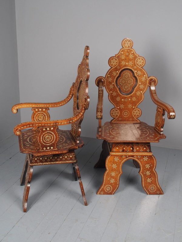 Circa 1900, matched pair of Damascus (Syrian) inlaid chairs in cedar wood. Both chairs are smothered in Islamic style bone and boxwood inlay. The shaped backs with panels of inlay and with shaped, scrolling arms with scroll fronts, with side supports of shaped inlaid panels. The rectangular seat with shaped edges, supported on deep inlaid supports with shaped splayed legs