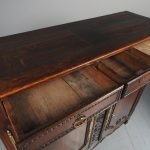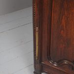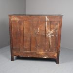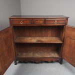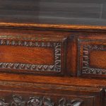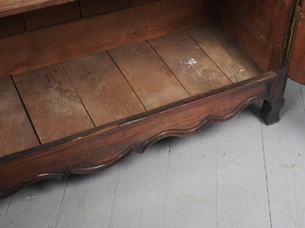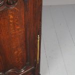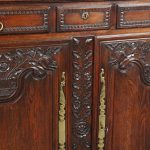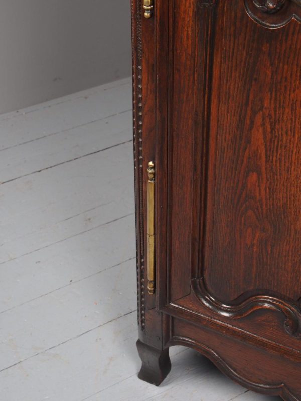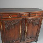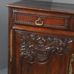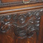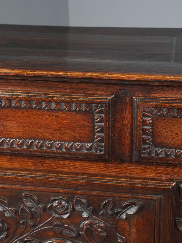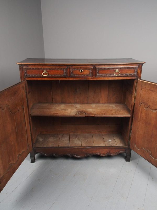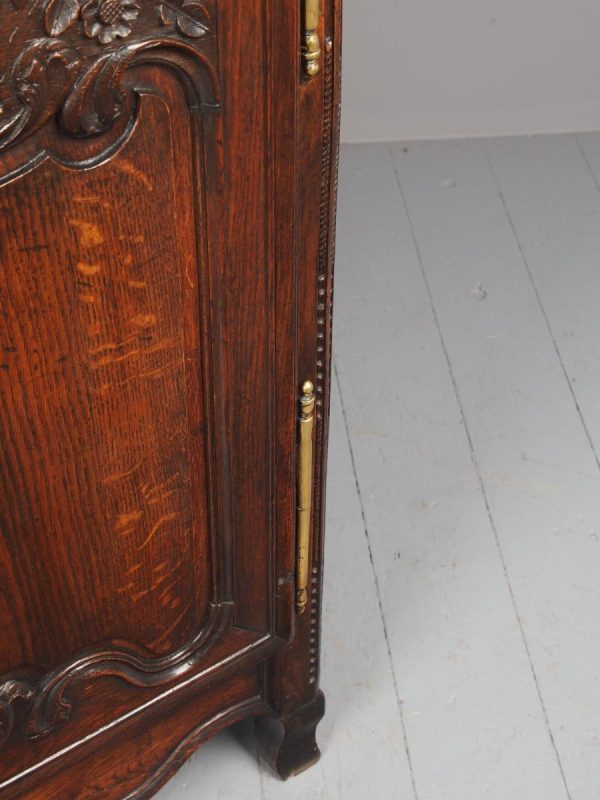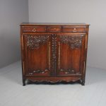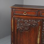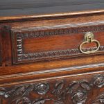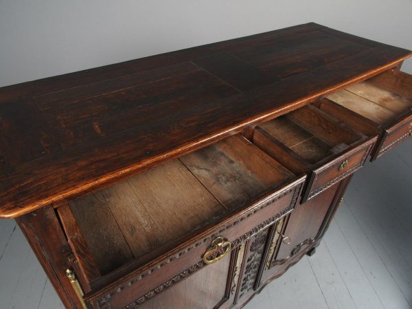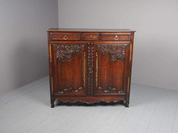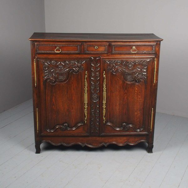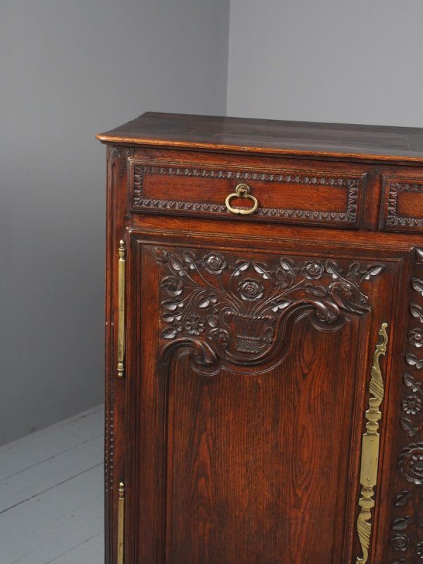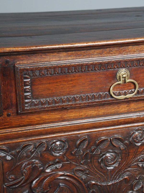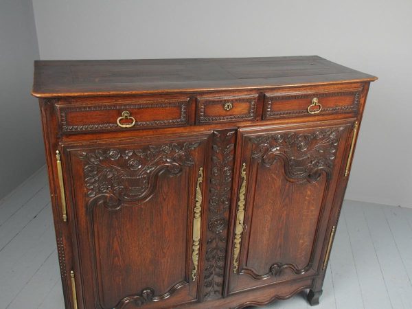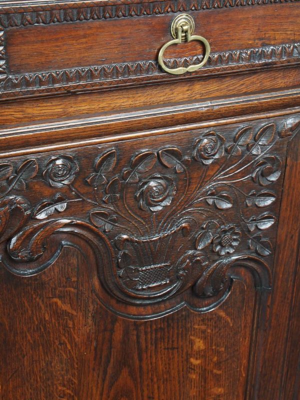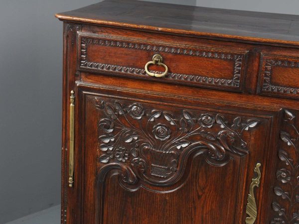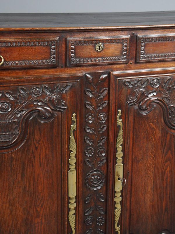 Circa 1790, Northern French well carved oak side cabinet. The rectangular panelled top with rounded corners, over a configuration of 3 drawers with fine carved foliate beading and the 2 outside drawers with elegant brass pulls and backplates. The 2 full length doors are profusely carved with flowers and urns, with a pair of large proud brass hinges and elaborate extended brass plates. The central carved panel has intertwined flowers and leaves, with a large carved flower head design. The interior with a single shelf, over a shaped and beaded frieze which continues to the sides, all finishing on simple block feet.