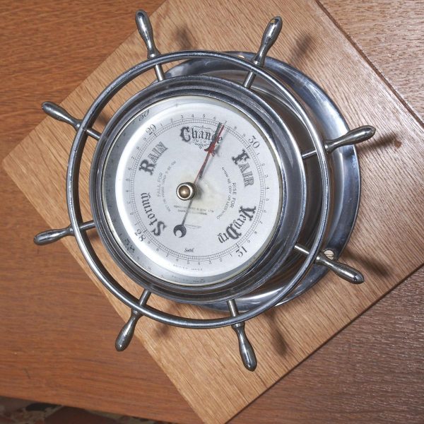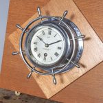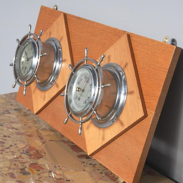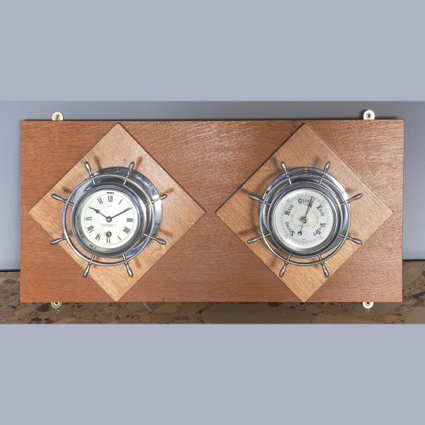 Circa 1930’s, pair of chrome ships bulkhead clock and barometer. Both in the form of a ships wheel with bevelled edge glass, each with maker’s name of Henry Brown & Sons Limited, Barking & London. Mounted on an oak frame on a large rectangular oak plaque.