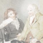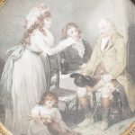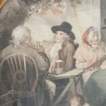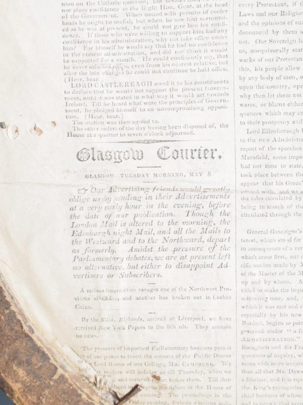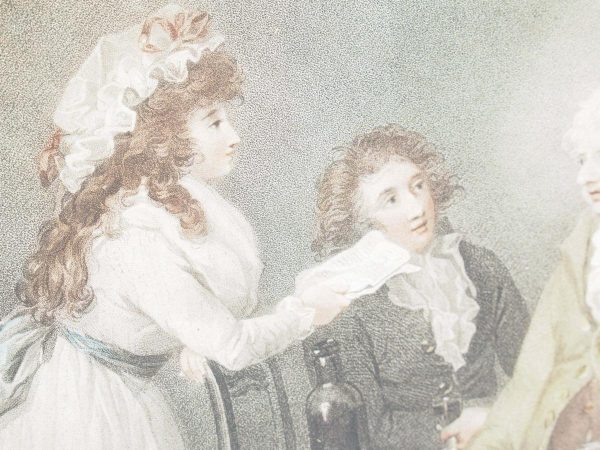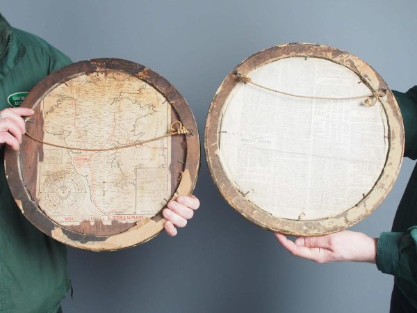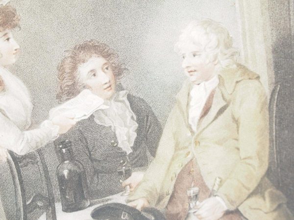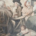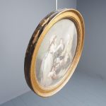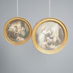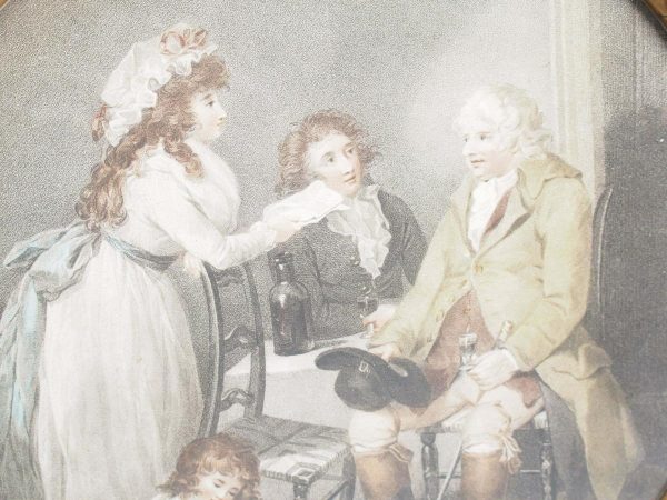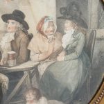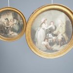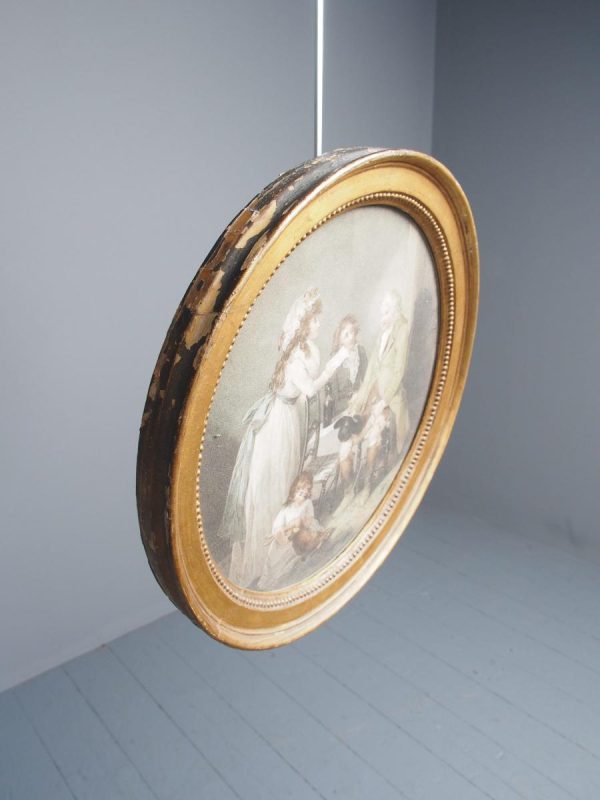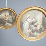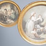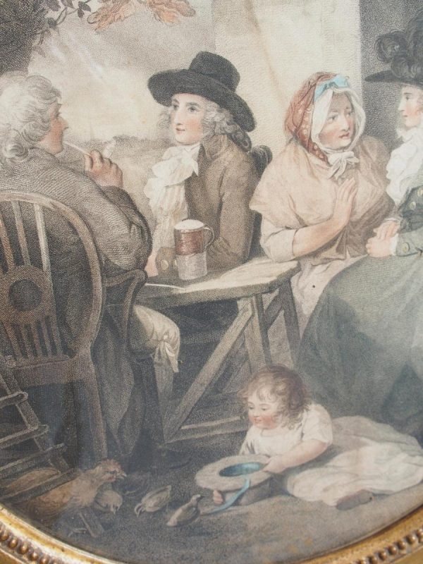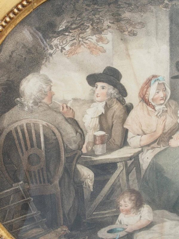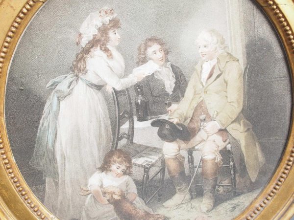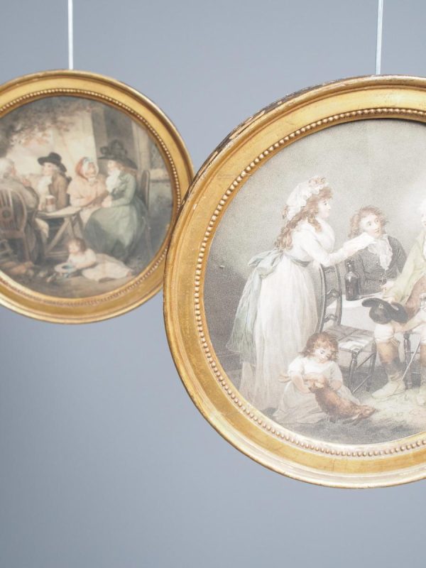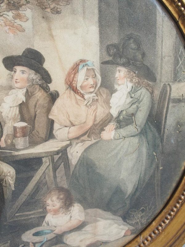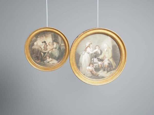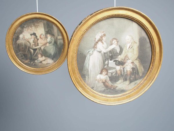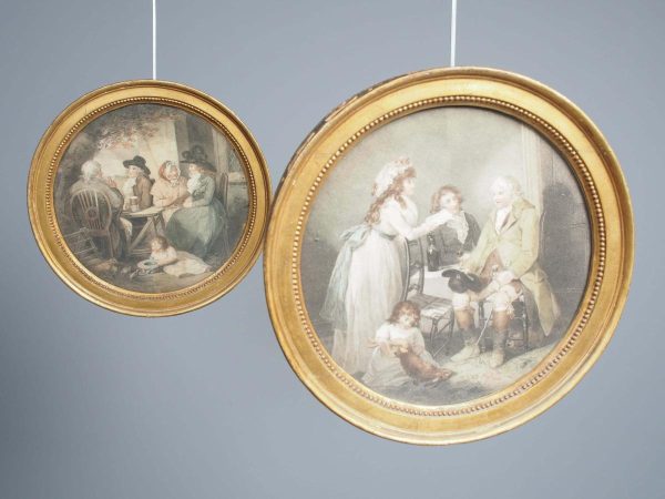 Circa 1820s, pair of Regency gilt-framed hand-tinted prints after George Morland. Depicting the classic Morland rural scenes, within circular gilded frames with beading and moulding edges. The back of the prints contains an old map and an old newspaper, dated 1826