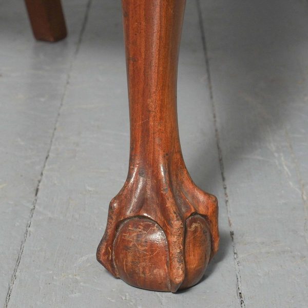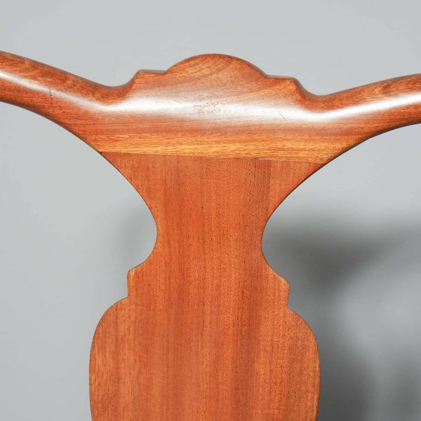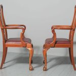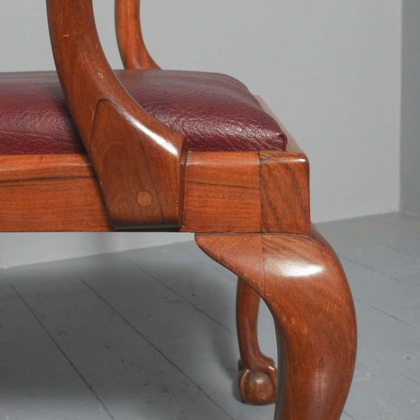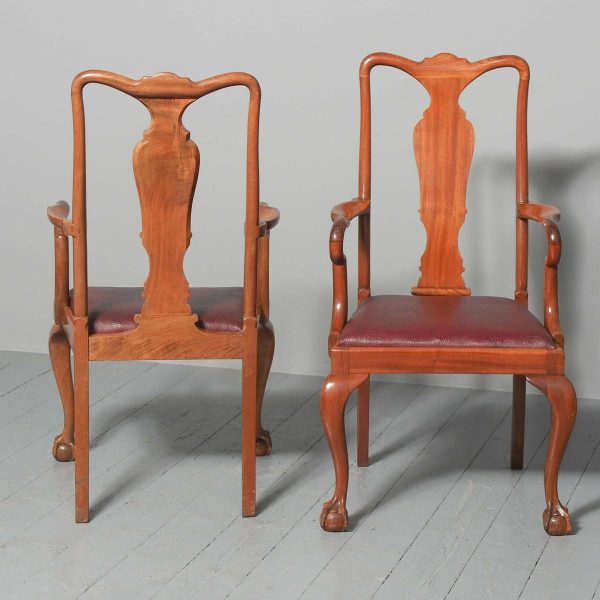 Circa 1900. A quality pair of mahogany Queen Anne style arm chairs with a shaped cresting rail and elegant Queen Anne style splat. Two well-formed arms held in place by shaped supports, large drop in seat pad, simple seat rails, with square outswept back legs, front cabriole legs with quarter blocks finishing on a ball and claw foot. Both chairs have great colour and patination.