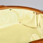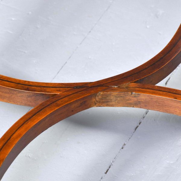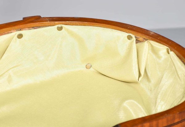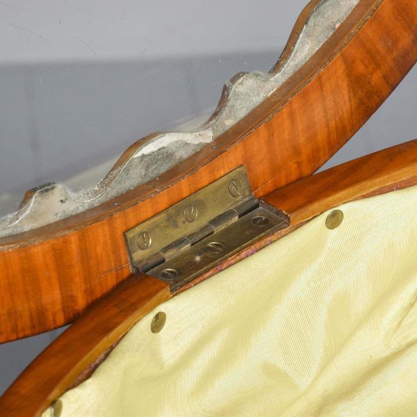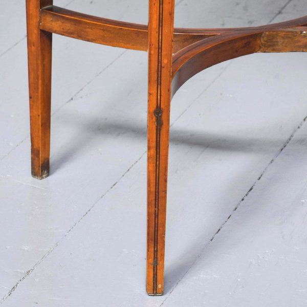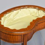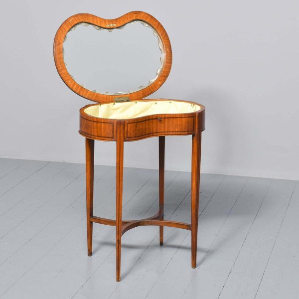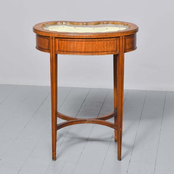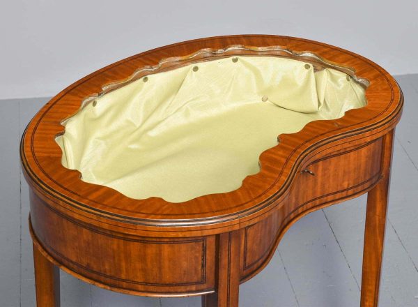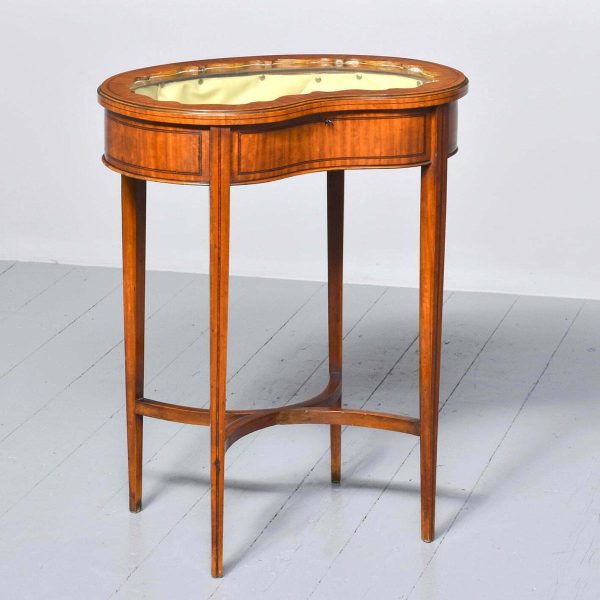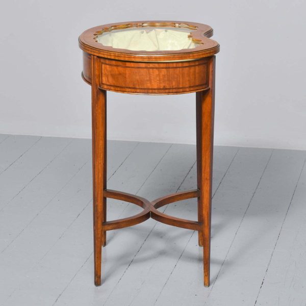 Circa 1890. Rare inlaid satinwood kidney shaped bijouterie table. The kidney shaped glazed top with king wood and ebony inlay and serrated margins opening to shaped lined interior. The shaped front with working lock; with inlaid side panels all on square tapering inlaid supports with an inlaid shaped stretcher.