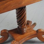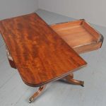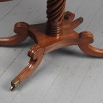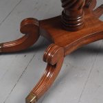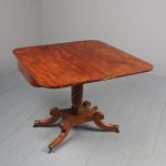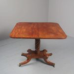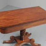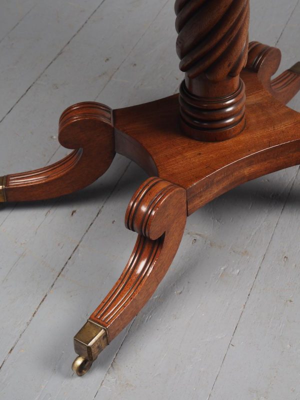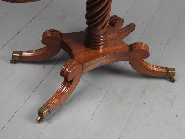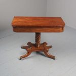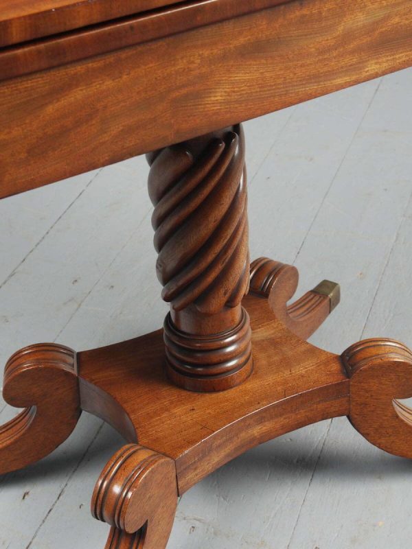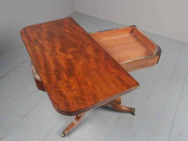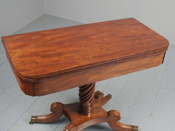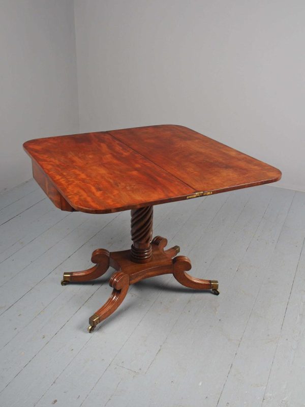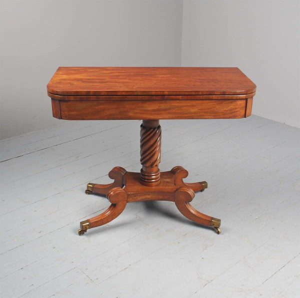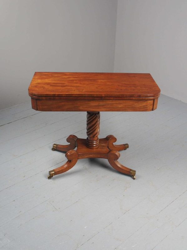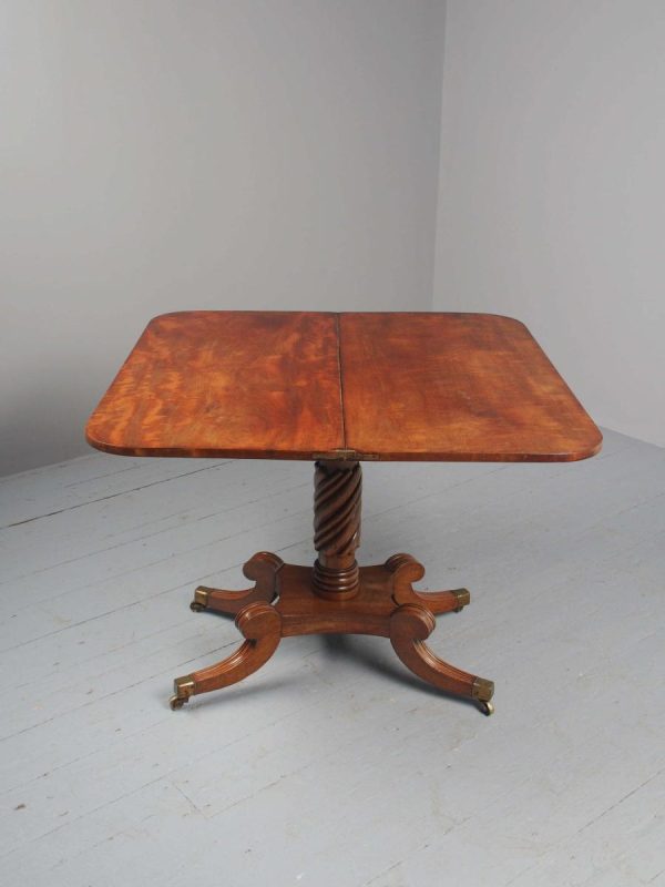 Circa 1815, Regency mahogany D-shaped fold-over tea table. The top in well figured mahogany swivels to a full size storage area, over a simple frieze and on an unusual twisted, fluted column. All on a platform base with hipped, reeded sabre legs over brass blocks and original brass castors.