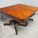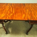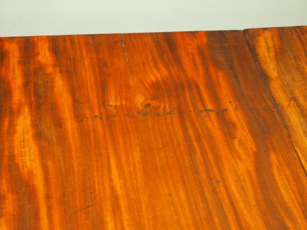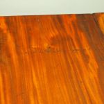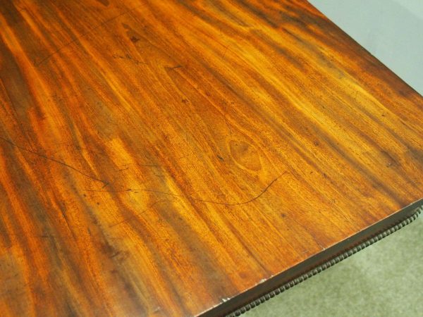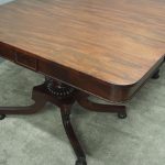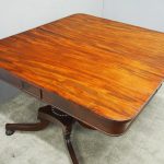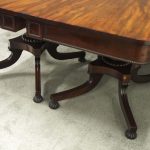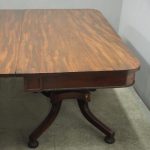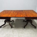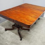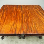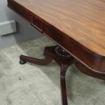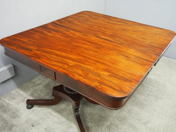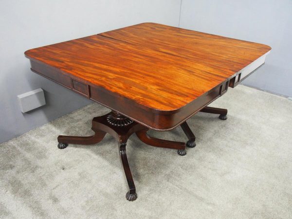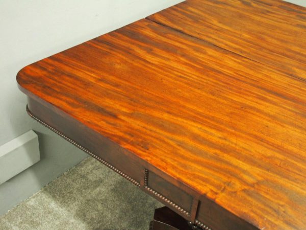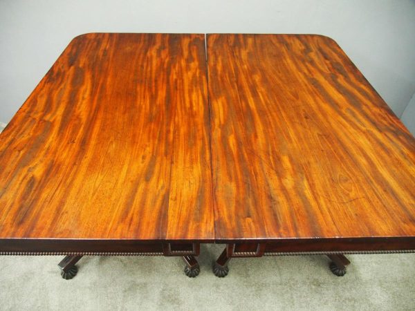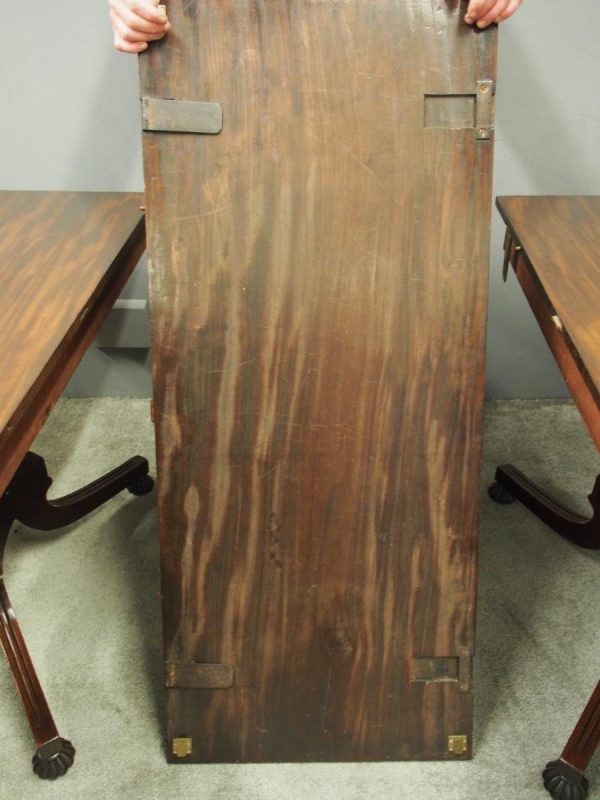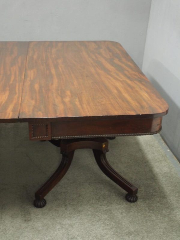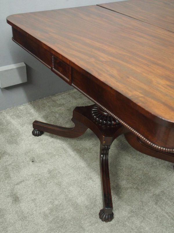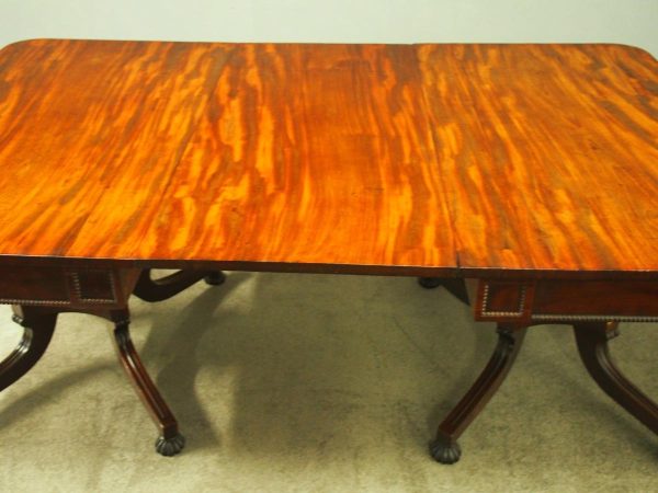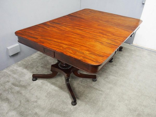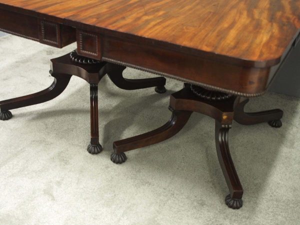 Circa 1815, exhibition quality Regency mahogany twin pillar dining table with an extra leaf. The top in finest flamed Cuban mahogany with rounded corners, over a beaded frieze with central flame mahogany panel. Standing on a fluted stem over a concave platform base with sabre legs on fluted bun feet (original castors are beneath).