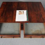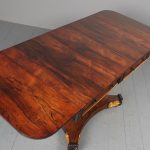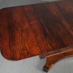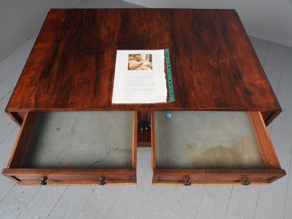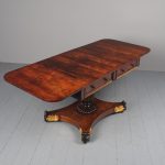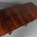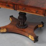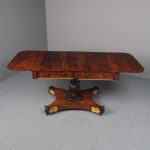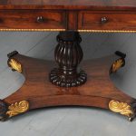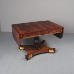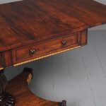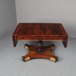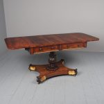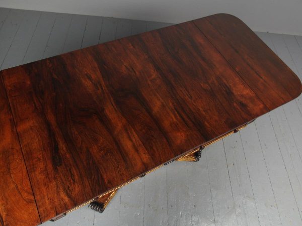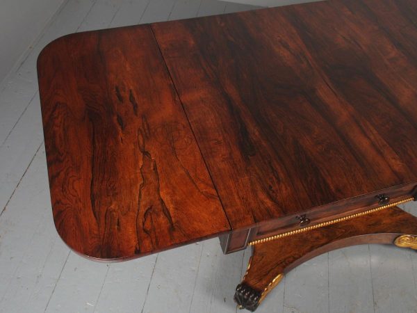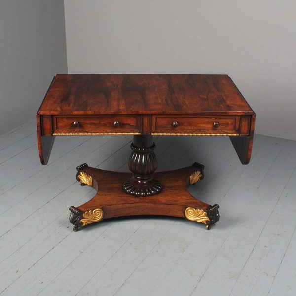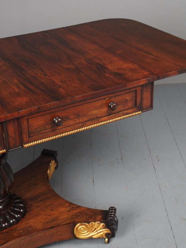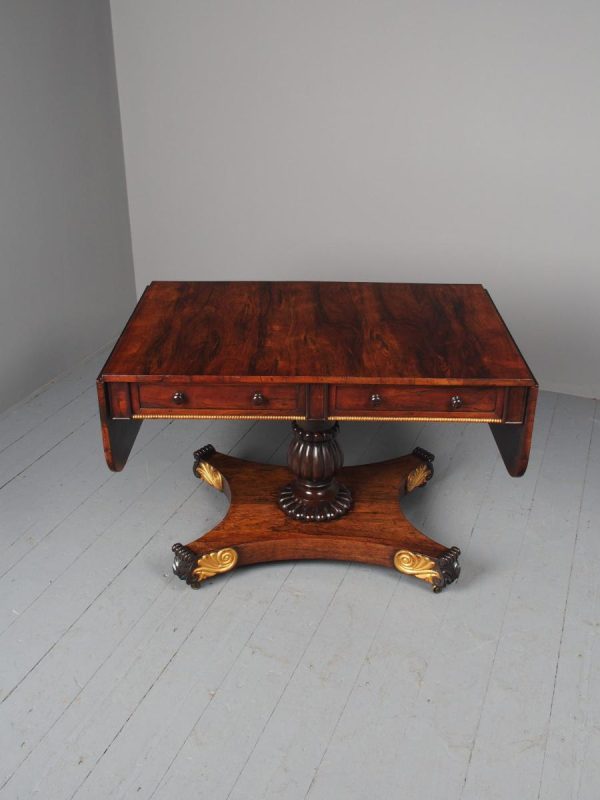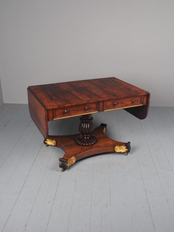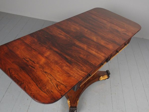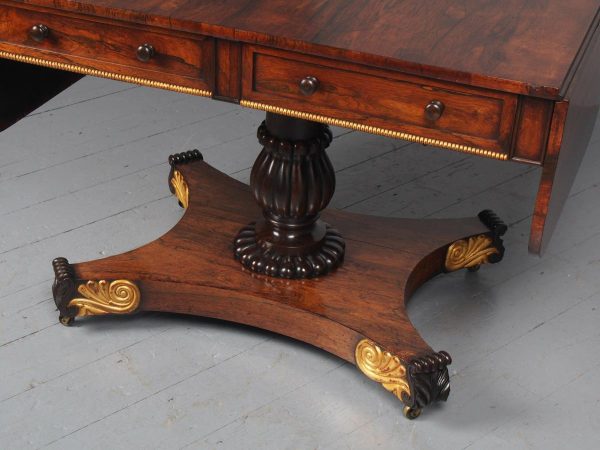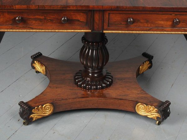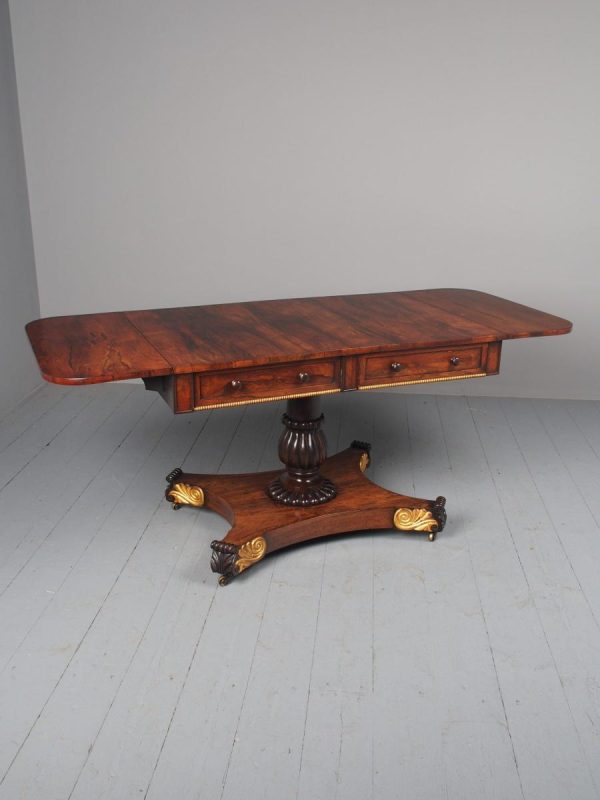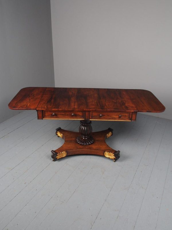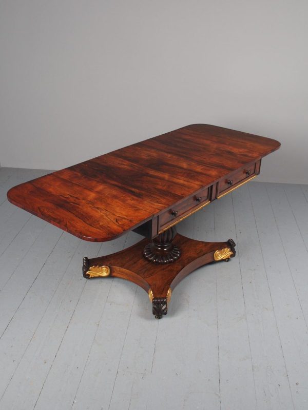 Circa 1815, Regency rosewood sofa table. The rectangular top with variegated rosewood veneers, D-shaped leaves and over a set of dummy drawers to the back and full-size drawers to the front, with turned knob handles and gilding. The elegant stem is turned, tapering and fluted, over a well carved collar and all on a large, concave platform base with scrolling and foliate carving to the front and further gilding. Finishing on 4 brass castors.