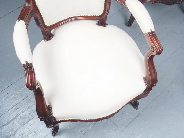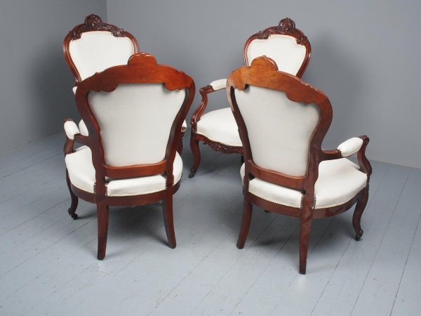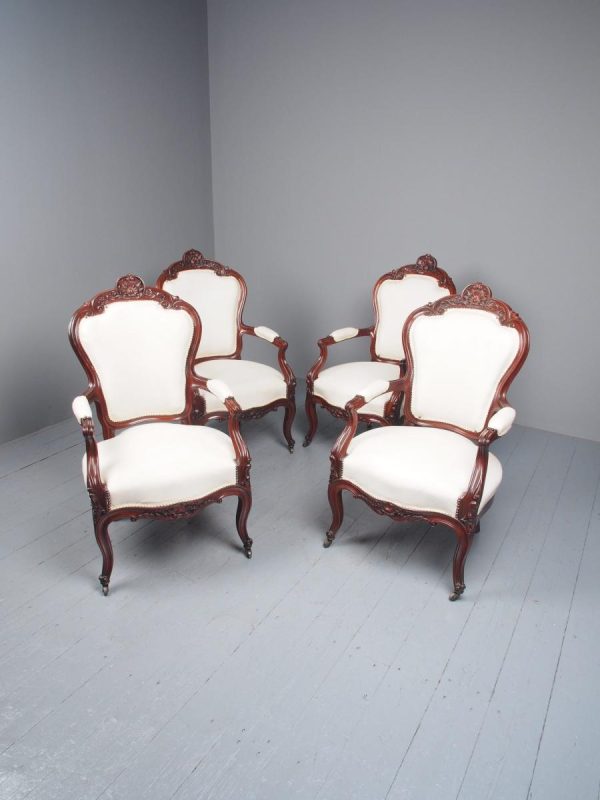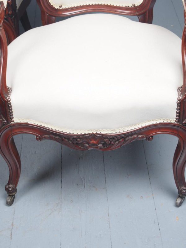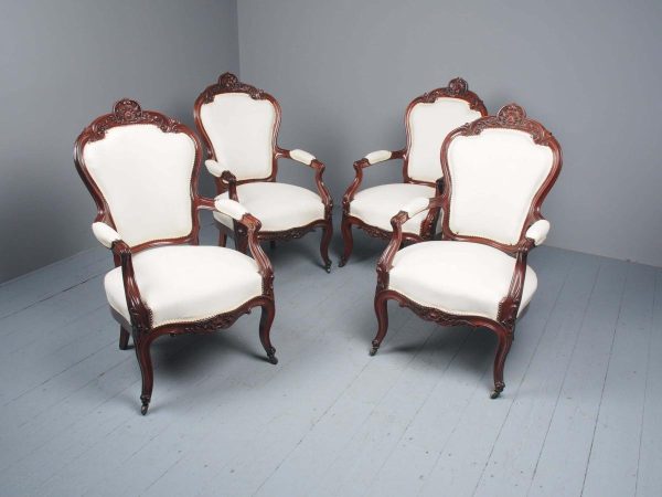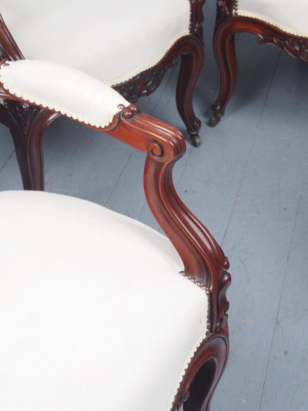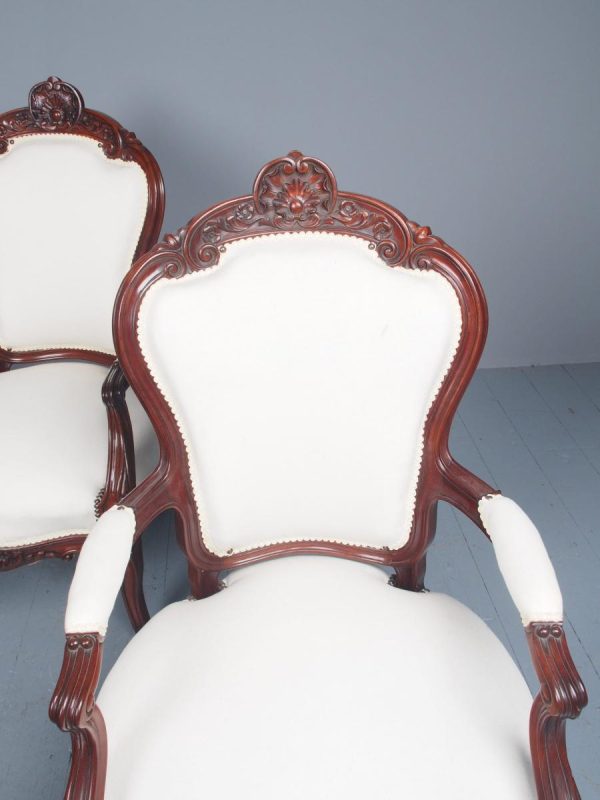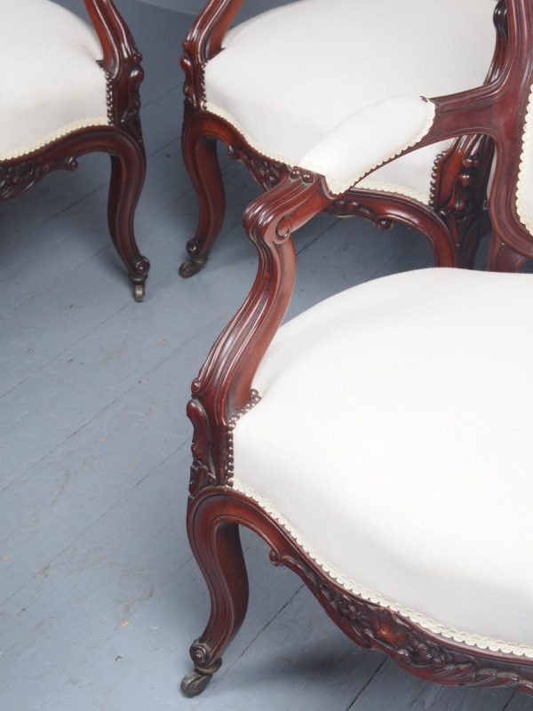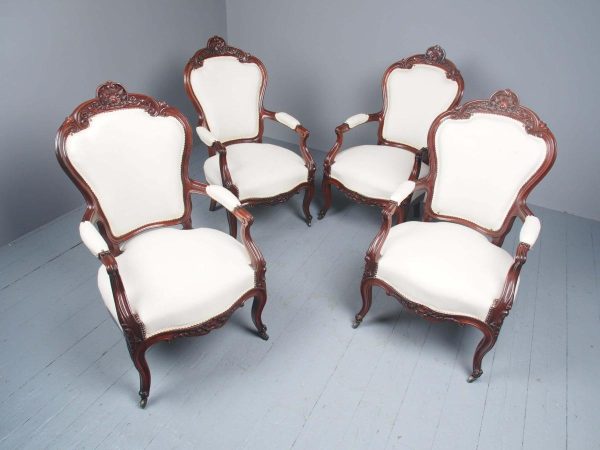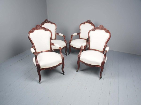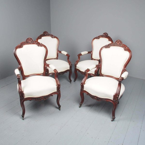 Circa 1870, exhibition quality set of 4 carved mahogany armchairs. With shaped, foliate carved back and raised top rail, with intertwined carved S- and C-scrolls and fluting to padded arms, supported on shaped uprights. The back, arms and seat all recently re-upholstered and finished in calico, with a mixture of gimp and brass studs, over shaped and carved mahogany front rails. On square, slightly outswept back legs and elegant cabriole front legs with carving, reeding and fluted over a curled toe with original brass castors.