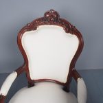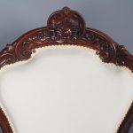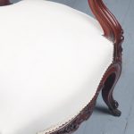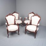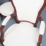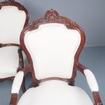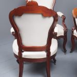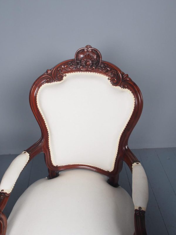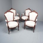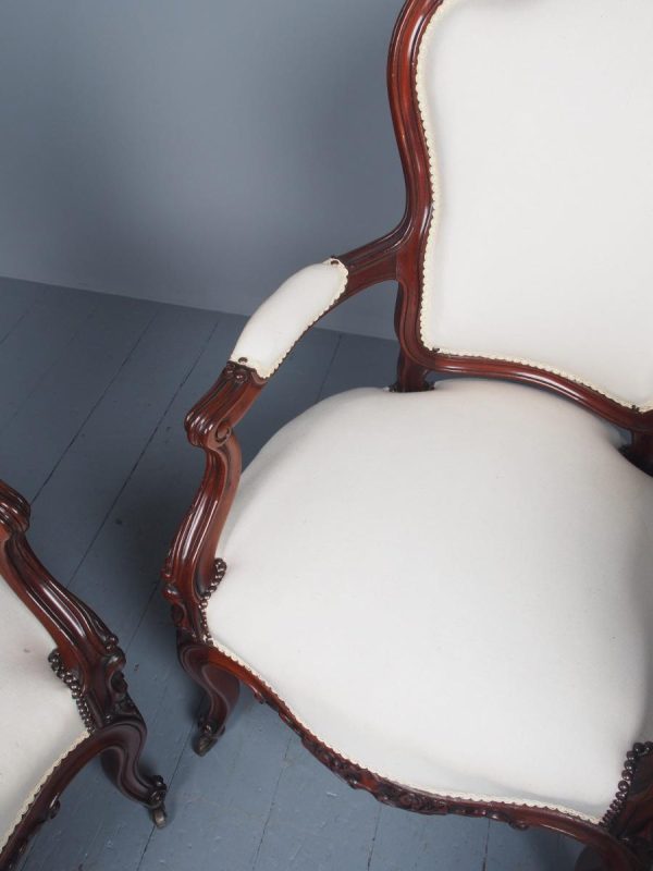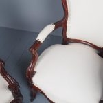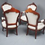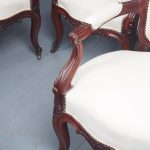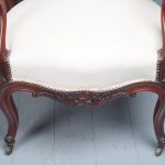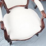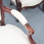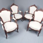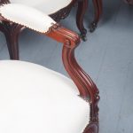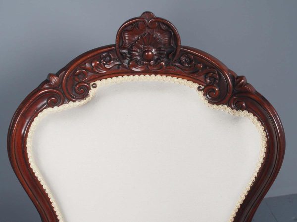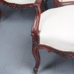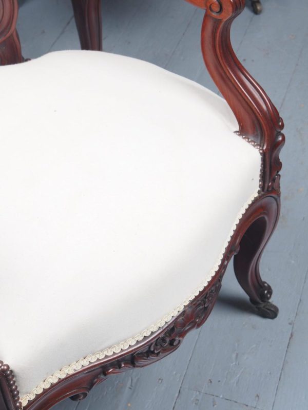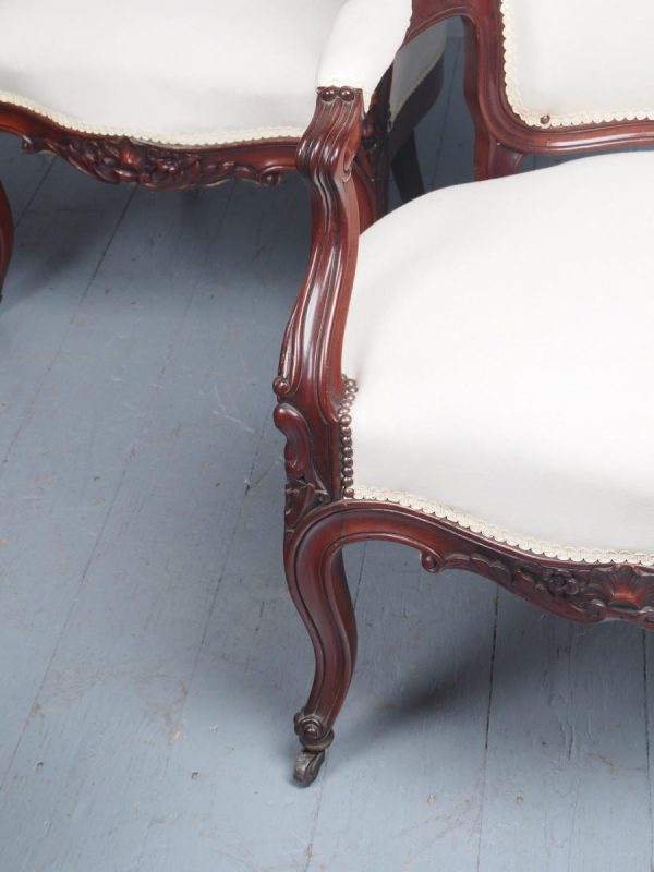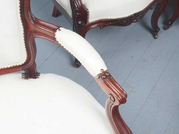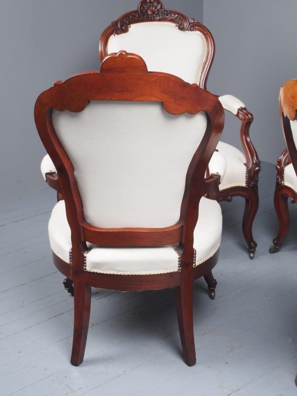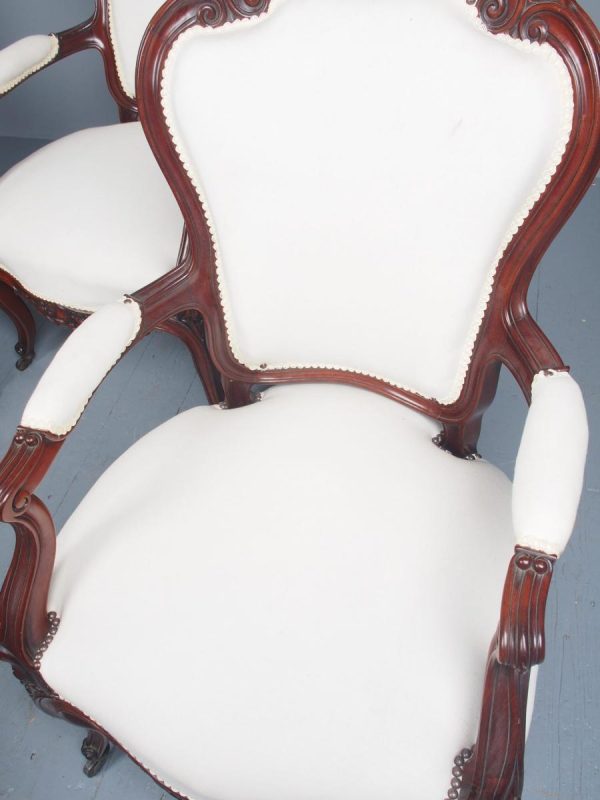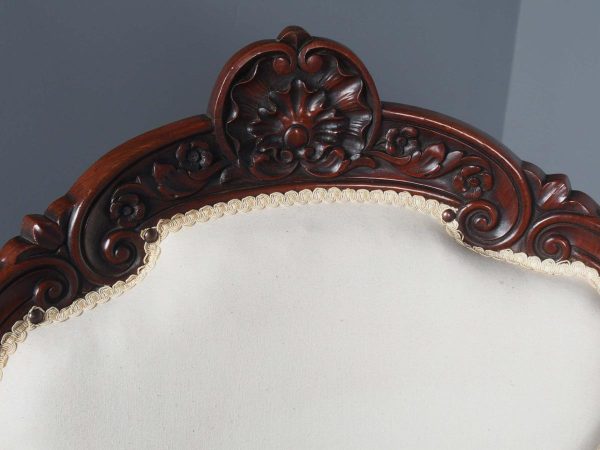 Circa 1870, exhibition quality set of 4 carved mahogany armchairs. With shaped, foliate carved back and raised top rail, with intertwined carved S- and C-scrolls and fluting to padded arms, supported on shaped uprights. The back, arms and seat all recently re-upholstered and finished in calico, with a mixture of gimp and brass studs, over shaped and carved mahogany front rails. On square, slightly outswept back legs and elegant cabriole front legs with carving, reeding and fluted over a curled toe with original brass castors.