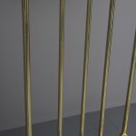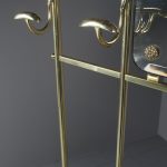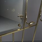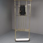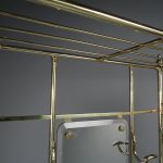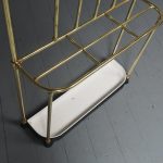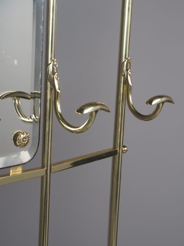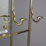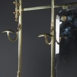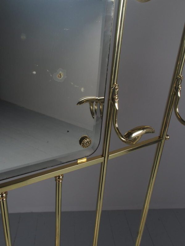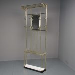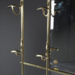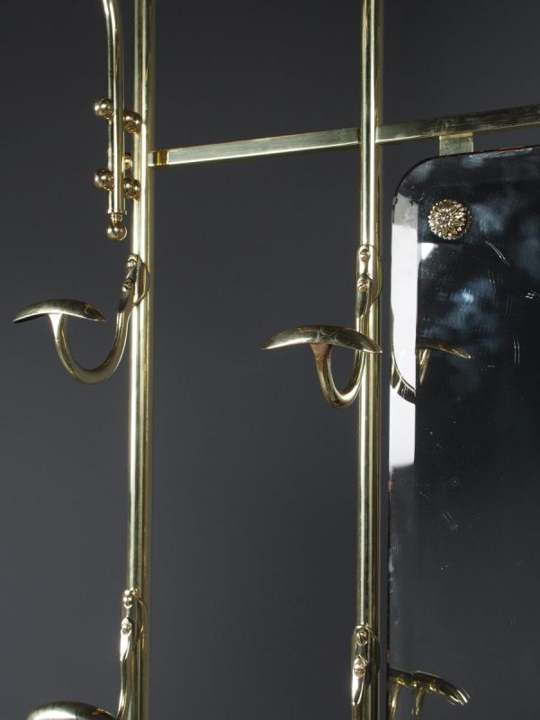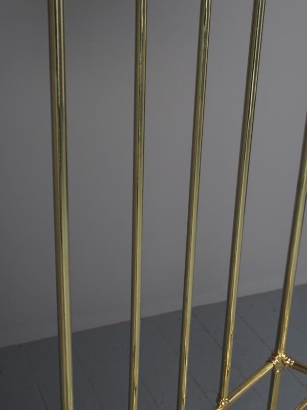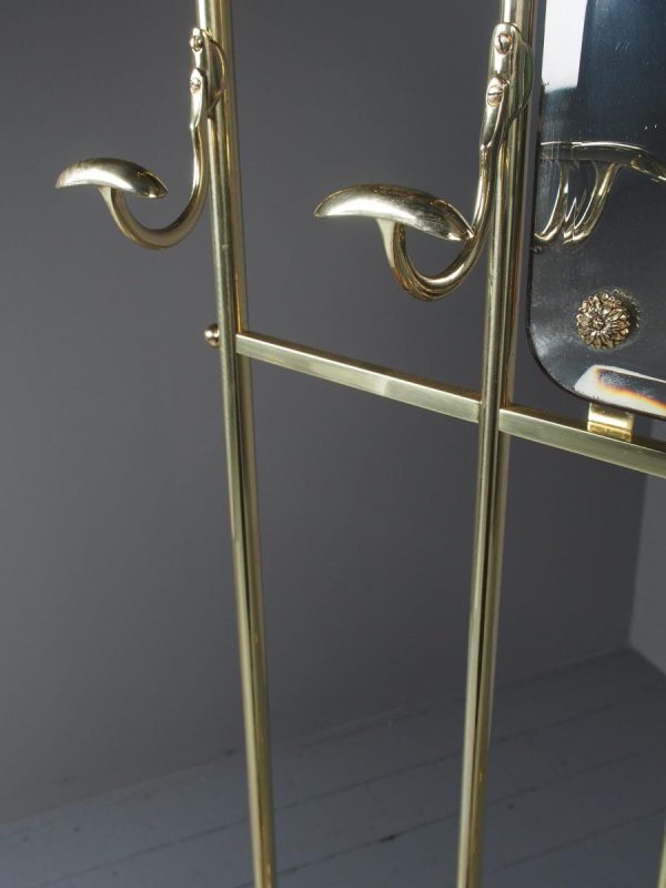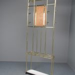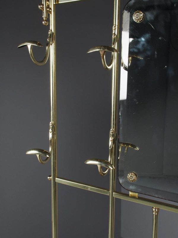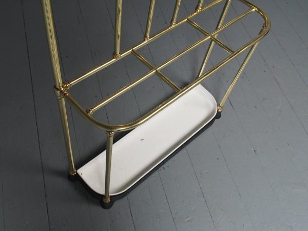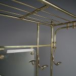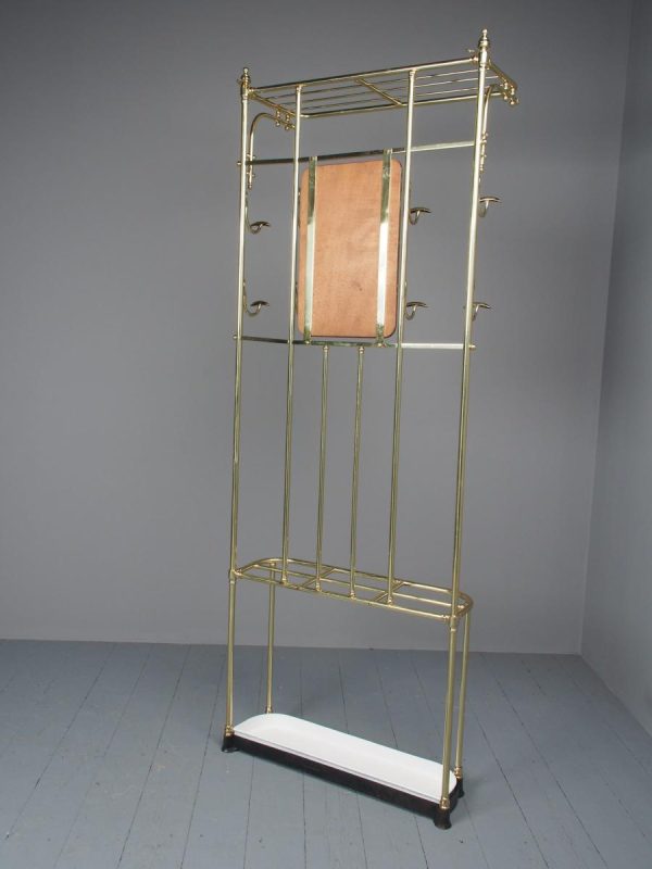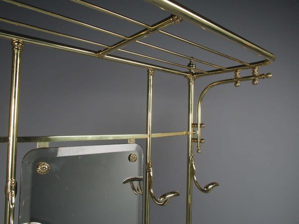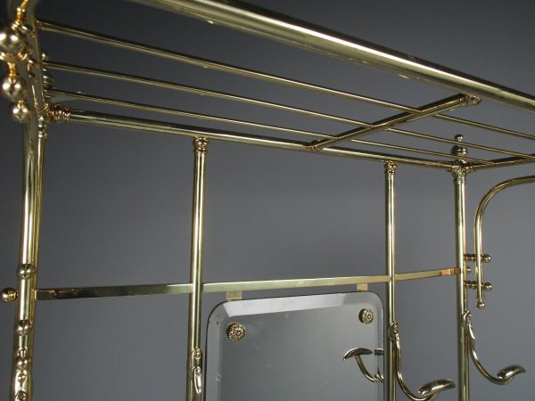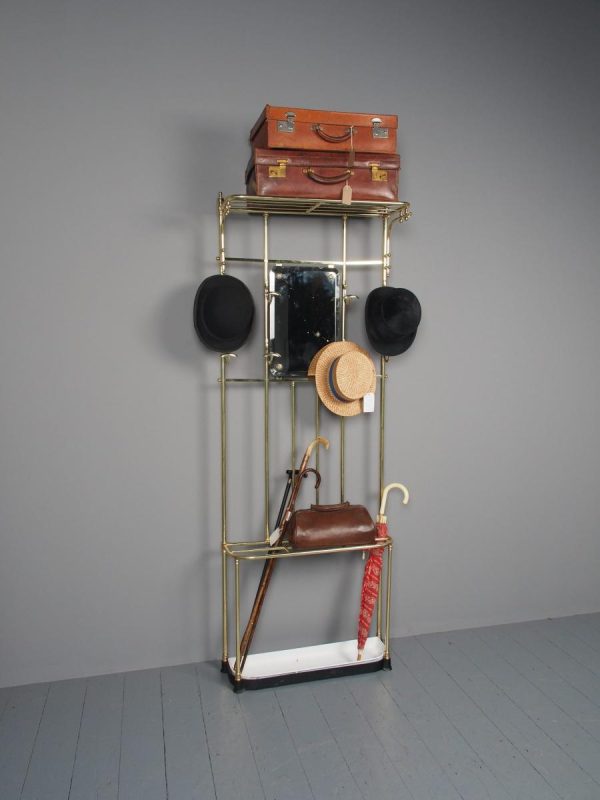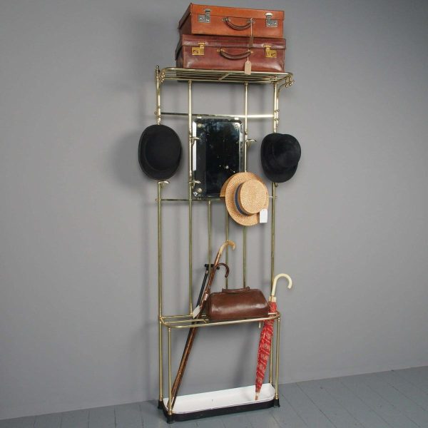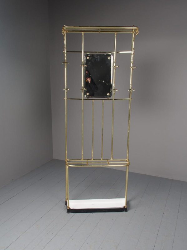Circa 1900, rare exhibition quality, late Victorian cast brass hall stand. Of substantial size and made with curved brass rods of various gauges, with an unusual shaped over-shelf to the top and surmounted with finials to back. With central rectangular bevelled edge mirror with rounded corners, which is secured by cast brass flower-head screws. This is surrounded by 6 elegant cast brass hooks, over a D-shaped 6 division stick stand and a painted (removable) drip tray with a cast iron base.