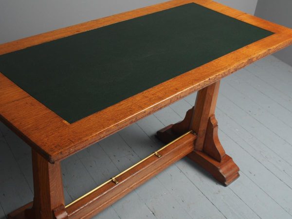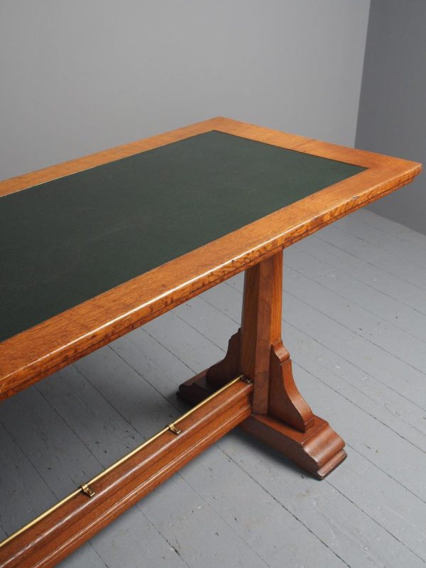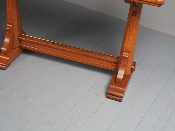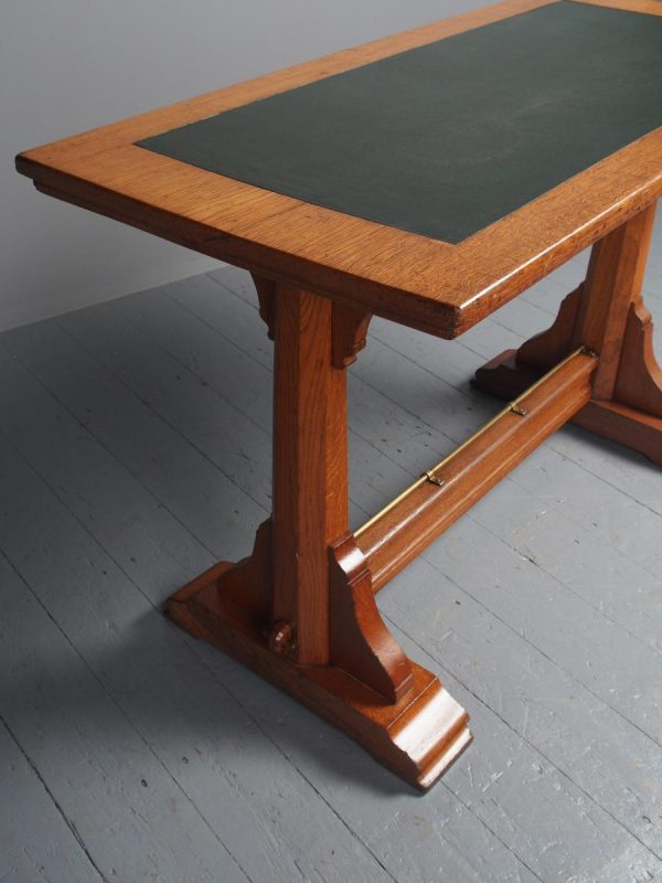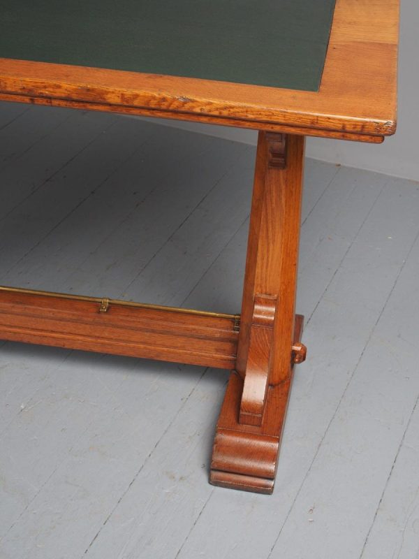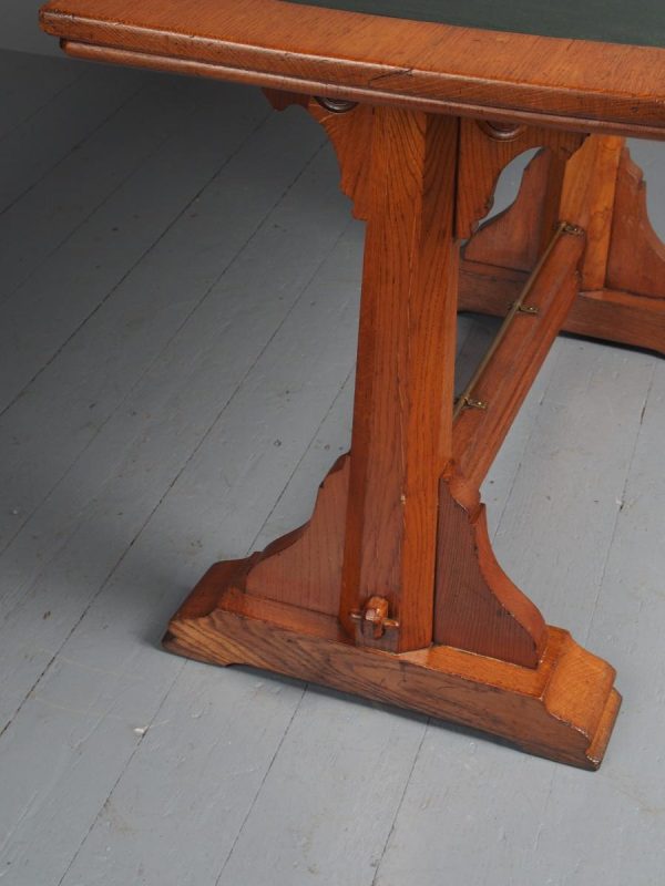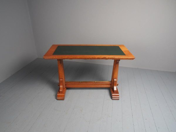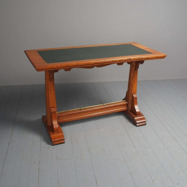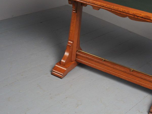Circa 1870, Victorian oak library table. The rectangular top in beautifully figured, quarter cut oak with a green leather writing inset, supported on tapering octagonal legs with Gothic trifoil brackets on top and shaped buttresses beneath. This is over twin plinth bases of peg construction with a deep stretcher with brass protection between them.