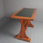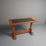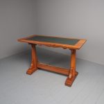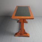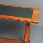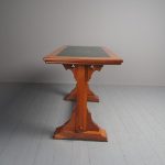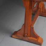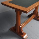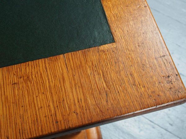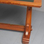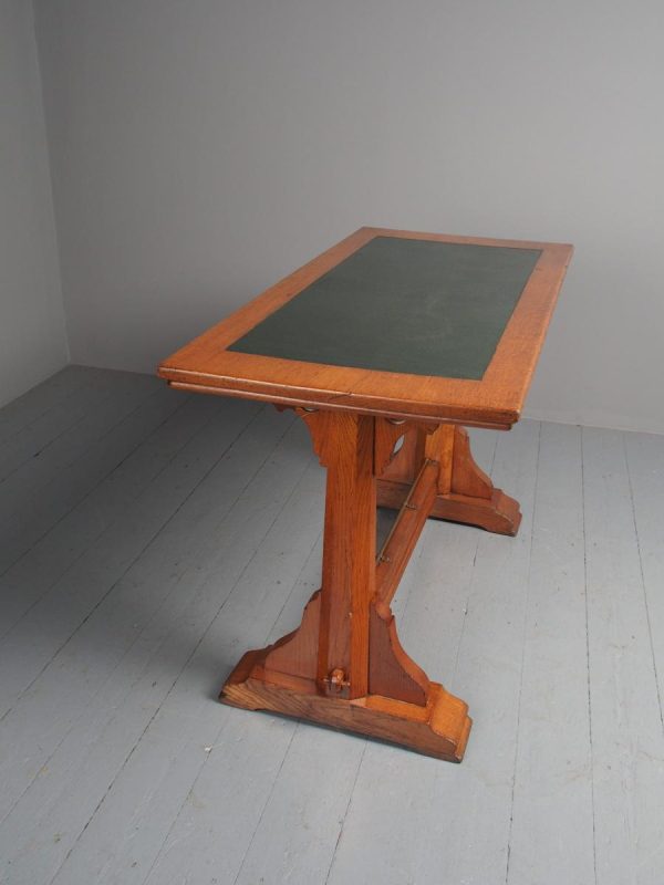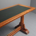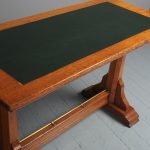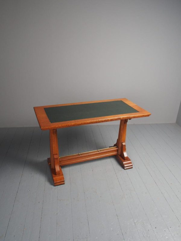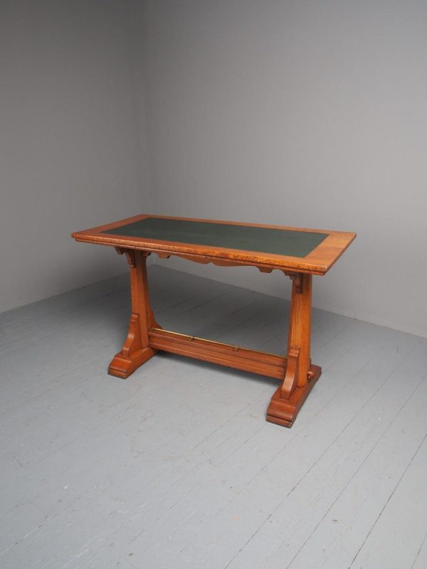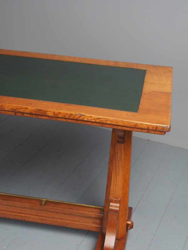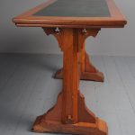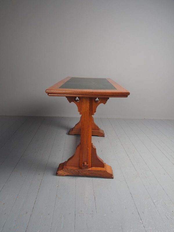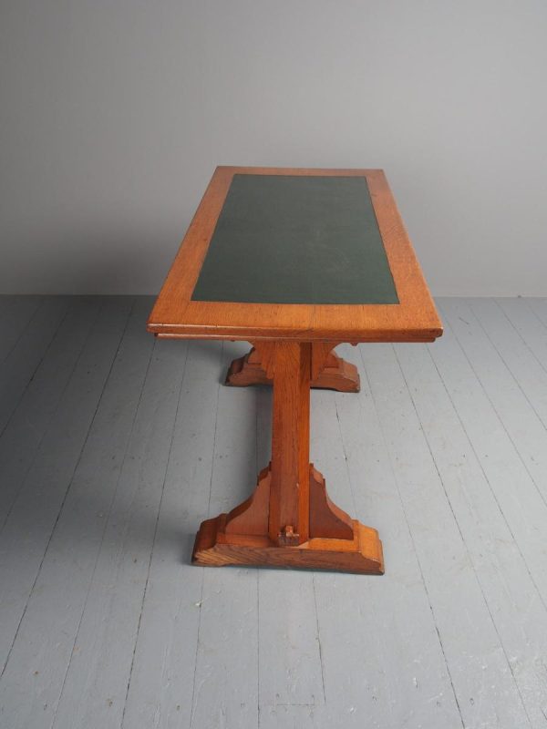 Circa 1870, Victorian oak library table. The rectangular top in beautifully figured, quarter cut oak with a green leather writing inset, supported on tapering octagonal legs with Gothic trifoil brackets on top and shaped buttresses beneath. This is over twin plinth bases of peg construction with a deep stretcher with brass protection between them.