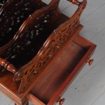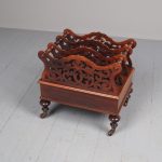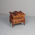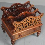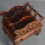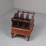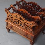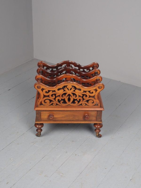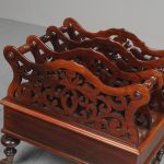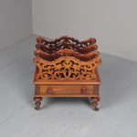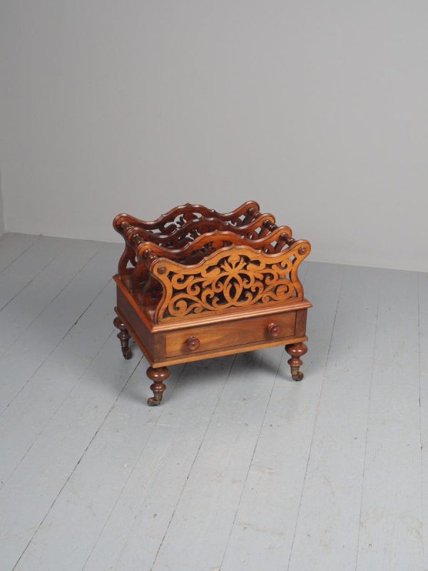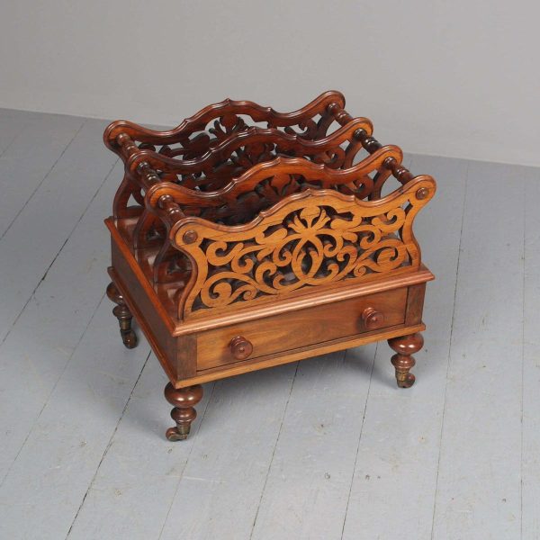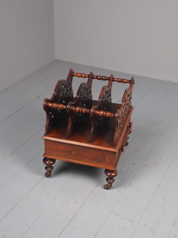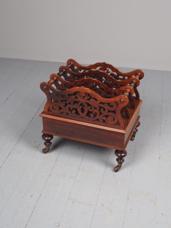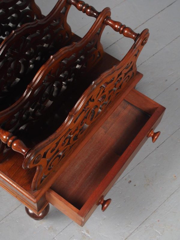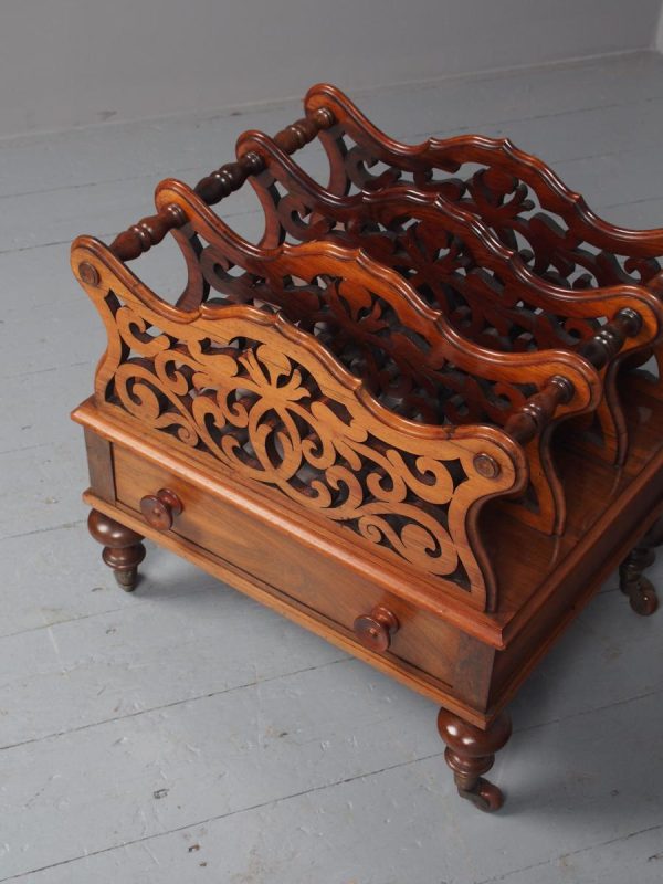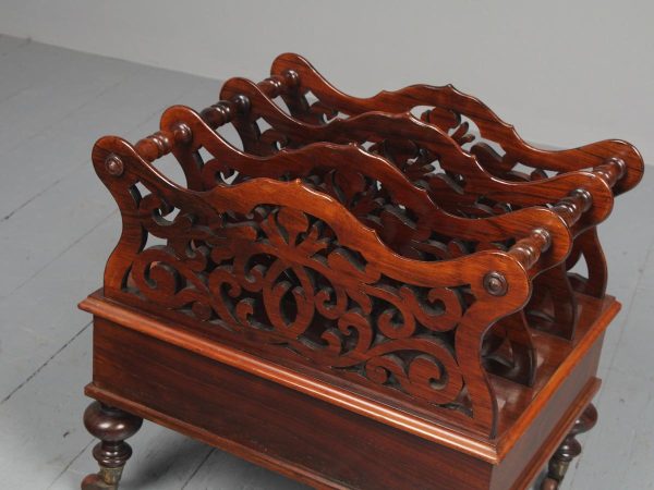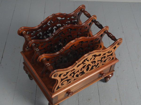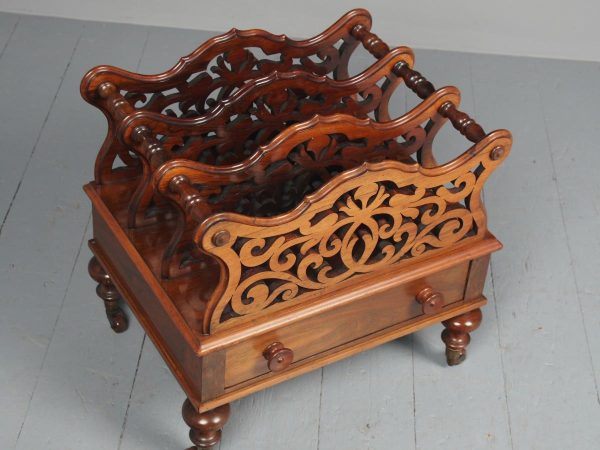 Circa 1860, Victorian rosewood canterbury. The 3 divisions with fluted, shaped top rails over foliate fretwork panels with interconnected bobbin turnings over a frieze drawer with mahogany liners and twin turned knobs. All supported on turned feet with original brass caps and brown porcelain castors.