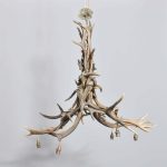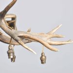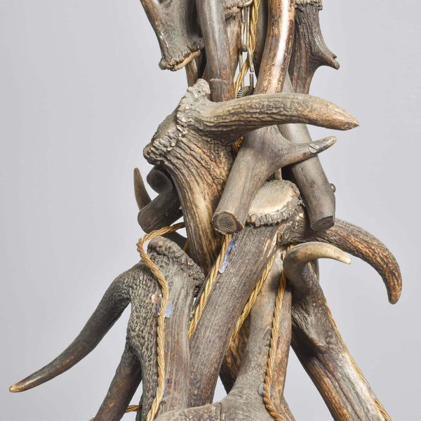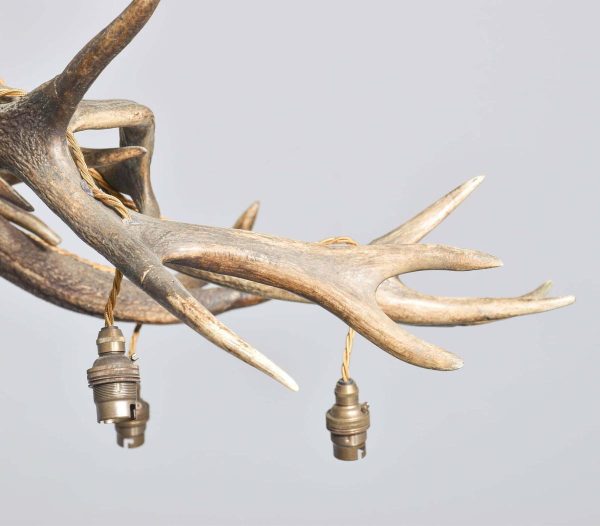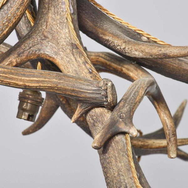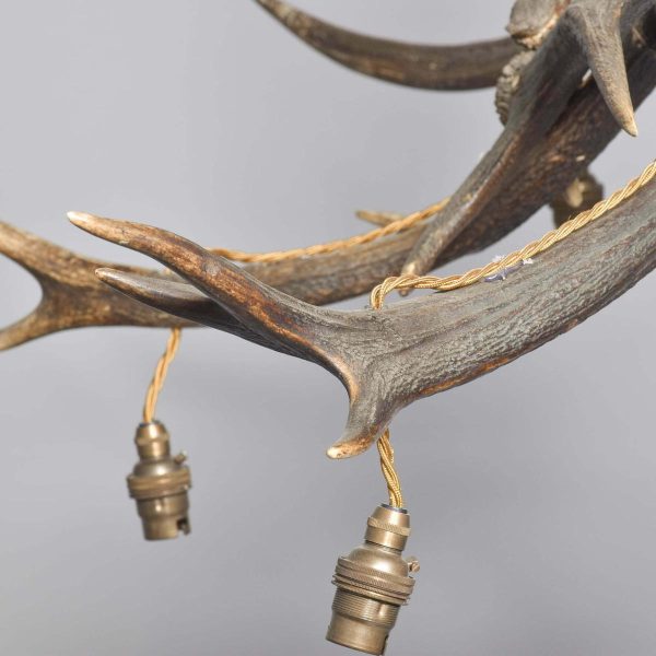 Circa 1920s, unusual chandelier made from antler horns. Supported on a brass chain with a pressed brass cap. Consisting of multiples of intertwined horns, dissected by larger antlers with 6 hanging light fittings. Recently wired with 3 cord gold flex (and earthed).
