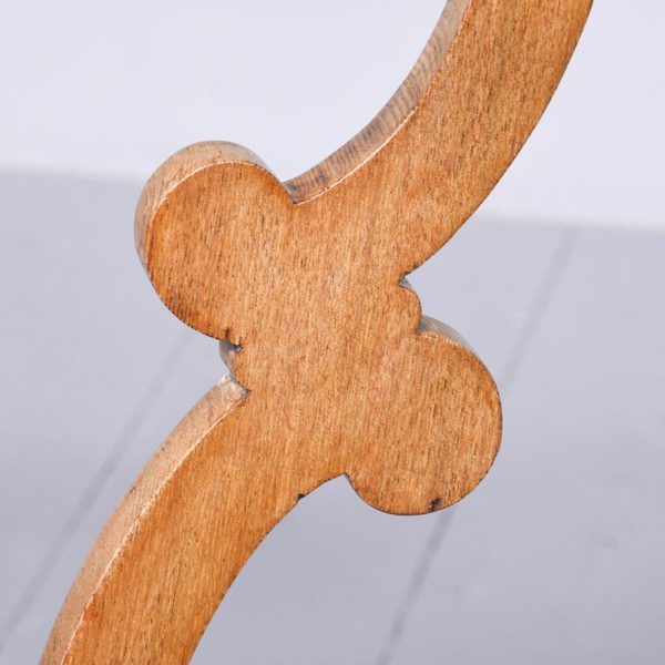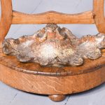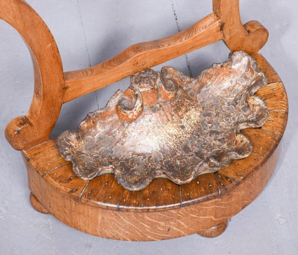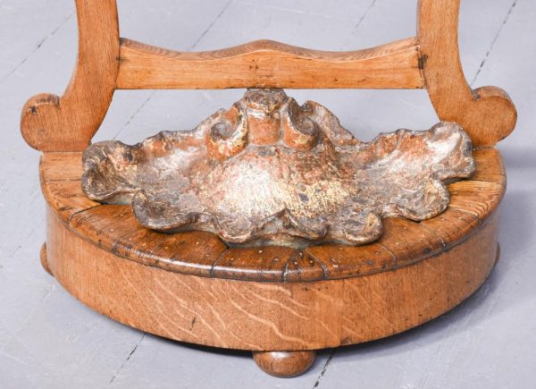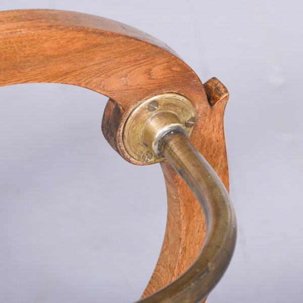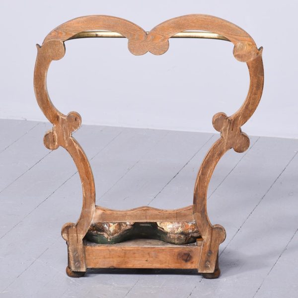 Circa 1890. Rare and stylish Art Nouveau brass and oak stick stand with a rustic, cast iron drip tray. The stand in figured oak with heart shaped back, shaped cross stretcher with curved brass rail to the front. The base with a cast iron rustic drip tray is supported on a semi-circular base over neat bun feet.