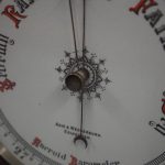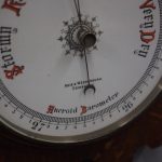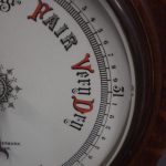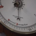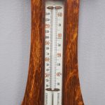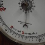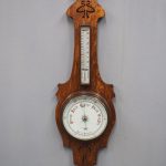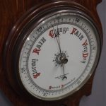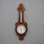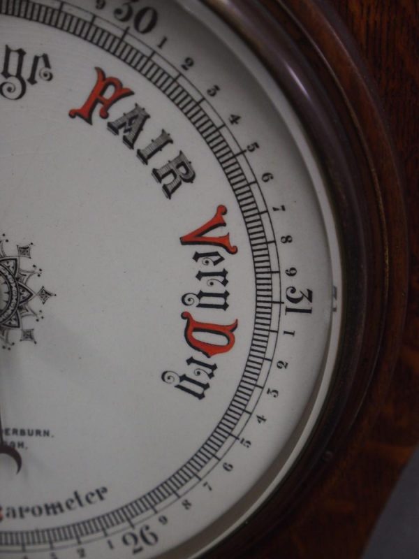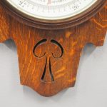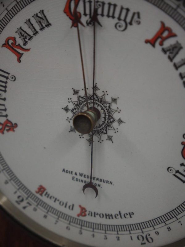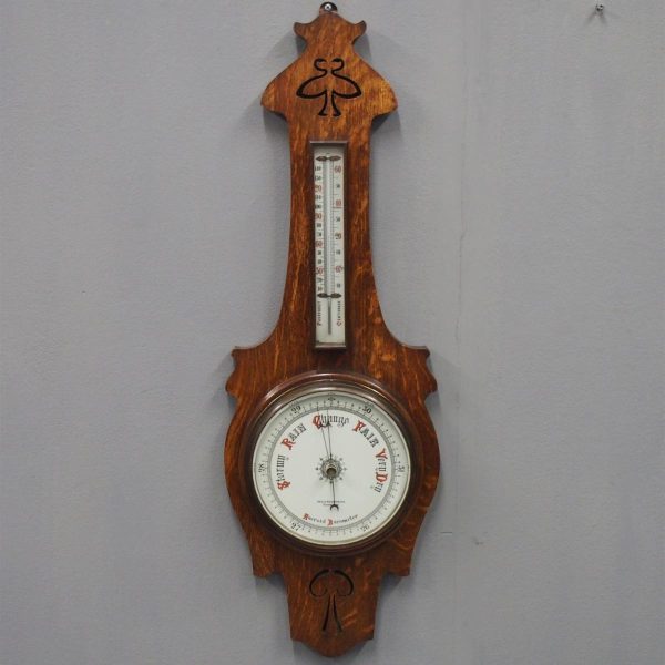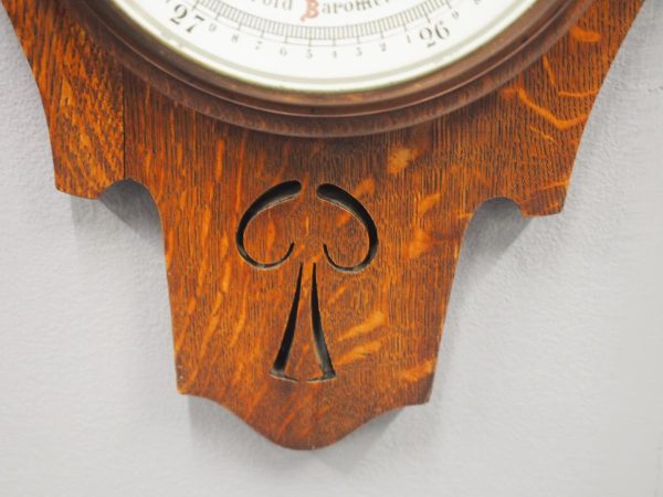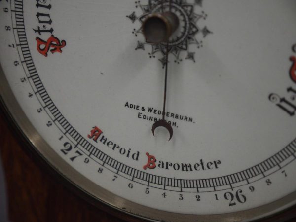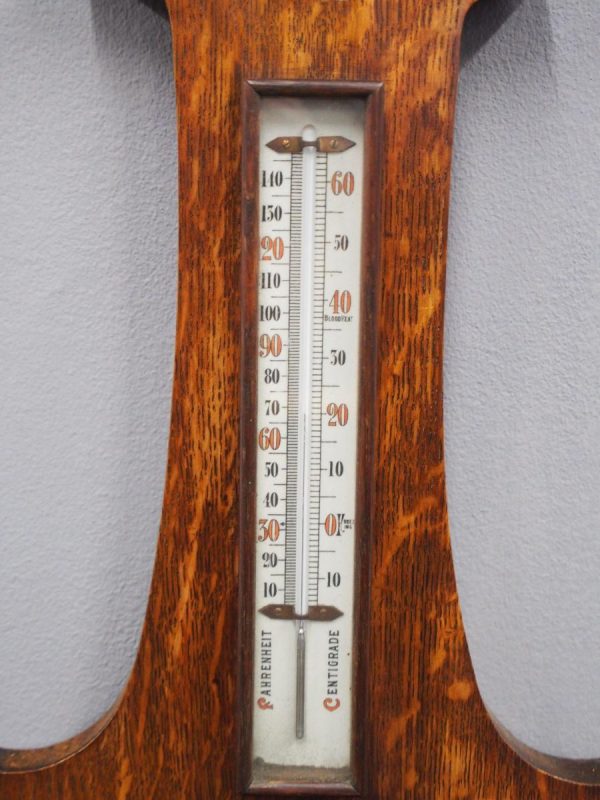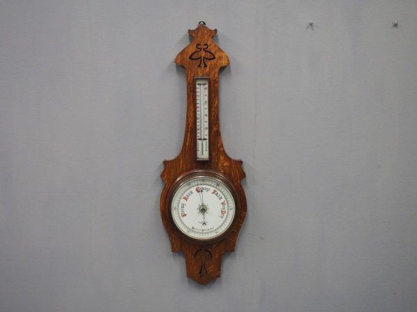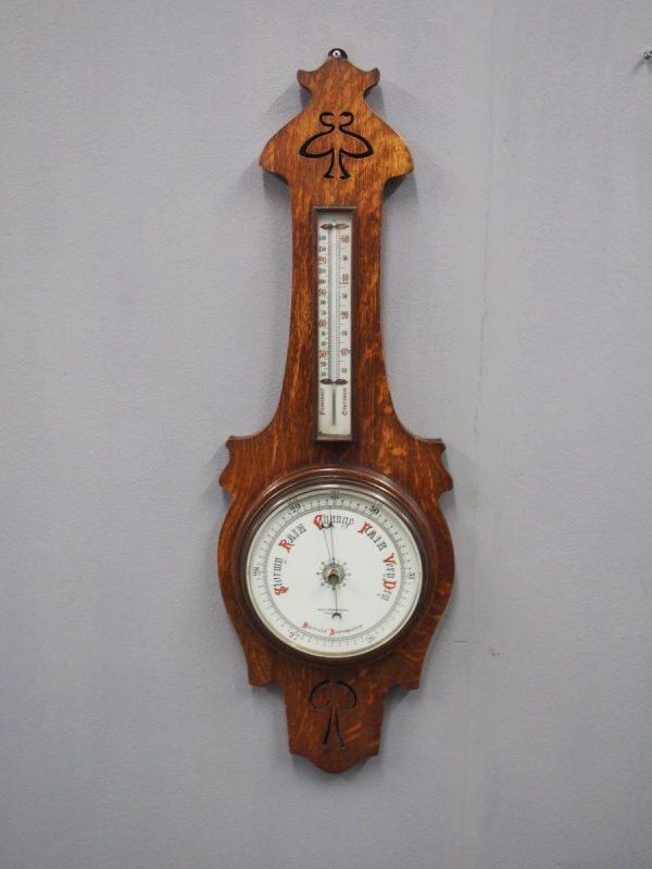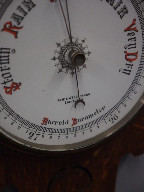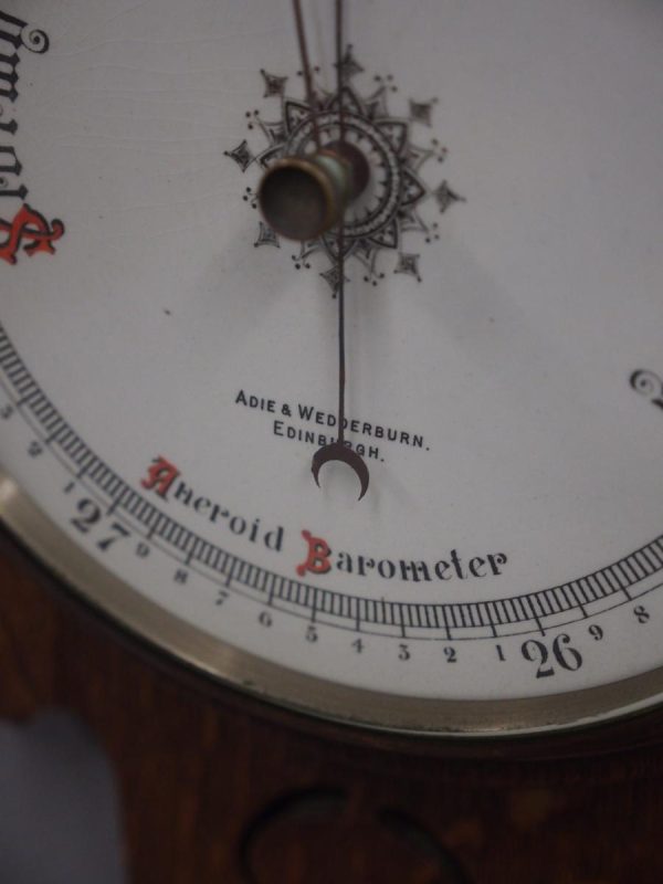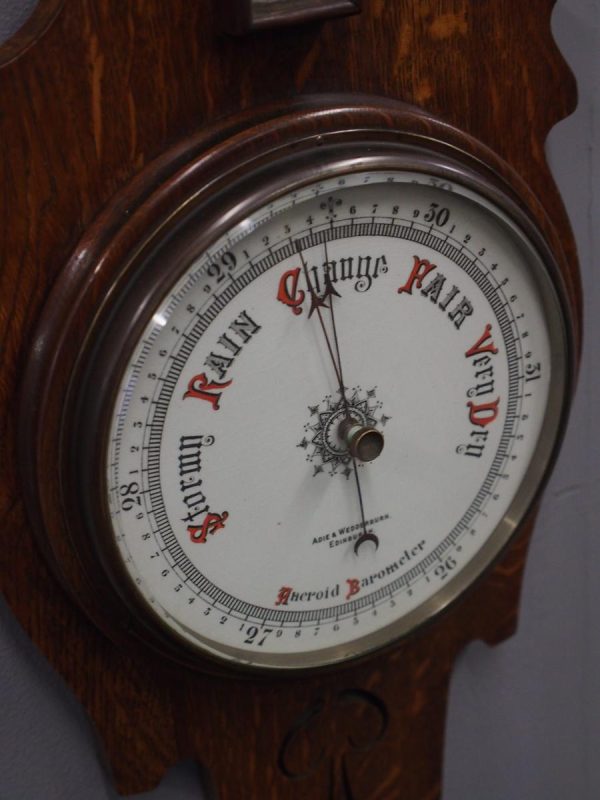 Circa 1900, Edwardian Art Nouveau oak barometer. The solid oak frame barometer has a shaped and fretwork top, and a cased, glazed thermometer and at the base a circular barometer. The barometer has a porcelain face and has been made by Adie & Whether Burn of Edinburgh, famous registered and highly regarded instrument makers. There’s a sweeping adjusting arm in the centre of the glass which is held in place in this brass Bessel, above an Art Nouveau shape.