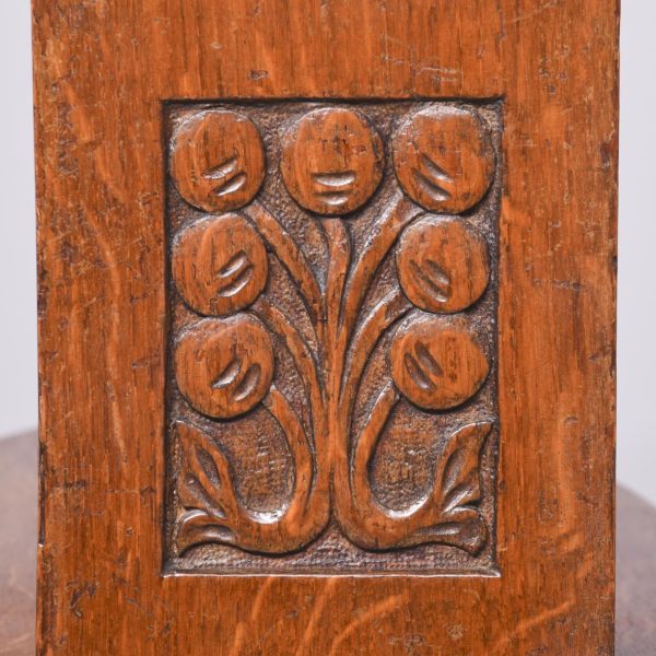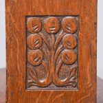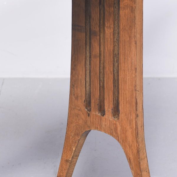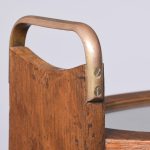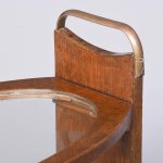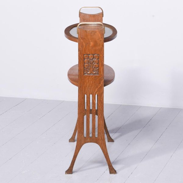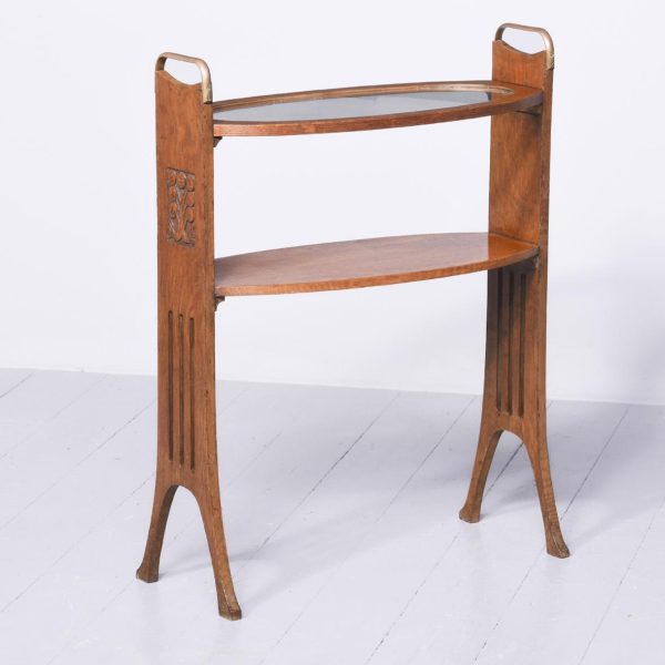 Circa 1900. An interesting Art Nouveau oak, glass, and brass oval two tier occasional table, surmounted by a pair of cast brass lifting handles, the top tier with a glass insert, the lower tier in solid oak. The table is supported on two solid and pierced ends, top section with foliate carving with piercing towards the base, resting on four splayed legs.