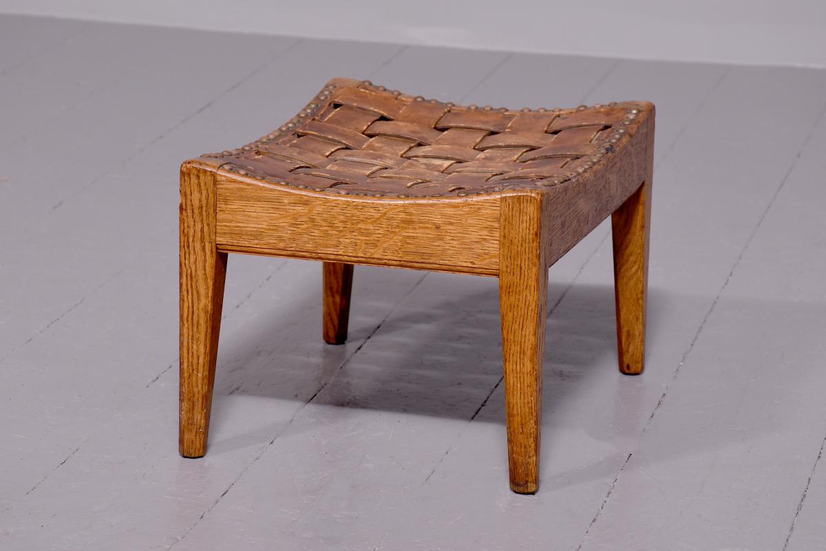 Circa 1900. A neat sized leather top oak framed stool with curved top with the seat made from intertwined leather straps held in place by brass studs, resting on four square tapering legs. The stool almost certainly by ‘Arthur W Simpson, Kendal’. See stock number 34722 for a similar example.