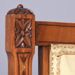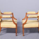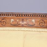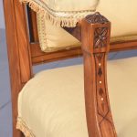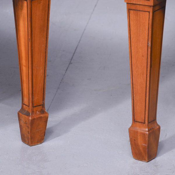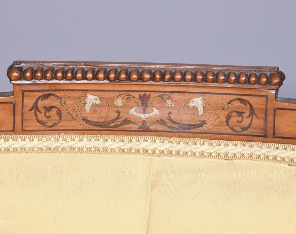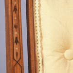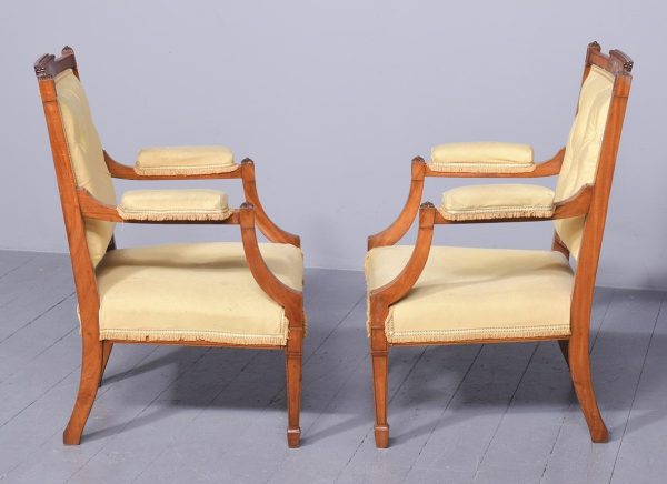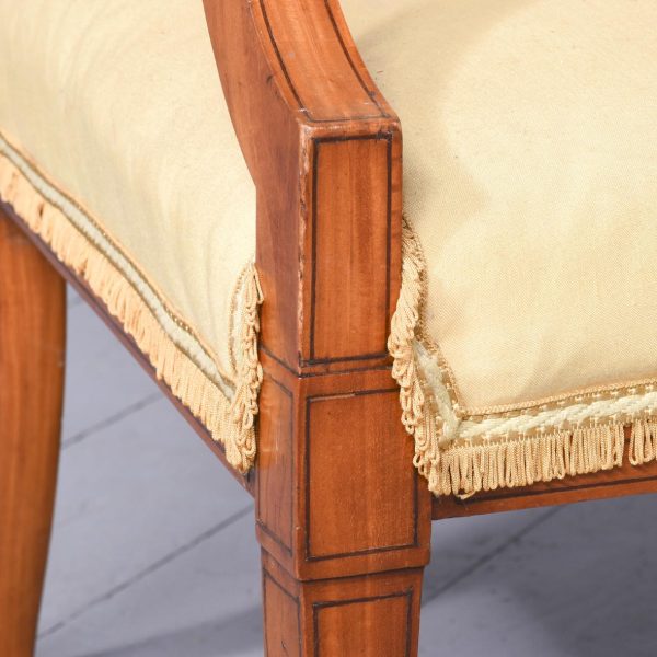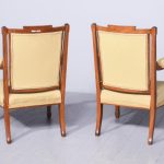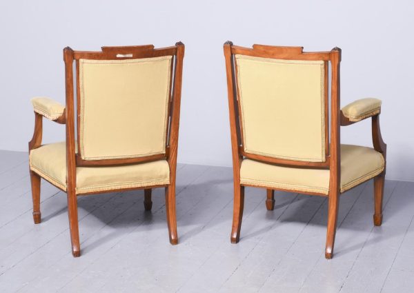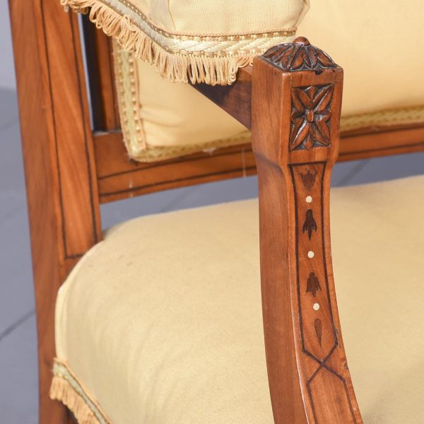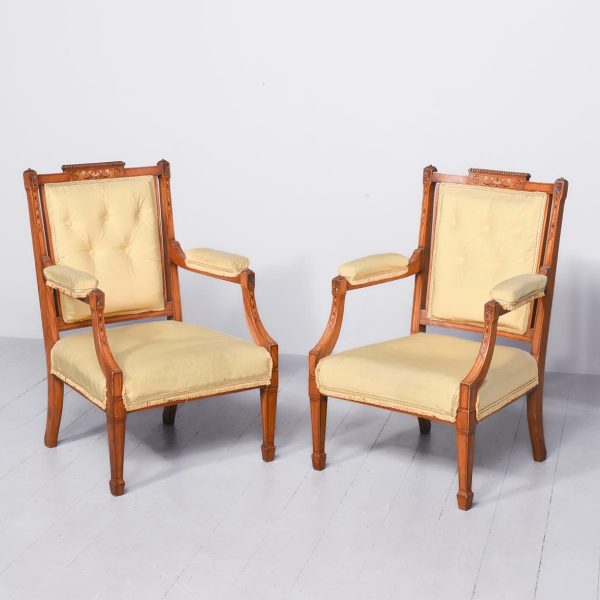 Circa 1880. Attractive pair of late Victorian inlaid solid satinwood armchairs of superb quality. The top rail with fluted decoration and panel with satinwood, ivory (registered) and ebony marquetry inlay above a buttoned, upholstered panel back flanked by uprights with neoclassical style inlay. The partially padded arms on shaped inlaid supports over the overstuffed seat (upholstery good but could do with refreshing) all supported on inlaid tapering square feet with spade toes in front and outswept rear supports.