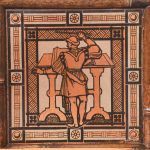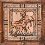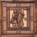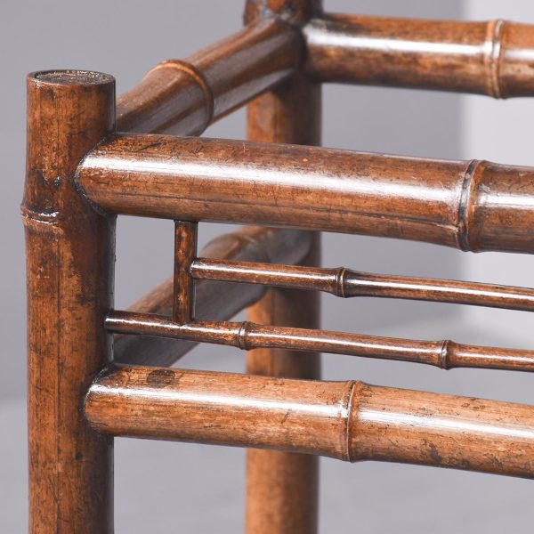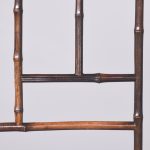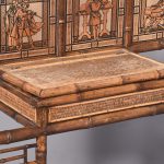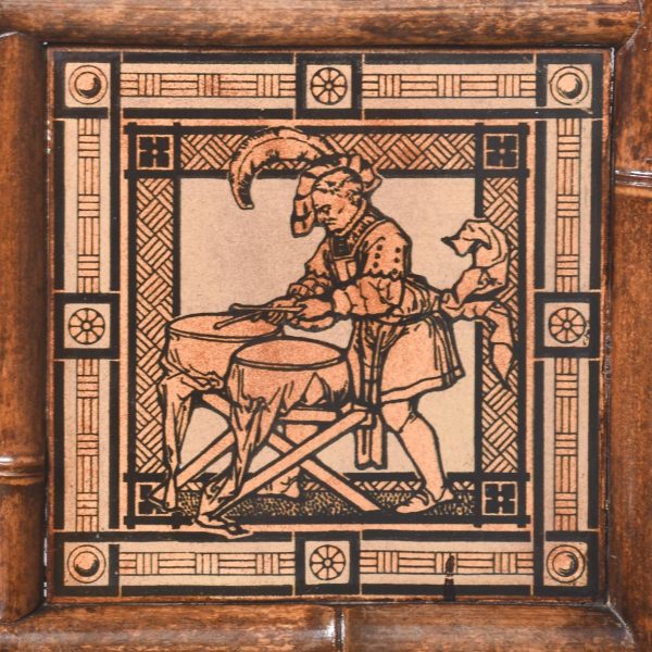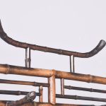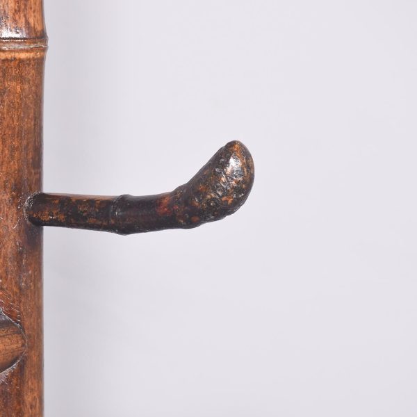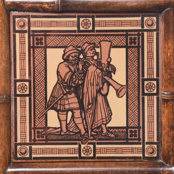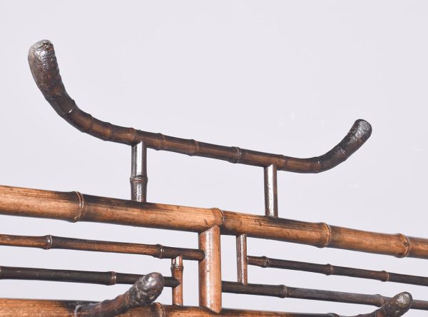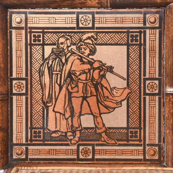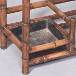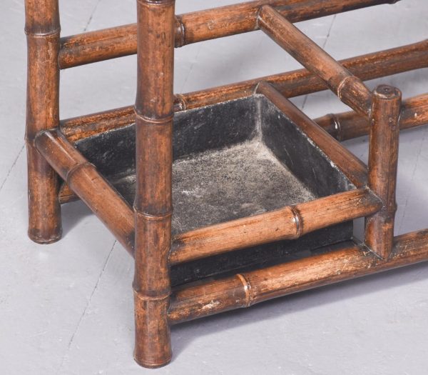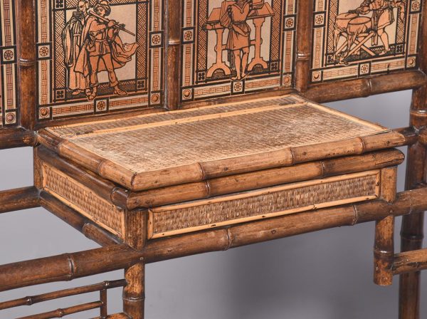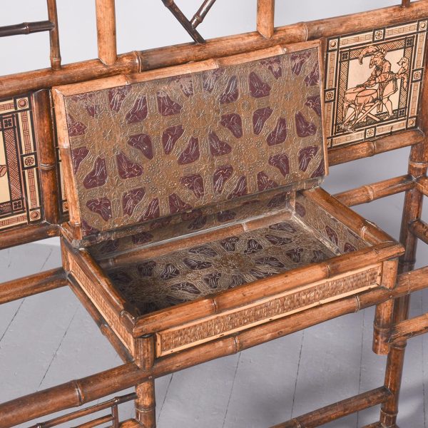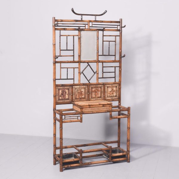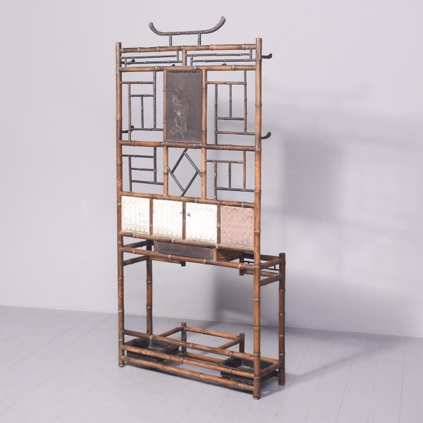 Circa 1870. Mid Victorian mirrored back bamboo, tiled and rattan hallstand in the Anglo-Japanese style, the top surmounted by a shaped raised piece of bamboo supported on bamboo uprights the hall stand with the original beveled edge mirror in the center ( foxed), supported by the bamboo frame, the hallstand incorporates 6 shaped hooks and several panels of different shapes formed in bamboo the lower back with 4 English decorative tiles, showing musicians and a conductor, the small flat surface with a hinged rattan top and with stylish anaglyptic wallpaper inside. With 2 metal drip trays supported by bamboo framing, the hall stand is wonderful style and elegance
