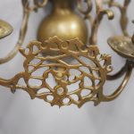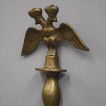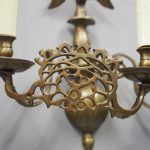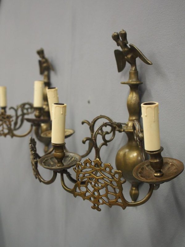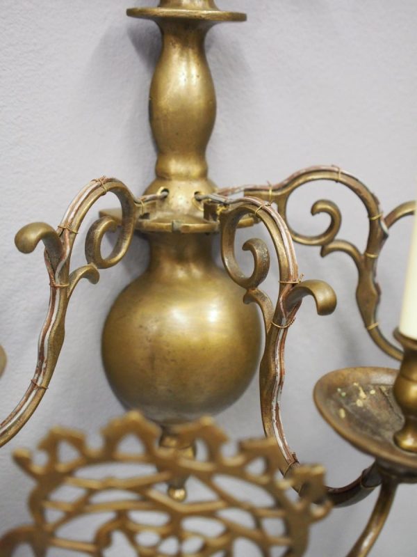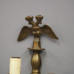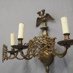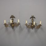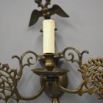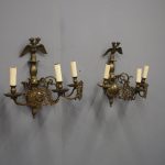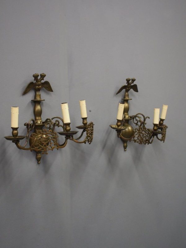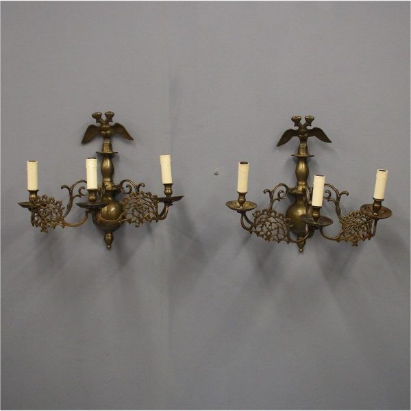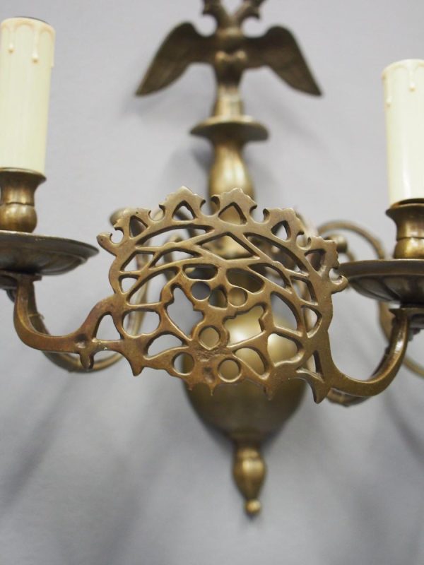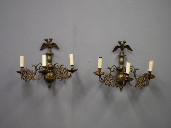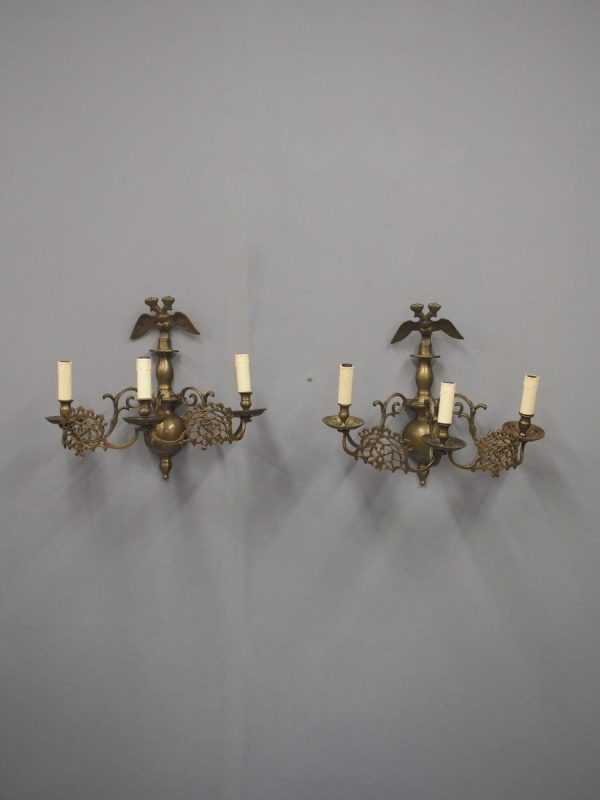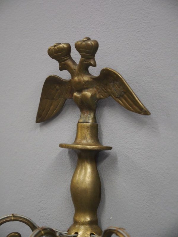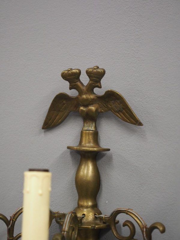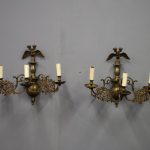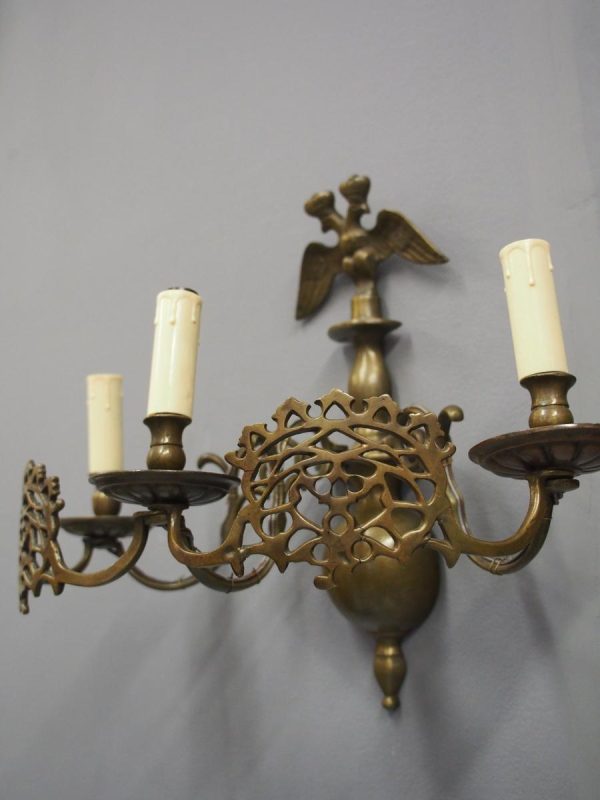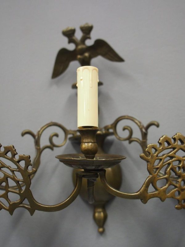 Circa 1900, large pair of baroque-style bronze wall sconces. The baluster shaped back plates surmounted by twin headed eagles supporting 3-light holders on curved supports. These are connected by an open foliate basket and are now electrified.