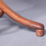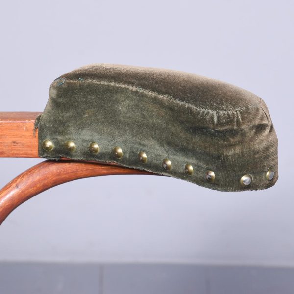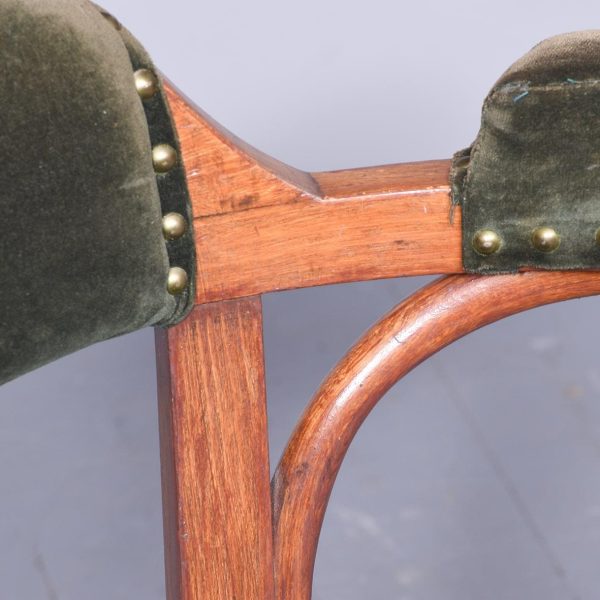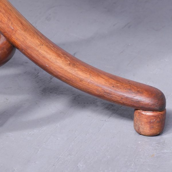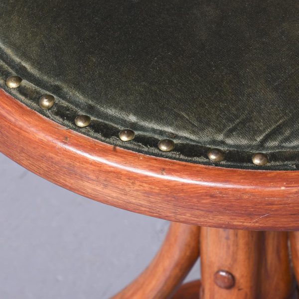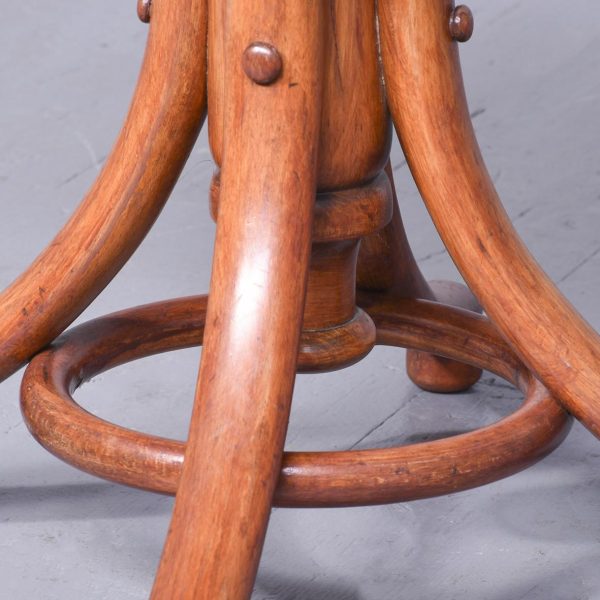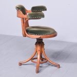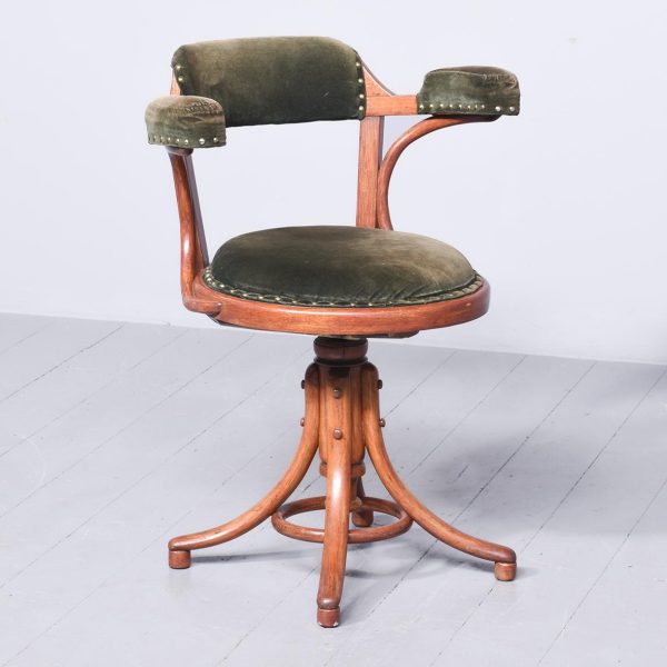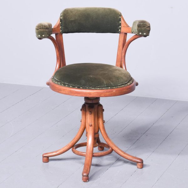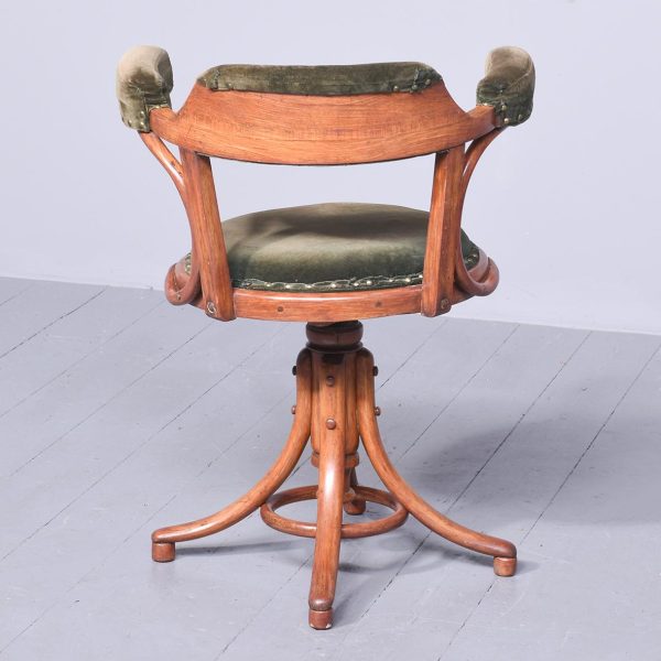 Circa 1920s. An unusual stylish bentwood circular revolving desk chair, with a raised paddle back and arm rests which are supported on two uprights. The circular seat with a drop in upholstered pad. Beneath the top there is a revolving mechanism, and the chair rests on a central stem with four saber bentwood legs braced by a circular stretcher, all resting on four simple turned feet.