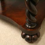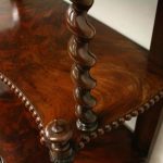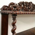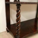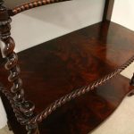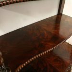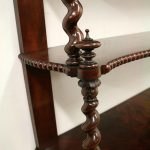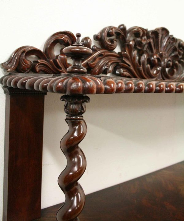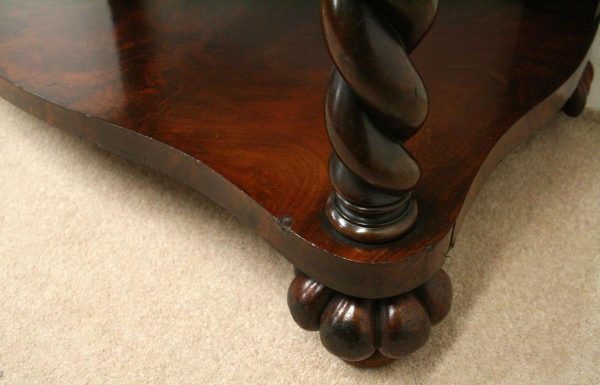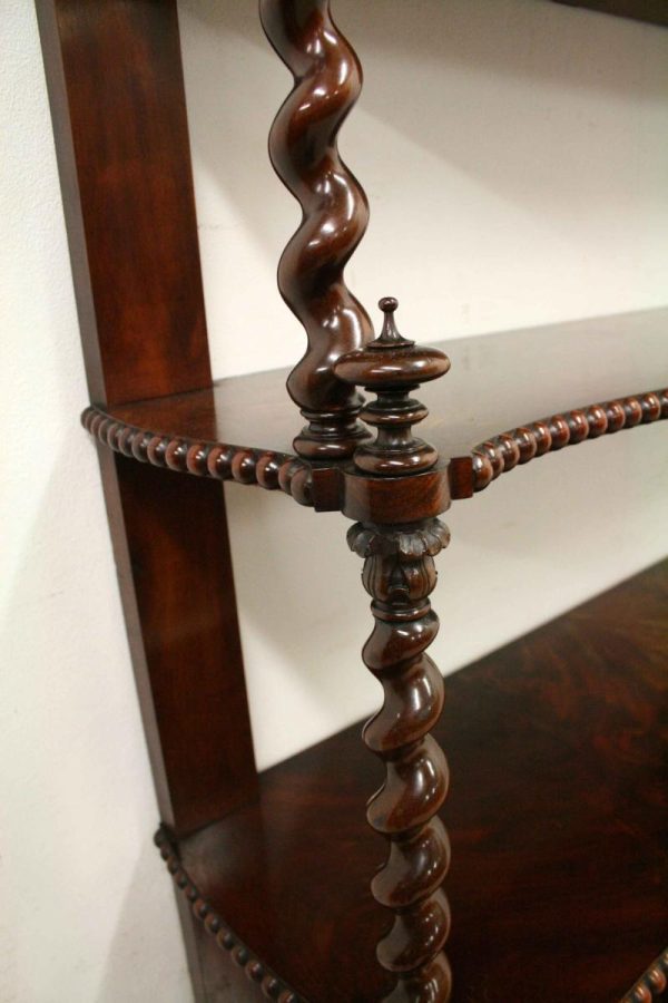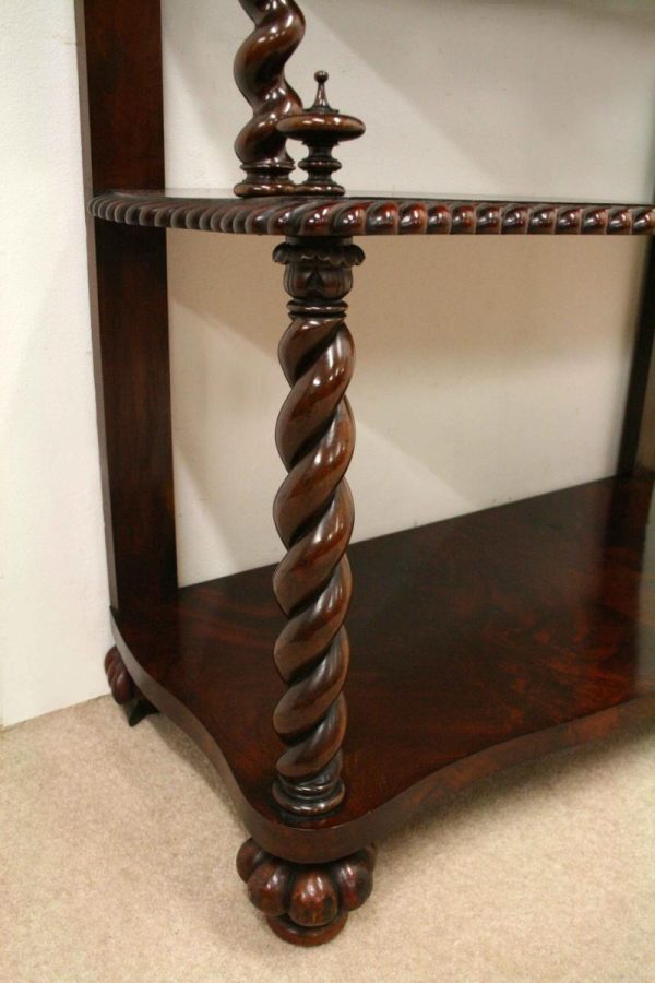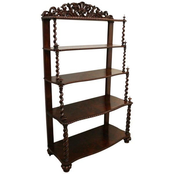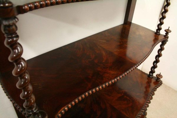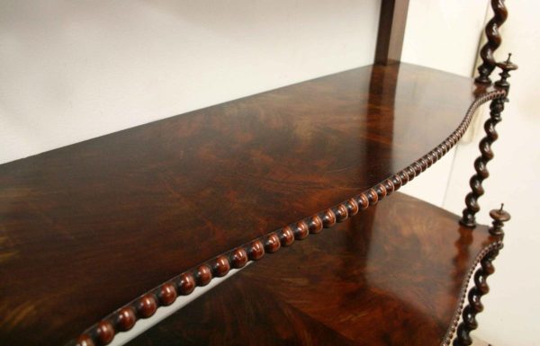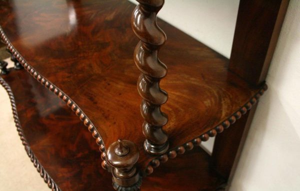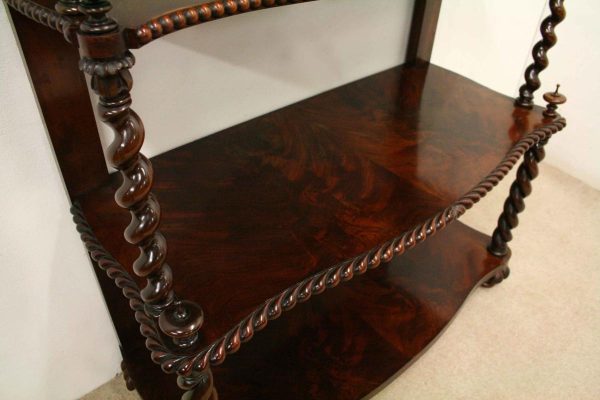 Circa 1840, exhibition quality Biedermeier flame mahogany waterfall whatnot/buffet. The top tier has a profusely carved back ledge with open fretwork, flowers and wonderful carving. There are five serpentine shaped tiers with matching flame mahogany veneers, the top four with stylish gadrooning to the fore edge. Each tier is supported by tapering barley sugar columns topped with finials. The bottom tier has veneered fore edge, and the whole piece stands on fine turned and fluted bulbous feet. Great colour and patination. Wonderful piece of Victorian cabinet making.