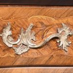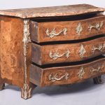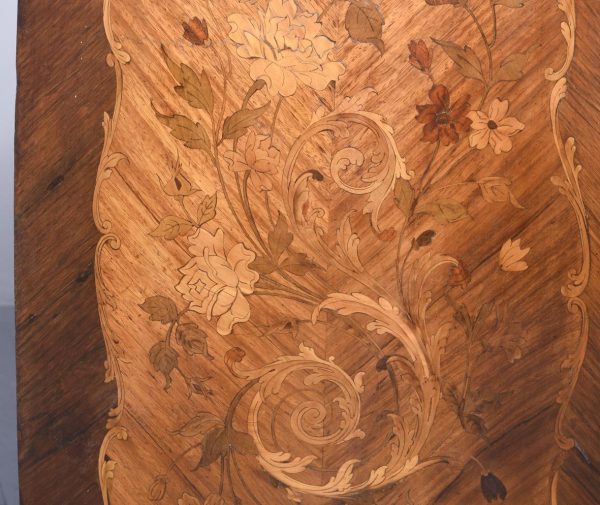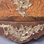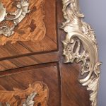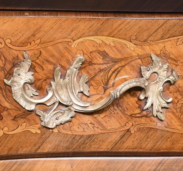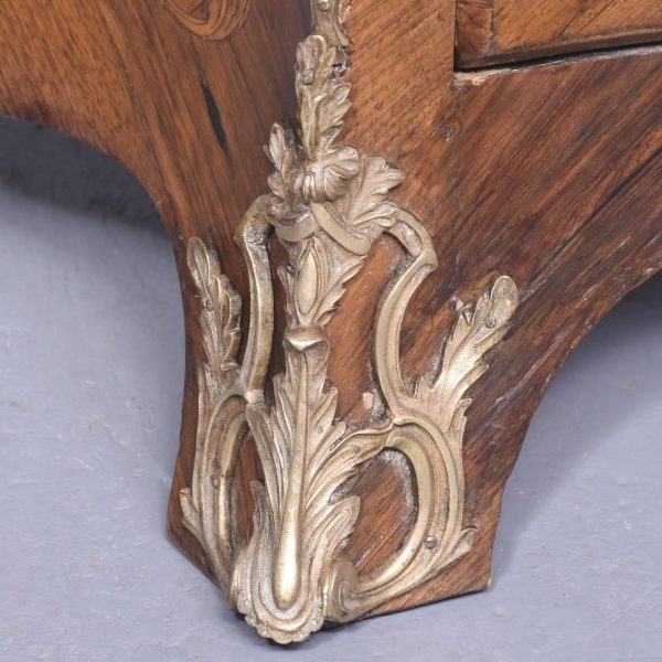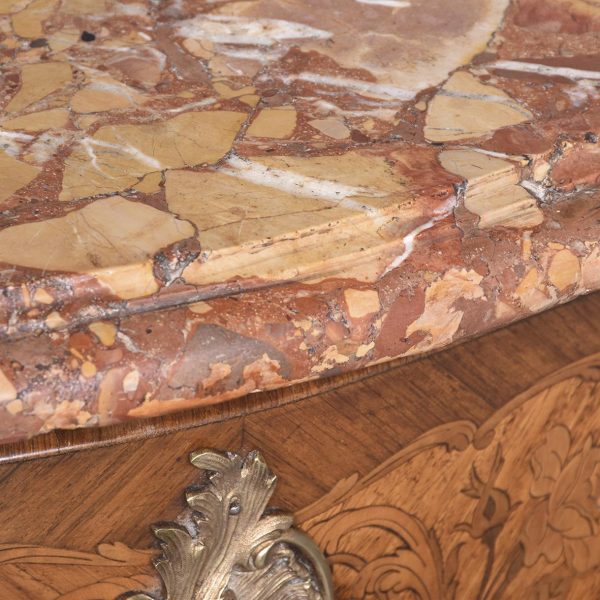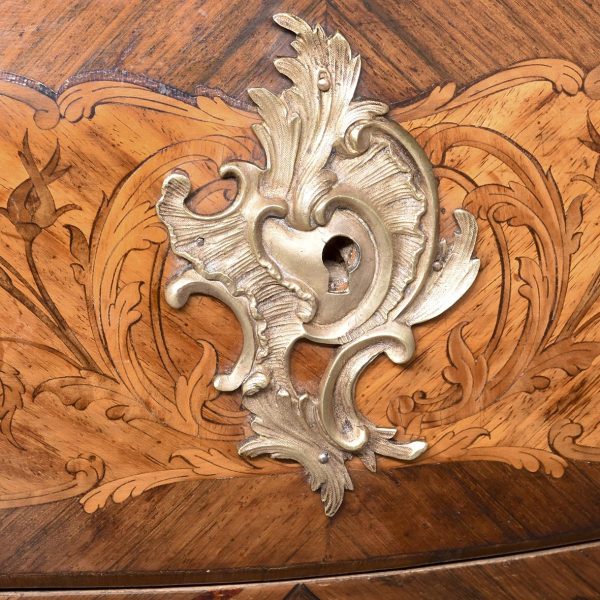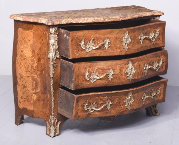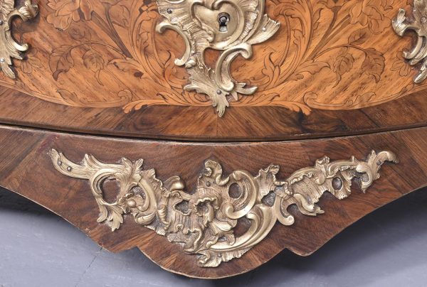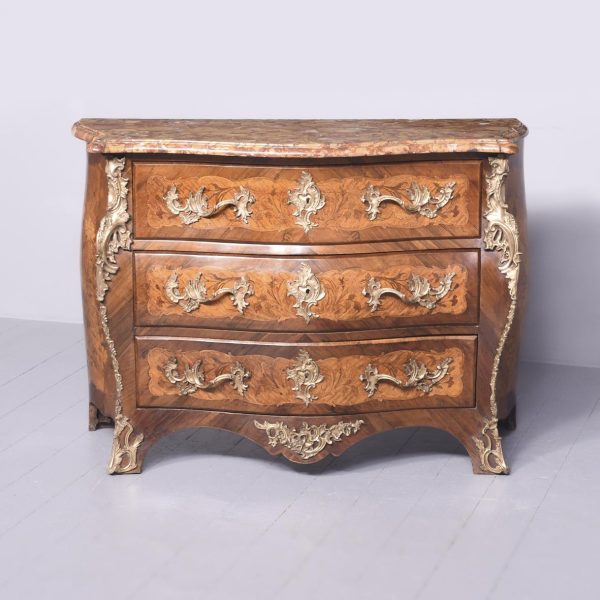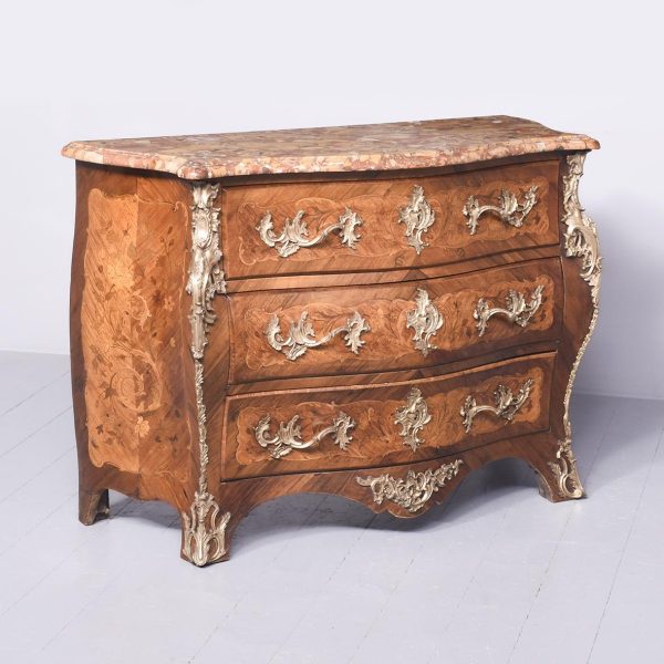 Circa 1890. A quality French bombe shaped marble topped commode in Louis XVI style. The heavy mottled pink marble top with elegant fore-edge, the bombe shaped commode with three drawers, which are smothered with marquetry cross-banding with extravagant rococo gilded brass escutcheons and handles. The fore-edges with pierced and chased mounts on the top with casting down the facing, the shaped gables with marquetry and beneath the bottom drawer is a shaped and deep frieze with a gilded mount and the chest rests on squat splayed feet with well-cast and pierced sabots.