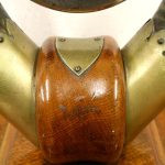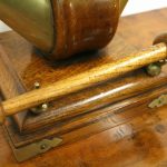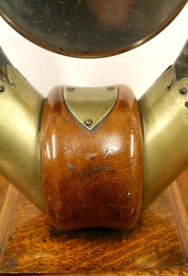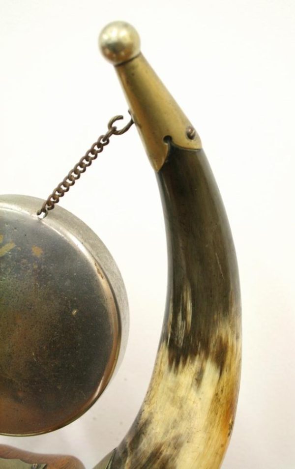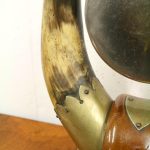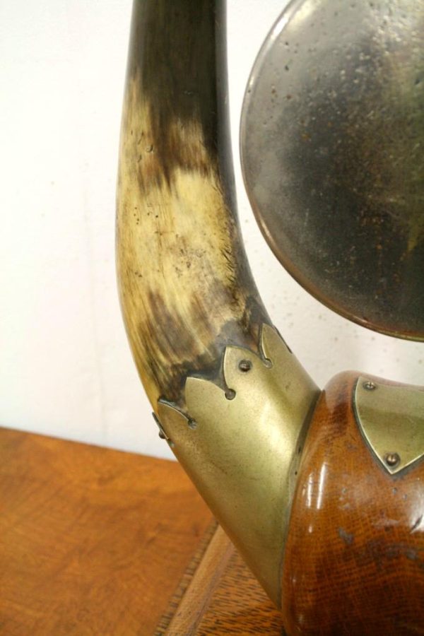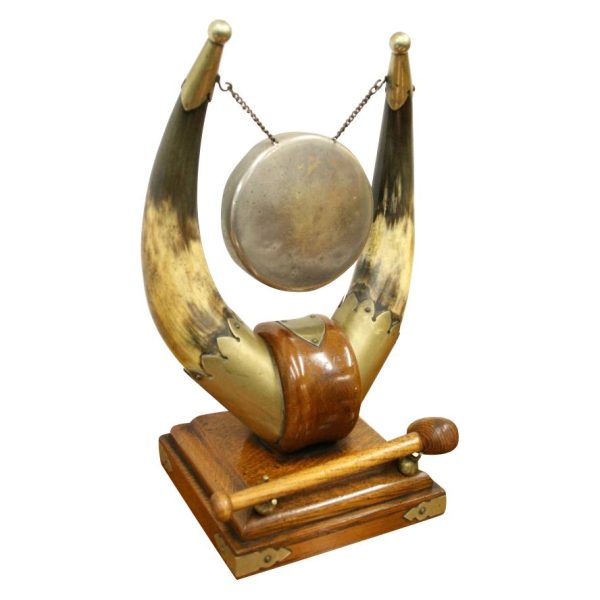 Circa 1900, unusual bovine, metal and oak table top dinner gong. The central circular gong is held in place by 2 chains attached to 2 curved EPNS finials. These surmount 2 cow horns, which are encased at the base in brass cladding with a stylised pattern on the top and a wrap around circular section of polished oak with a Heraldic shield on top of it (not engraved). This is attached to a raised oak plinth with an ogee moulded section and finishing on an enclosed base with brass corner straps. On the front there are 2 small upright arms which hold the beater.