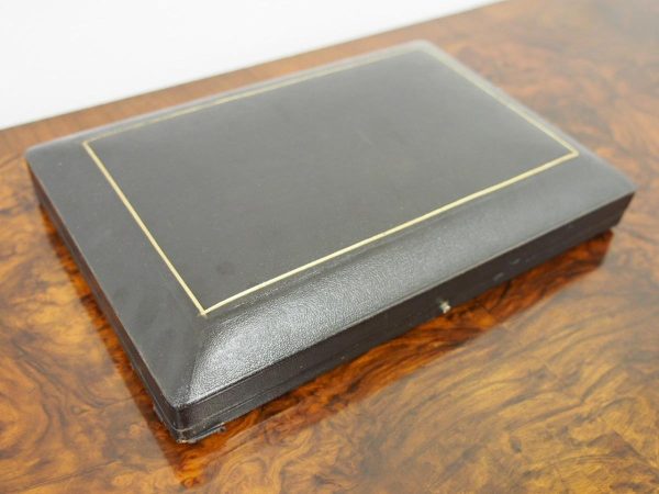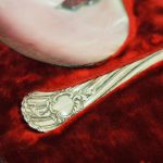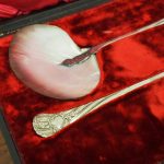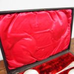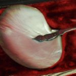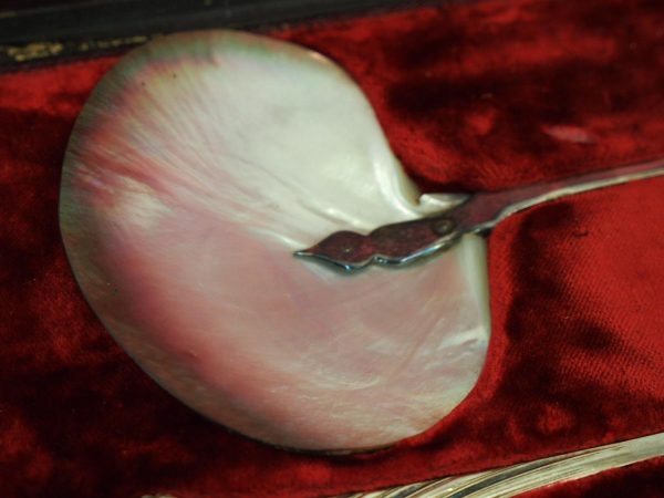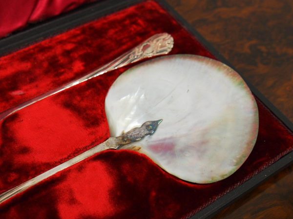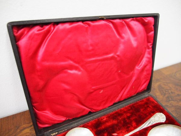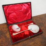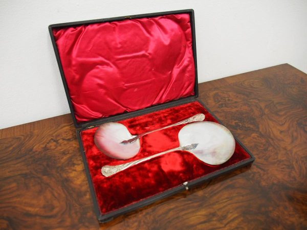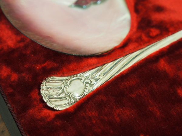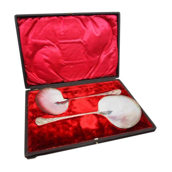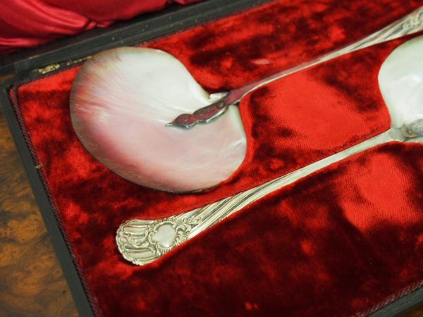 Circa 1900, boxed set of desert cutlery. With gilding to the top of the box opens to reveal a red velvet and red silk lining with 2 large serving spoons. The main part of the servers is made from Mother of Pearl and these are riveted to EPNS handles.  The handles are elegant and have been chased on both front and back with the makers label on the back.