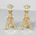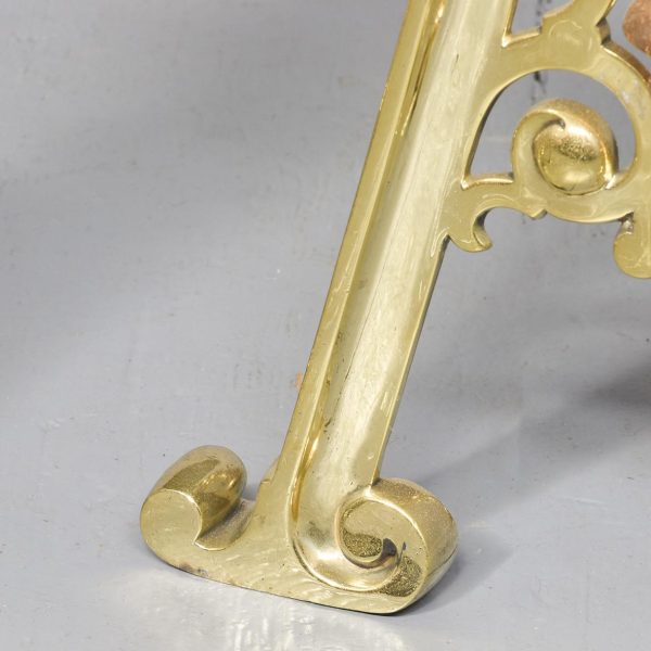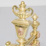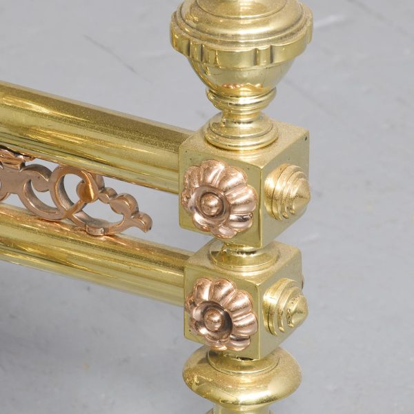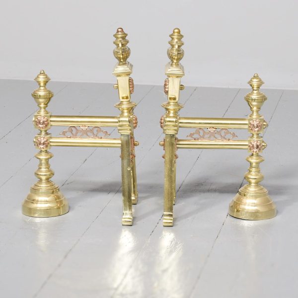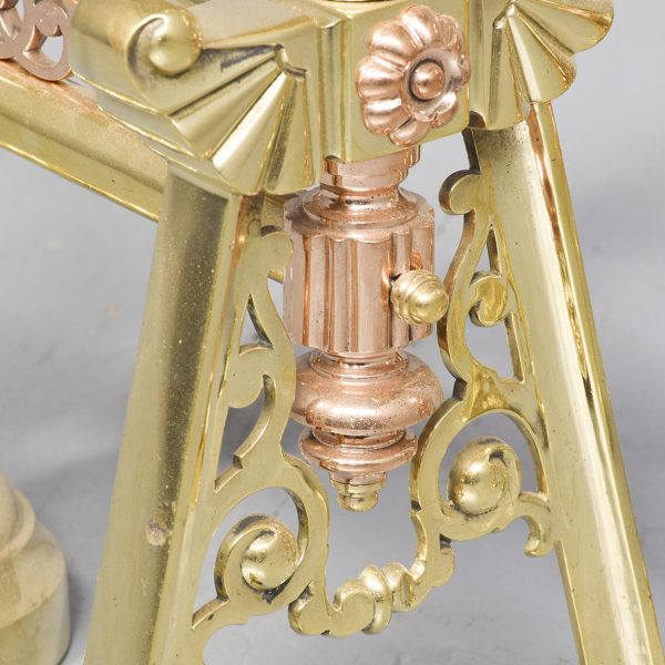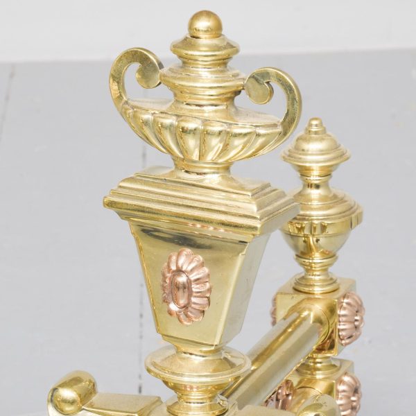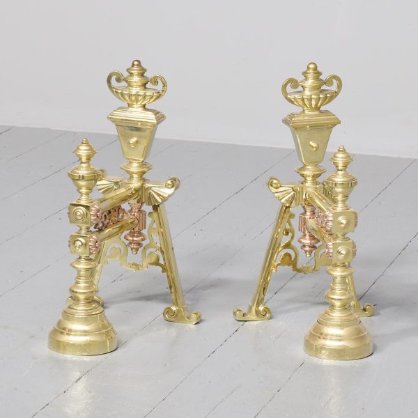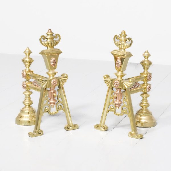 Circa 1880. An unusual pair of brass and copper Aesthetic movement fire dogs, surmounted by a fluted urn resting on a platform base with a copper flower head beneath. There is a further mixture of copper and brass throughout, to the front a pair of splayed legs finishing with rococo casting. Double arm with pierced copper in the center and a circular platform base at the back.